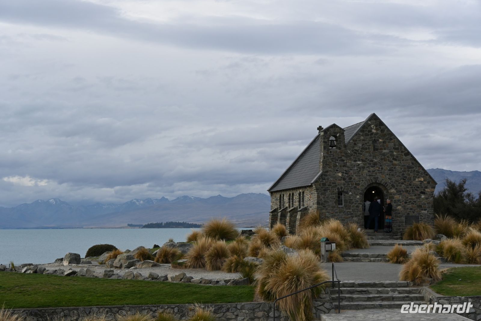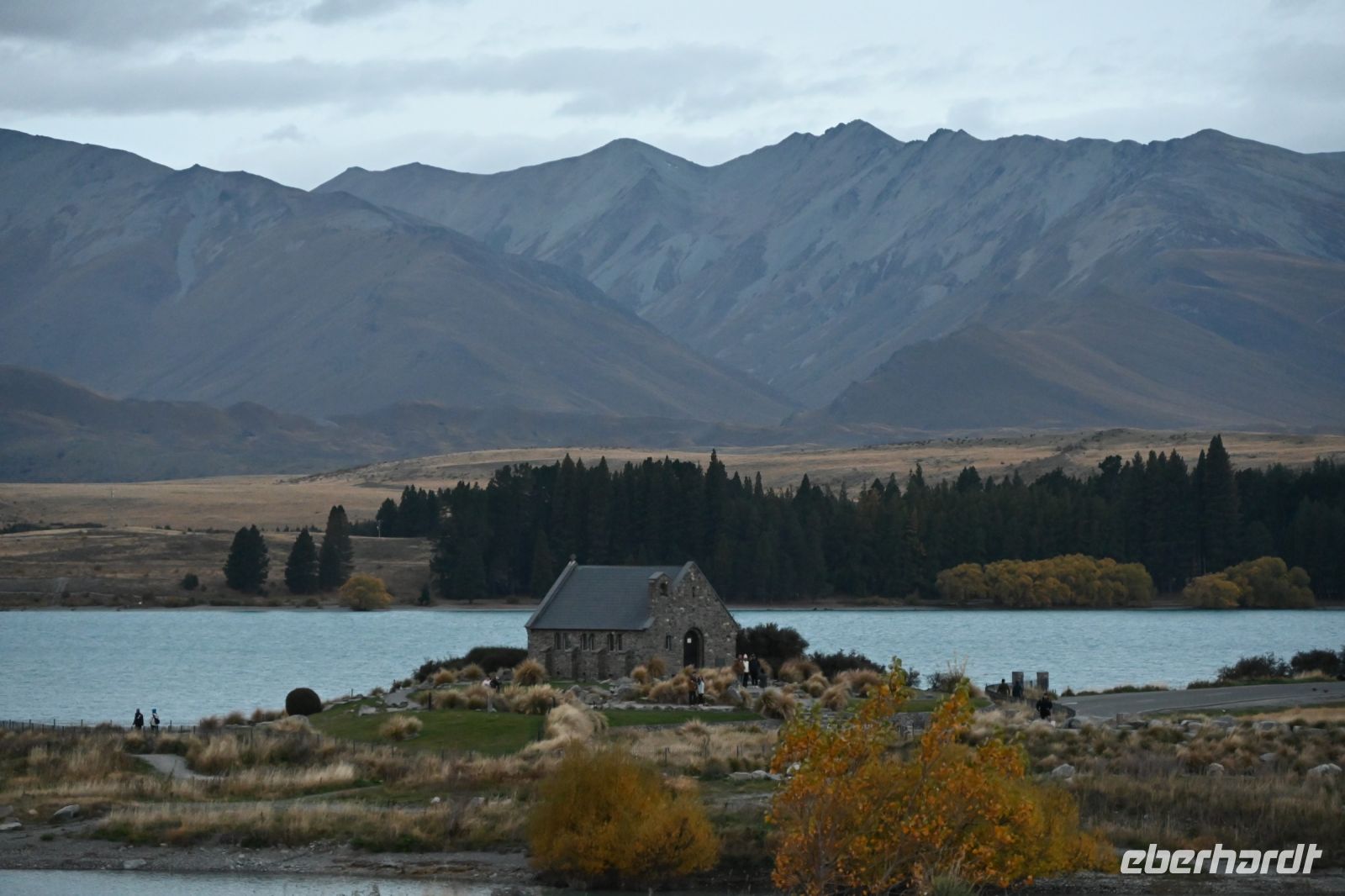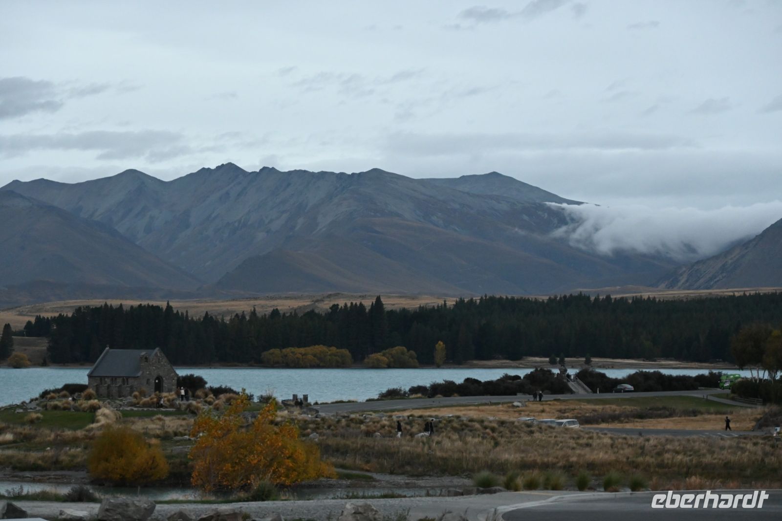Wir erreichen den Ort Lake Tekapo oder auch Tekapo Village genannt am Nachmittag. Die meistfotografierte Kirche des Landes steht hier. Eine kleine Kapelle am Seeufer direkt vor dem Bergpanorama. Da viele Touristen leider nicht die Regeln eines Gotteshauses befolgen konnten, wurde ein Zaun darum gebaut und eine Öffnung erfolgt nur bei Gottesdiensten oder vorher gebuchten Führungen. Da heute Ostersonntag ist, findet gerade ein Gottesdienst statt und die Kirche scheint bis auf den letzten Platz besetzt zu sein, einige Leute stehen sogar noch in der Tür.