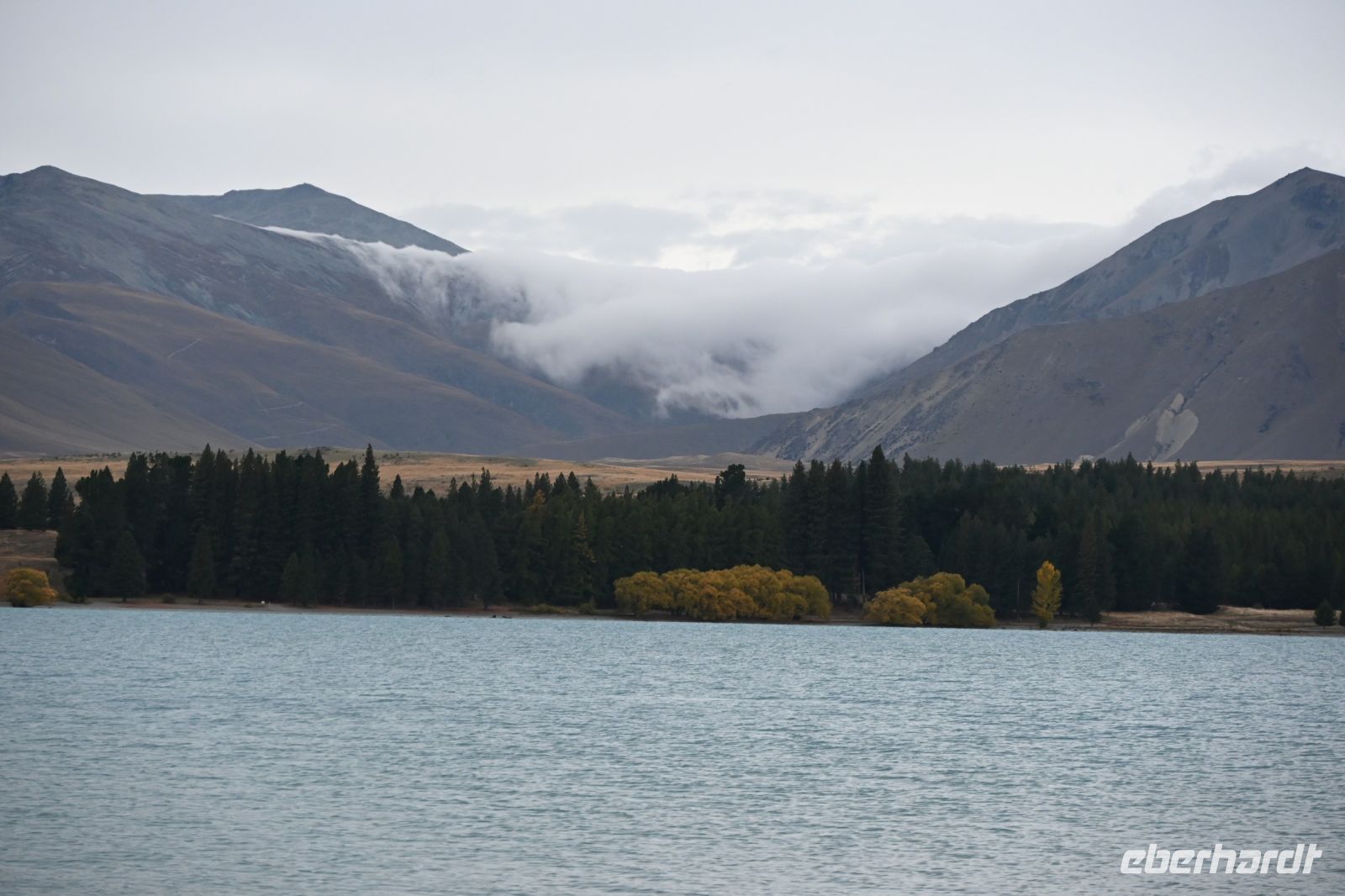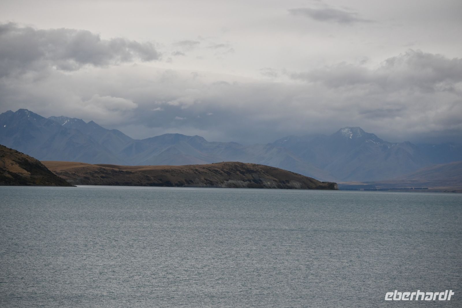 Roger fährt uns als erstes eine Runde durch die Gartenstadt Christchurch, in welche wir am letzten Tag unserer Rundreise zurückkehren werden. Die Stadt wurde 2011 von einem schweren Erdbeben stark zerstört und befindet sich noch immer im Wiederaufbau. Es gibt immer noch viele Freiflächen, auf denen früher Gebäude standen. Diese mussten auf Grund der schweren Schäden abgerissen werden. Neue Auflagen zum Schutz bei einem neuen Erdbeben erlauben zum Beispiel neuen Gebäuden eine maximale Höhe von sieben Stockwerken. Am heftigsten hat es die Kathedrale in der Stadtmitte getroffen, hier laufen weiterhin die Restaurationsarbeiten, ein Zeitpunkt der Fertigstellung ist noch ungewiss. Wir verlassen Christchurch am Flughafen, hier verlässt uns nun Helle auch endgültig und nimmt seinen Flieger zurück nach Hause. Nun müssen wir noch einige Kilometer bewältigen, um ins Landesinnere zu gelangen. Es geht auf die Hochebene, kurz vor den Südalpen. Die teilweise schneebedeckten Bergspitzen sind zwischen den Wolken immer wieder zu sehen. Jedoch stimmen uns die Aussichten nicht wirklich hoffnungsvoll. Am Nachmittag war eigentlich ein Flug über den Mt. Cook und die Gletscher geplant, dieser muss leider abgesagt werden.