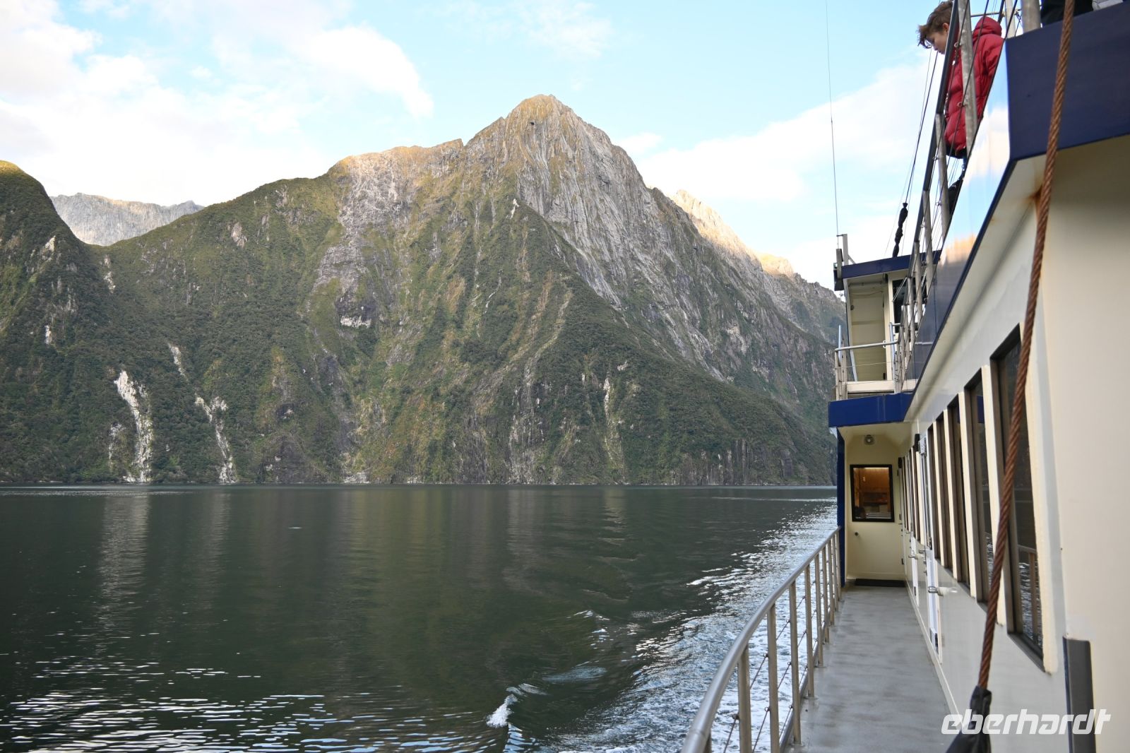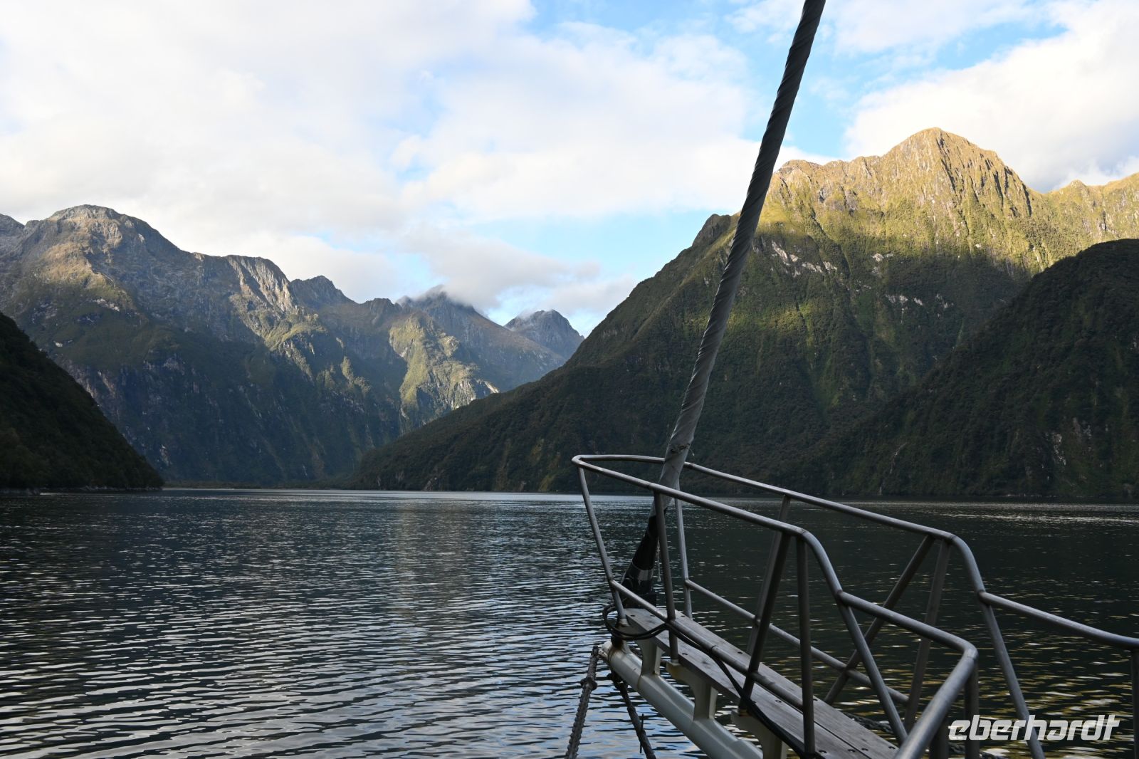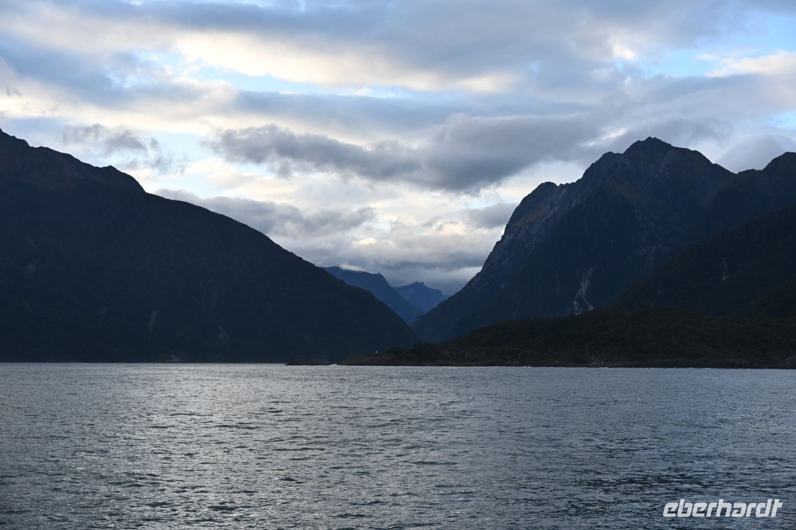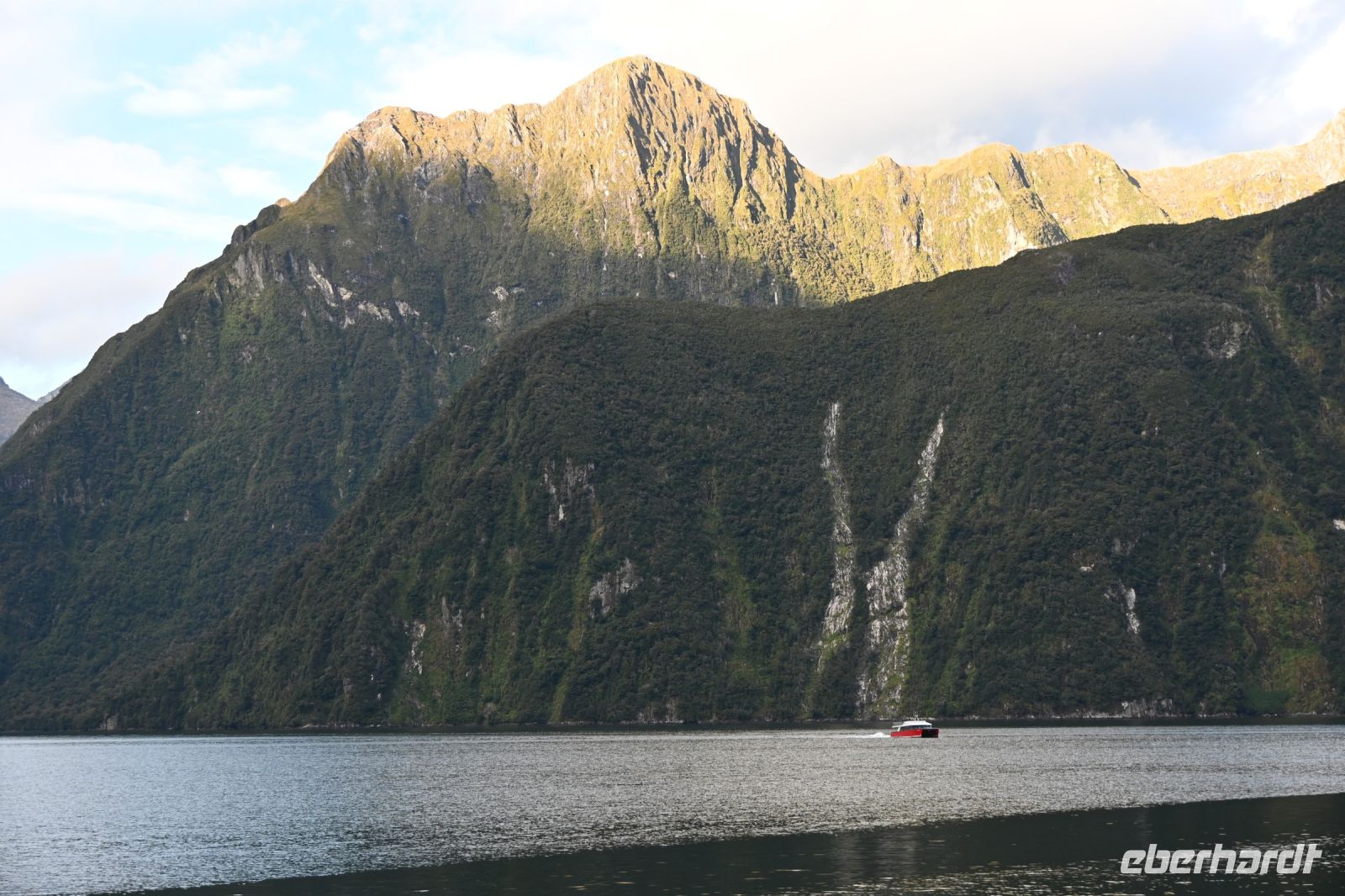 Nach einer ruhigen Nacht werden von der Crew wir wieder auf dem Deck erwartet. Für den ersten kleinen Hunger gibt es Müsli, Obst und Saft. So sind erstmal alle Gäste beschäftigt und der Warmanteil kann vorbereitet werden. Wir werden mit allerhand Köstlichkeiten verwöhnt und schon der Anker eingeholt und wir nehmen wieder Fahrt aus. Entlang des Fjords sehen wir immer wieder kleine Wasserfälle und eine wundervolle Natur. Wir fahren langsam in Richtung Tasmanisches Meer. Auf dem offenen Meer angekommen weht ein starker Wind und der Wellengang ist auch nicht zu unterschätzen. Wir genießen die Zeit mit dem schönen Ausblick und dem frischen Wind im Gesicht. Gegen neun Uhr laufen wir wieder im kleinen Hafen ein, noch ist es hier ruhig. Auf dem Weg zurück nach Te Anau kommen uns wieder viele Touristenbusse entgegen, die eine Ahnung geben, was hier am Tag los sein muss. Was uns leider verwehrt bleibt, ist ein Blick auf die hier lebenden Keas. Diese Bergvögel gelten als besonders clever, aber sind gegenüber Touristen auch gern diebisch unterwegs.