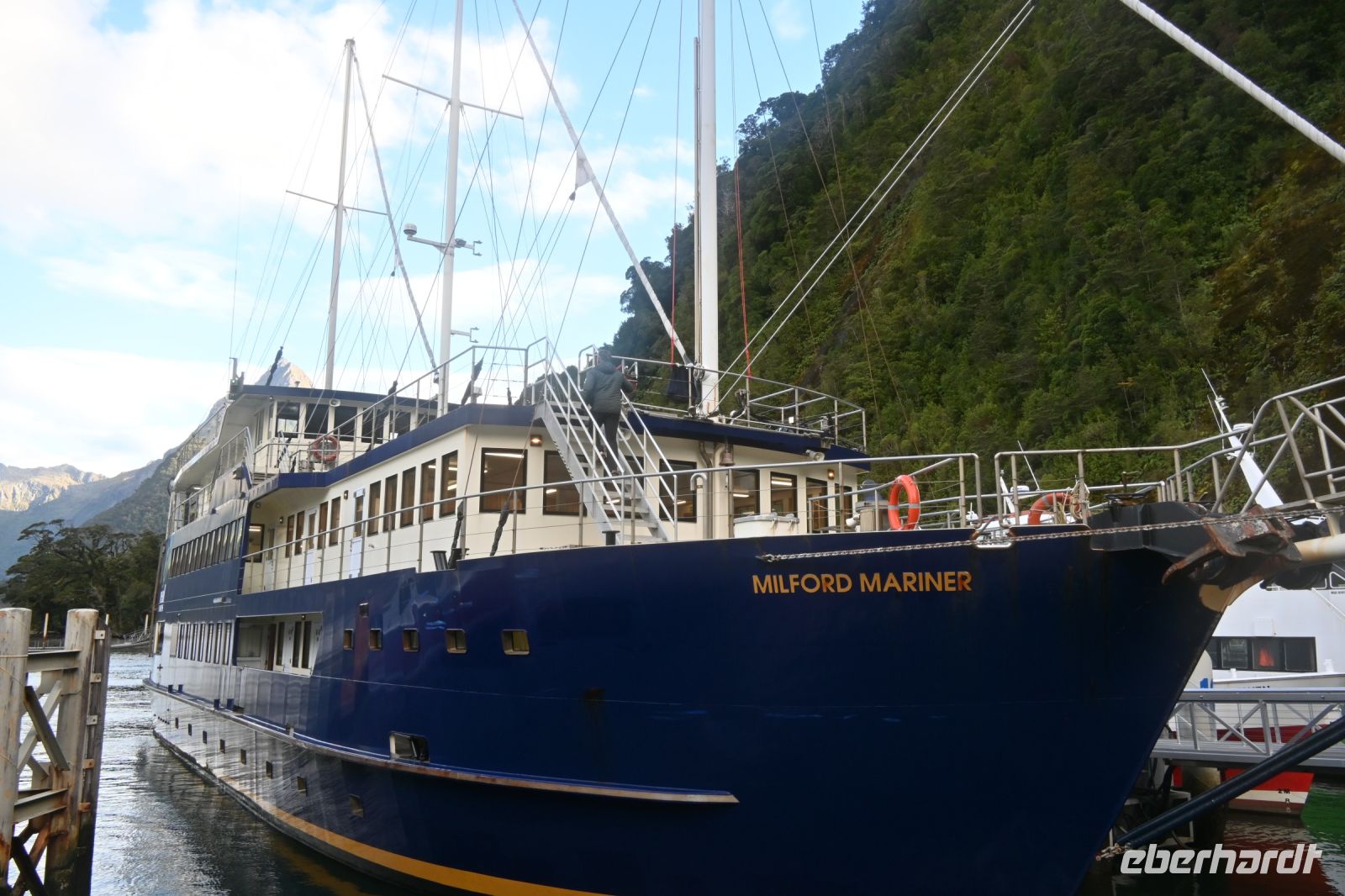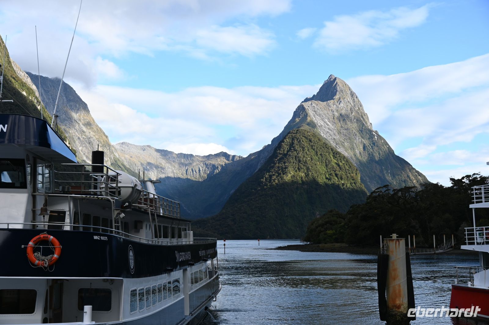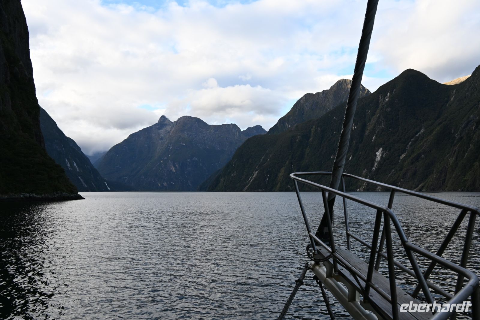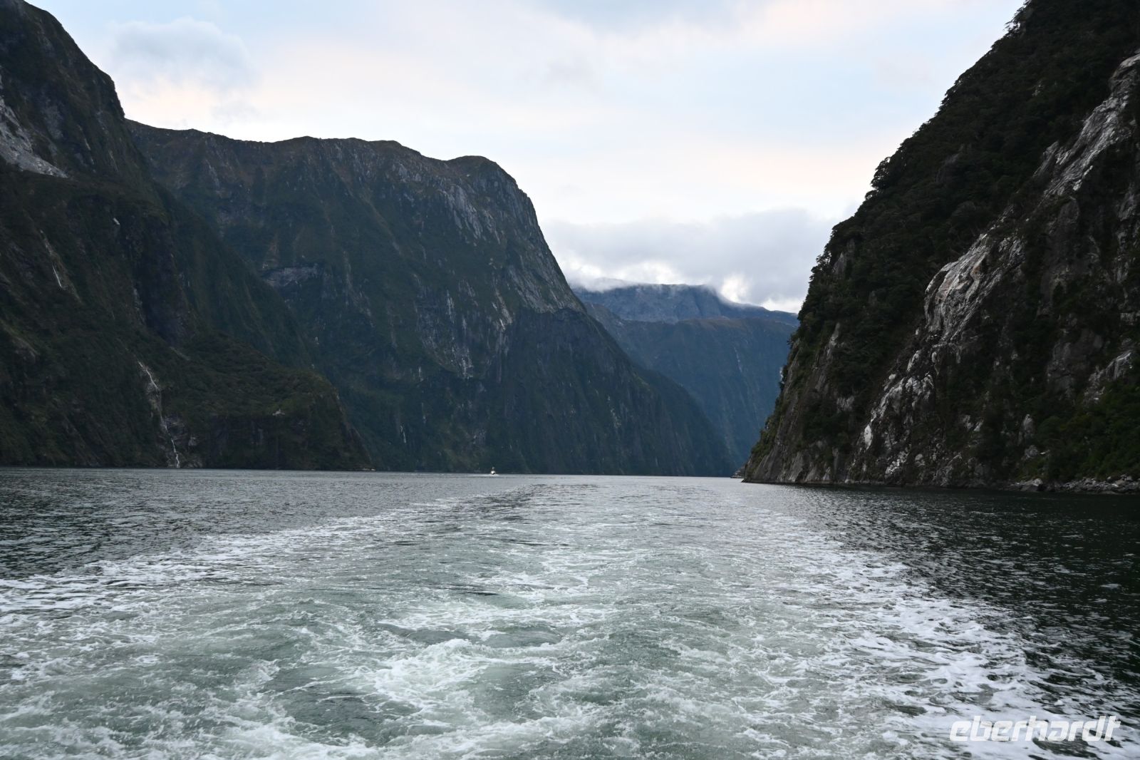 Nach einer ruhigen Nacht werden von der Crew wir wieder auf dem Deck erwartet. Für den ersten kleinen Hunger gibt es Müsli, Obst und Saft. So sind erstmal alle Gäste beschäftigt und der Warmanteil kann vorbereitet werden. Wir werden mit allerhand Köstlichkeiten verwöhnt und schon der Anker eingeholt und wir nehmen wieder Fahrt aus. Entlang des Fjords sehen wir immer wieder kleine Wasserfälle und eine wundervolle Natur. Wir fahren langsam in Richtung Tasmanisches Meer. Auf dem offenen Meer angekommen weht ein starker Wind und der Wellengang ist auch nicht zu unterschätzen. Wir genießen die Zeit mit dem schönen Ausblick und dem frischen Wind im Gesicht. Gegen neun Uhr laufen wir wieder im kleinen Hafen ein, noch ist es hier ruhig. Auf dem Weg zurück nach Te Anau kommen uns wieder viele Touristenbusse entgegen, die eine Ahnung geben, was hier am Tag los sein muss. Was uns leider verwehrt bleibt, ist ein Blick auf die hier lebenden Keas. Diese Bergvögel gelten als besonders clever, aber sind gegenüber Touristen auch gern diebisch unterwegs.
