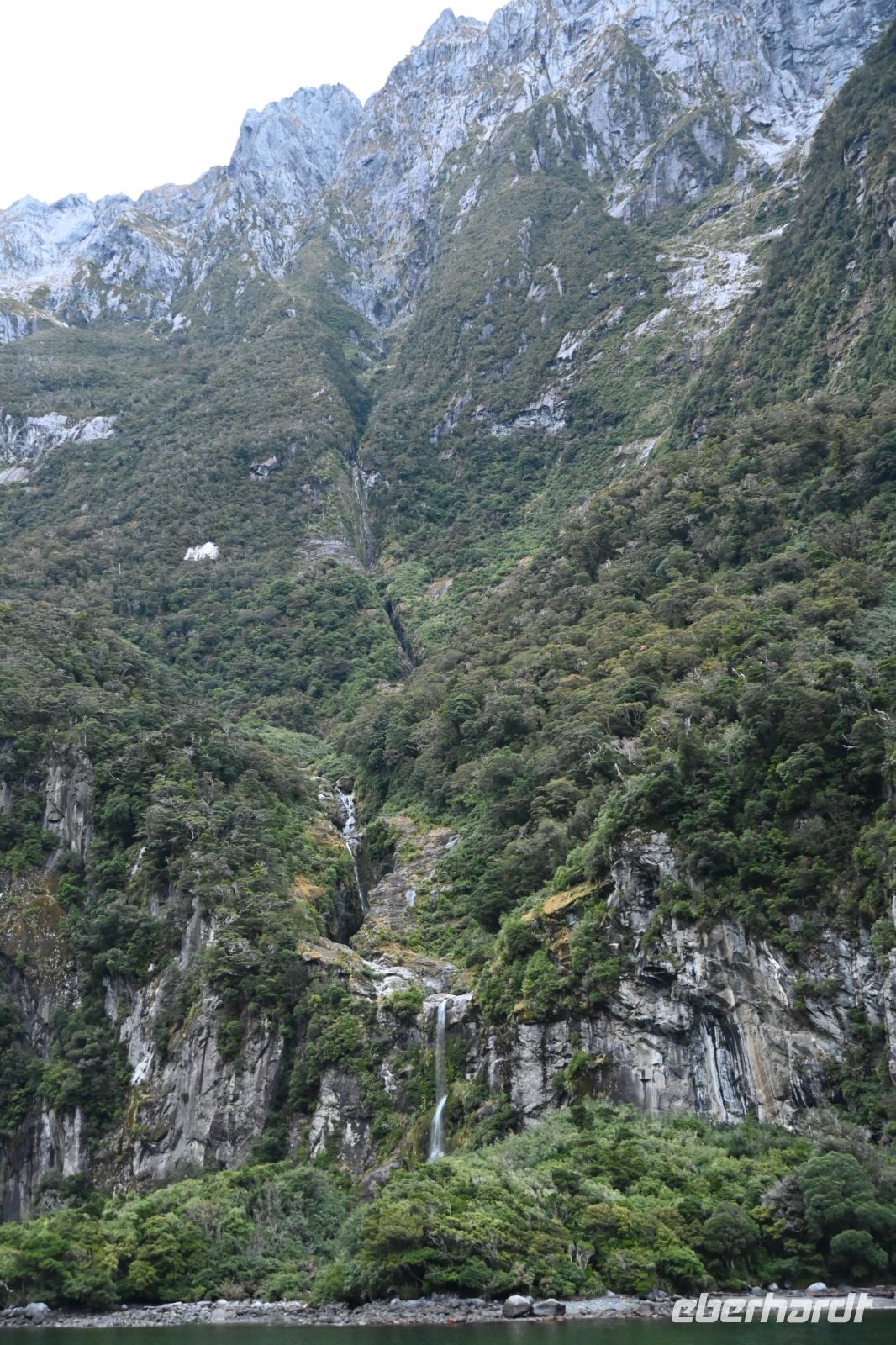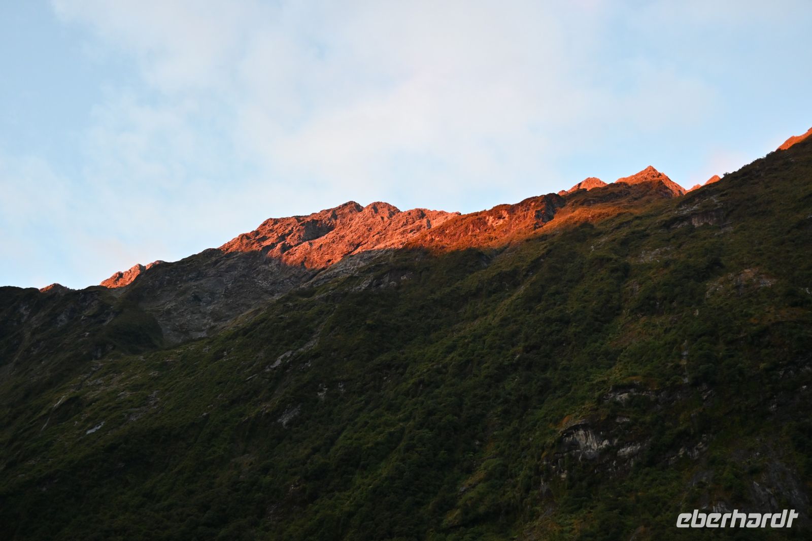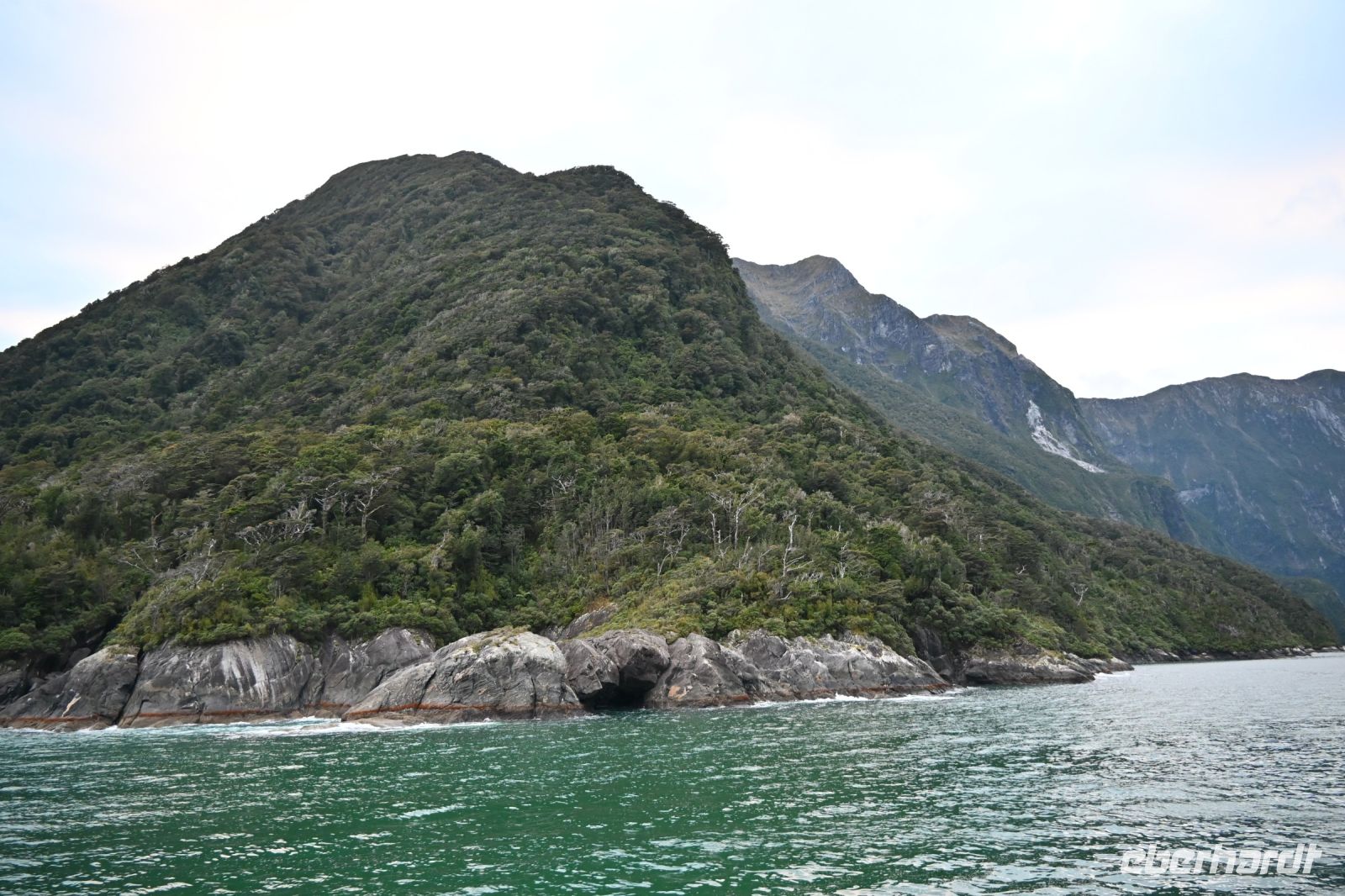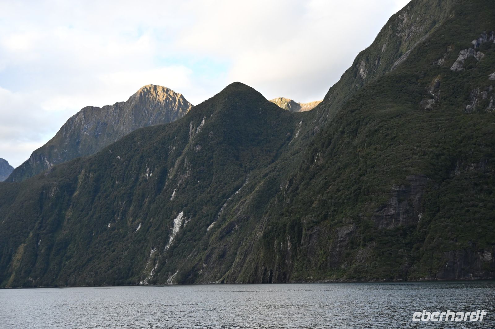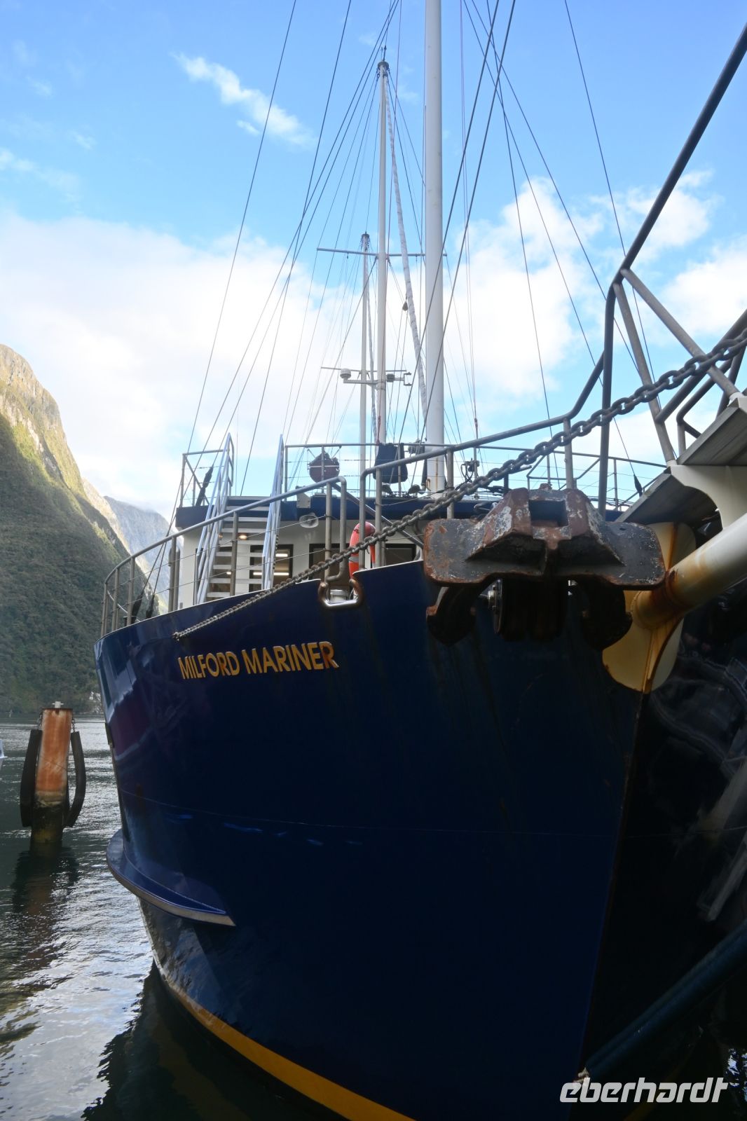 Nach einer ruhigen Nacht werden von der Crew wir wieder auf dem Deck erwartet. Für den ersten kleinen Hunger gibt es Müsli, Obst und Saft. So sind erstmal alle Gäste beschäftigt und der Warmanteil kann vorbereitet werden. Wir werden mit allerhand Köstlichkeiten verwöhnt und schon der Anker eingeholt und wir nehmen wieder Fahrt aus. Entlang des Fjords sehen wir immer wieder kleine Wasserfälle und eine wundervolle Natur. Wir fahren langsam in Richtung Tasmanisches Meer. Auf dem offenen Meer angekommen weht ein starker Wind und der Wellengang ist auch nicht zu unterschätzen. Wir genießen die Zeit mit dem schönen Ausblick und dem frischen Wind im Gesicht. Gegen neun Uhr laufen wir wieder im kleinen Hafen ein, noch ist es hier ruhig. Auf dem Weg zurück nach Te Anau kommen uns wieder viele Touristenbusse entgegen, die eine Ahnung geben, was hier am Tag los sein muss. Was uns leider verwehrt bleibt, ist ein Blick auf die hier lebenden Keas. Diese Bergvögel gelten als besonders clever, aber sind gegenüber Touristen auch gern diebisch unterwegs.