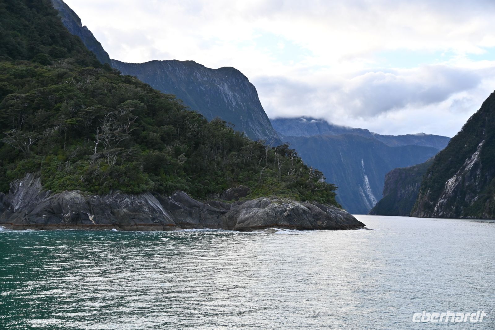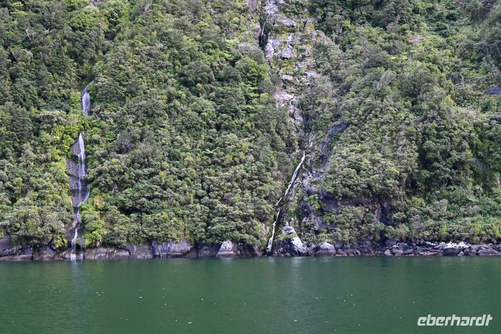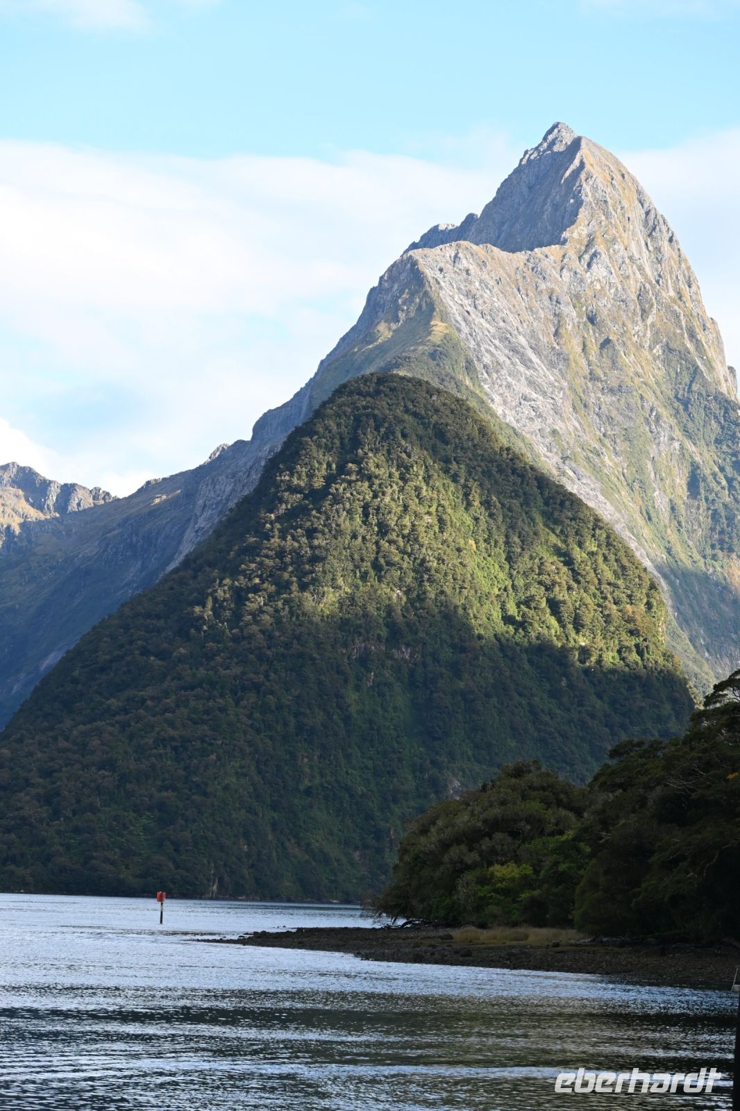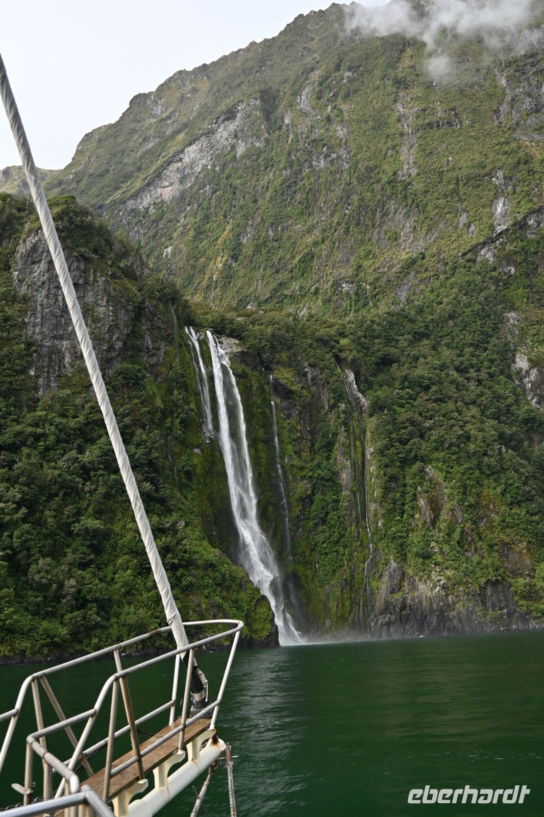 Nach einer ruhigen Nacht werden von der Crew wir wieder auf dem Deck erwartet. Für den ersten kleinen Hunger gibt es Müsli, Obst und Saft. So sind erstmal alle Gäste beschäftigt und der Warmanteil kann vorbereitet werden. Wir werden mit allerhand Köstlichkeiten verwöhnt und schon der Anker eingeholt und wir nehmen wieder Fahrt aus. Entlang des Fjords sehen wir immer wieder kleine Wasserfälle und eine wundervolle Natur. Wir fahren langsam in Richtung Tasmanisches Meer. Auf dem offenen Meer angekommen weht ein starker Wind und der Wellengang ist auch nicht zu unterschätzen. Wir genießen die Zeit mit dem schönen Ausblick und dem frischen Wind im Gesicht. Gegen neun Uhr laufen wir wieder im kleinen Hafen ein, noch ist es hier ruhig. Auf dem Weg zurück nach Te Anau kommen uns wieder viele Touristenbusse entgegen, die eine Ahnung geben, was hier am Tag los sein muss. Was uns leider verwehrt bleibt, ist ein Blick auf die hier lebenden Keas. Diese Bergvögel gelten als besonders clever, aber sind gegenüber Touristen auch gern diebisch unterwegs.