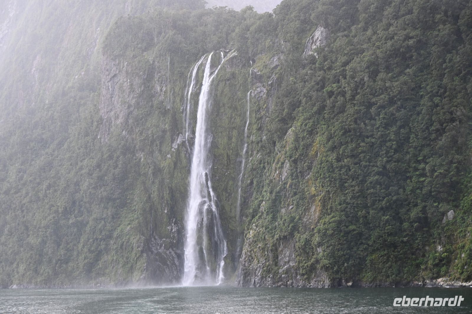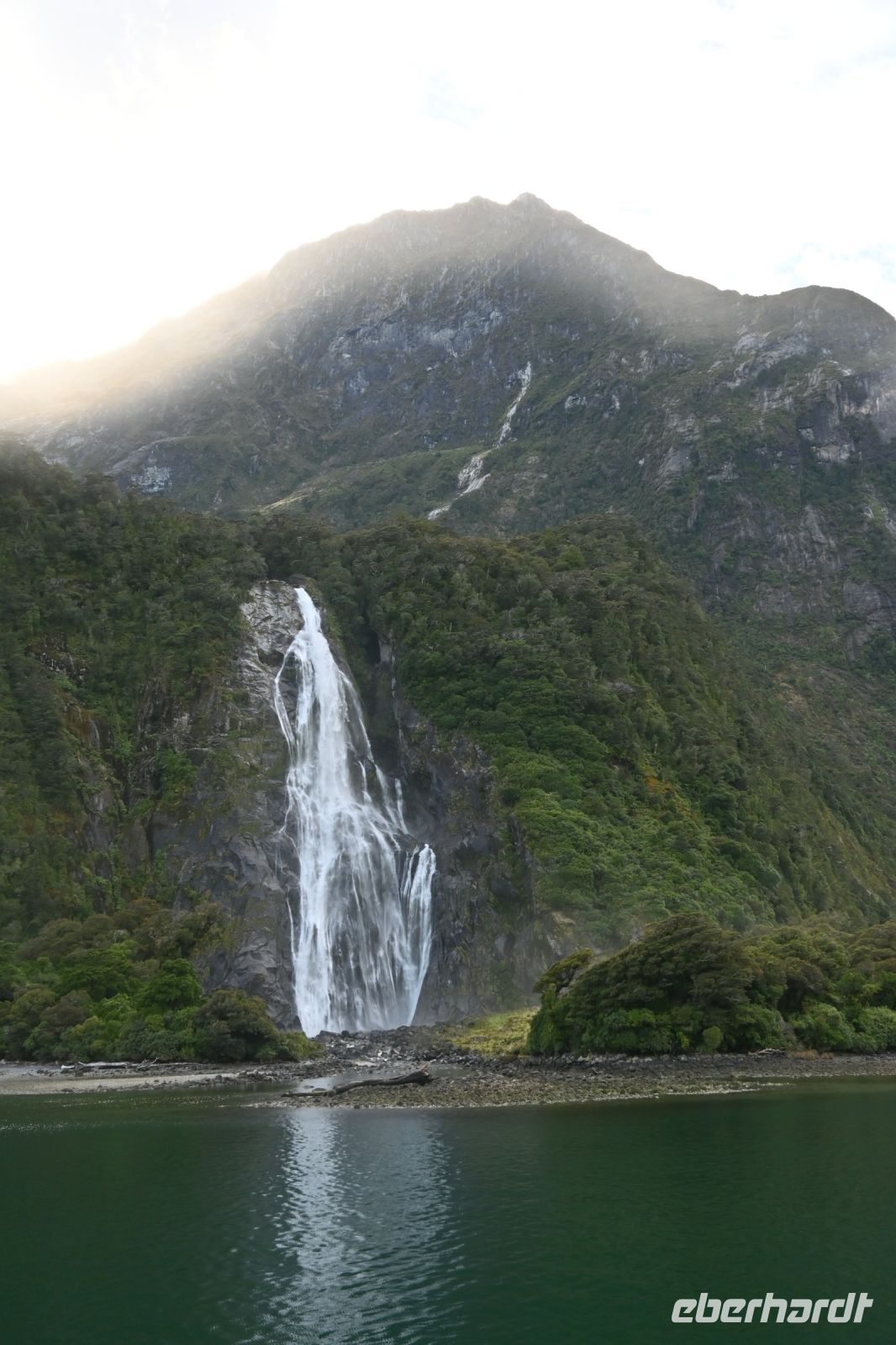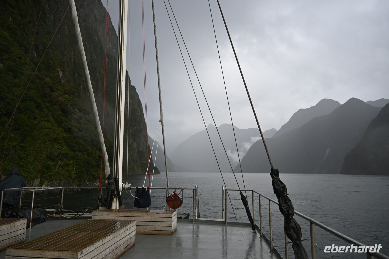 Heute legen wir eine der größten Strecken mit dem Bus zurück. Wir verlassen die Ostküste und unser Weg führt uns quer durchs Land bis an die Westküste. Begleitet werden wir die meiste Zeit von „flüssigen Sonnenstrahlen“. So nennt Roger den stetig fallenden Regen und versucht uns so etwas aufzumuntern. Doch so ist es eben im Herbst. Wir haben heute auch nur einen Termin, aber zu diesem müssen wir pünktlich sein. Unser Weg führt uns in den größten Nationalpark Neuseelands, den Fiordland Nationalpark und damit zum einzigen durch eine Straße erreichbaren Fjord hier im Land. Was uns erwartet ist einzigartig. Der Fjord wurde durch eine Straße und einen Tunnel, welcher erst 1954 eröffnet wurde, erreichbar gemacht. Es gibt zwei Unterkünfte und einige Schiffsanleger. Das Hauptgeschäft wird hier tagsüber gemacht. Unzählige Reisebusse fahren täglich von Queenstown und Te Anau an den Fjord für eine dreistündige Schiffsfahrt, die Gäste sind dafür teilweise zwölf Stunden unterwegs. Diesen Stress wollen wir uns nicht machen. Wir erreichen den Anleger pünktlich am Nachmittag, als die vielen Touristenbusse schon abgereist sind und begeben uns an Bord der Milford Mariner. Hier sind für unsere Gruppe Kabinen und ein RundumSorglos-Paket gebucht. Kaum sind wir an Bord, legt das Schiff schon ab. Für die Nacht ankern wir in einer ruhigen Bucht. Hier werden zum Zeitvertreib noch einige Aktivitäten angeboten, wir können Kajak fahren oder eine Runde mit dem Tenderboot mitfahren. Die ganz Hartgesottenen wagen einen Sprung in das 13° C warme Wasser. Da das Wetter noch immer etwas trüb ist, bleiben wir mit einem Glas Bier oder Wein an Bord. So lässt es sich leben. Nachdem es dunkel geworden ist, wird uns ein leckeres Abendessen serviert. Wer möchte kann im Anschluss noch den Vortrag über den Fjord lauschen, es werden beeindruckende Bilder gezeigt und viel über die Geschichte und Tierwelt hier erzählt. Vom leichten Schwanken sind die meisten aber müde und fallen in ihre Betten.