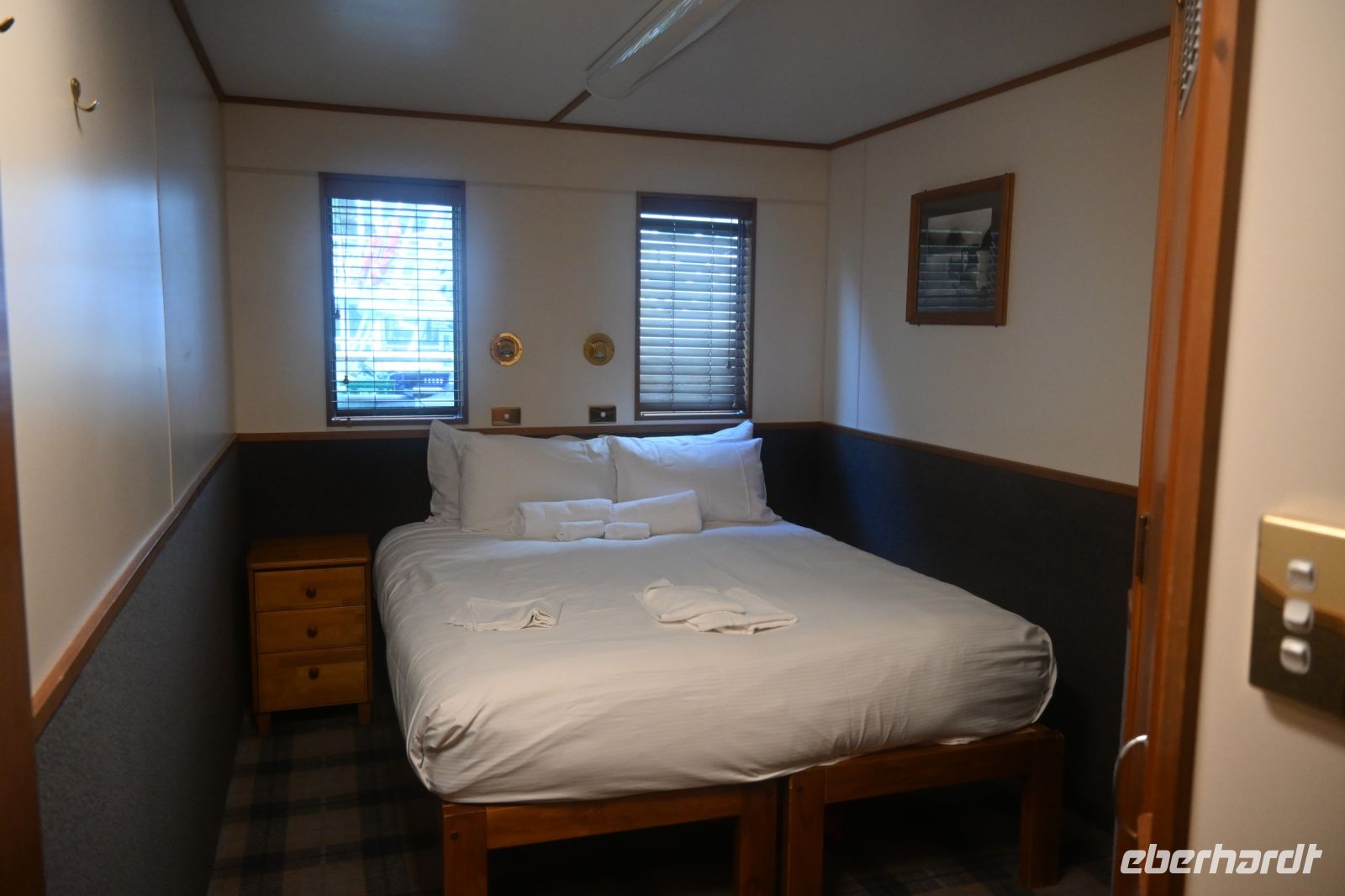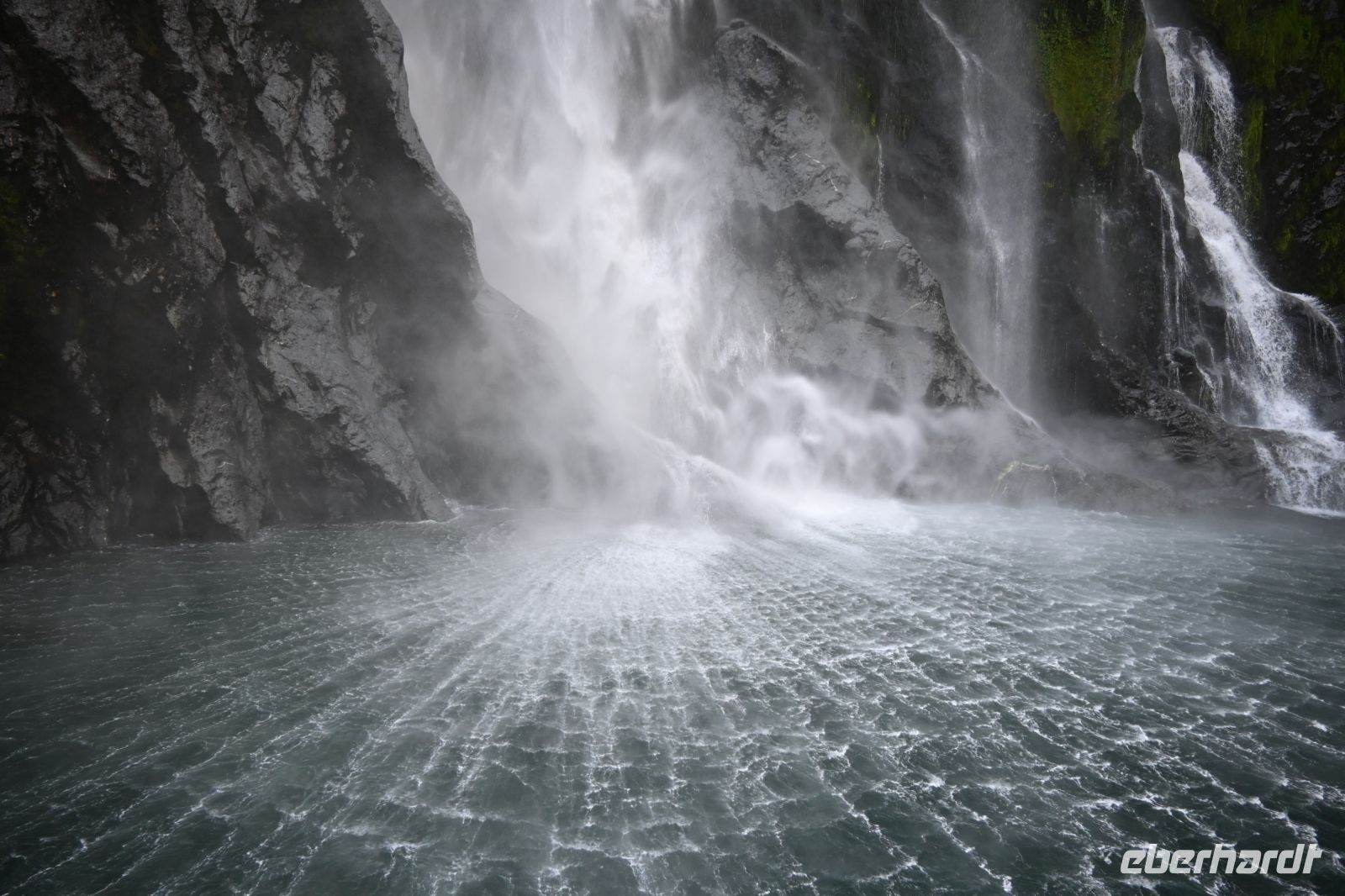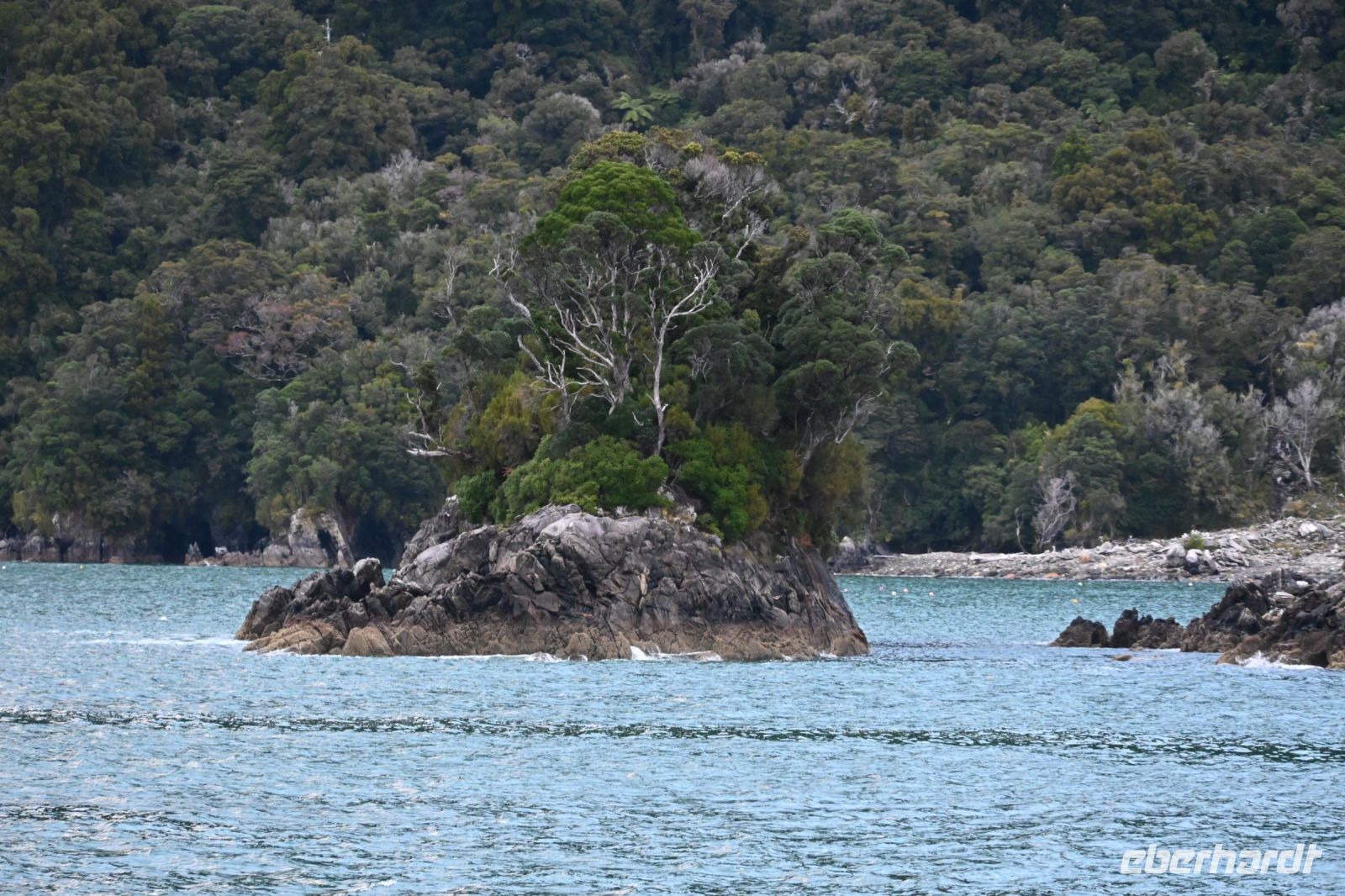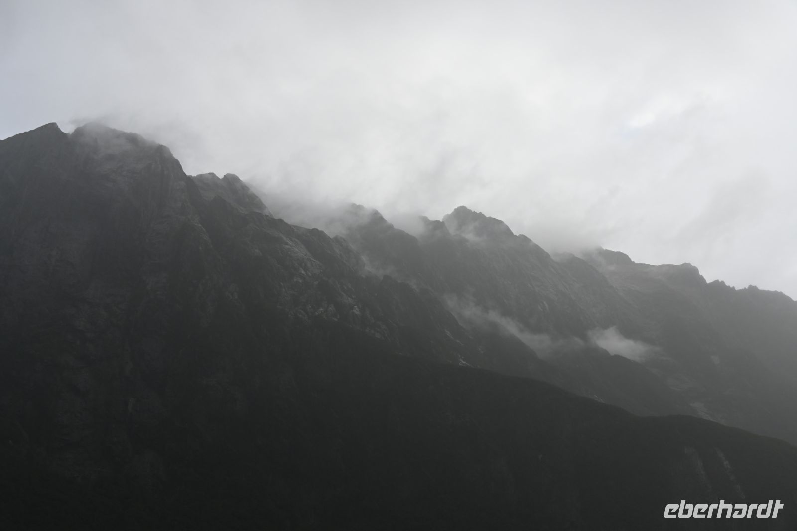 Heute legen wir eine der größten Strecken mit dem Bus zurück. Wir verlassen die Ostküste und unser Weg führt uns quer durchs Land bis an die Westküste. Begleitet werden wir die meiste Zeit von „flüssigen Sonnenstrahlen“. So nennt Roger den stetig fallenden Regen und versucht uns so etwas aufzumuntern. Doch so ist es eben im Herbst. Wir haben heute auch nur einen Termin, aber zu diesem müssen wir pünktlich sein. Unser Weg führt uns in den größten Nationalpark Neuseelands, den Fiordland Nationalpark und damit zum einzigen durch eine Straße erreichbaren Fjord hier im Land. Was uns erwartet ist einzigartig. Der Fjord wurde durch eine Straße und einen Tunnel, welcher erst 1954 eröffnet wurde, erreichbar gemacht. Es gibt zwei Unterkünfte und einige Schiffsanleger. Das Hauptgeschäft wird hier tagsüber gemacht. Unzählige Reisebusse fahren täglich von Queenstown und Te Anau an den Fjord für eine dreistündige Schiffsfahrt, die Gäste sind dafür teilweise zwölf Stunden unterwegs. Diesen Stress wollen wir uns nicht machen. Wir erreichen den Anleger pünktlich am Nachmittag, als die vielen Touristenbusse schon abgereist sind und begeben uns an Bord der Milford Mariner. Hier sind für unsere Gruppe Kabinen und ein RundumSorglos-Paket gebucht. Kaum sind wir an Bord, legt das Schiff schon ab. Für die Nacht ankern wir in einer ruhigen Bucht. Hier werden zum Zeitvertreib noch einige Aktivitäten angeboten, wir können Kajak fahren oder eine Runde mit dem Tenderboot mitfahren. Die ganz Hartgesottenen wagen einen Sprung in das 13° C warme Wasser. Da das Wetter noch immer etwas trüb ist, bleiben wir mit einem Glas Bier oder Wein an Bord. So lässt es sich leben. Nachdem es dunkel geworden ist, wird uns ein leckeres Abendessen serviert. Wer möchte kann im Anschluss noch den Vortrag über den Fjord lauschen, es werden beeindruckende Bilder gezeigt und viel über die Geschichte und Tierwelt hier erzählt. Vom leichten Schwanken sind die meisten aber müde und fallen in ihre Betten.
