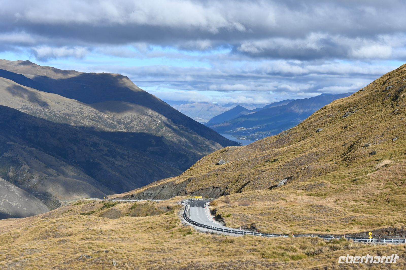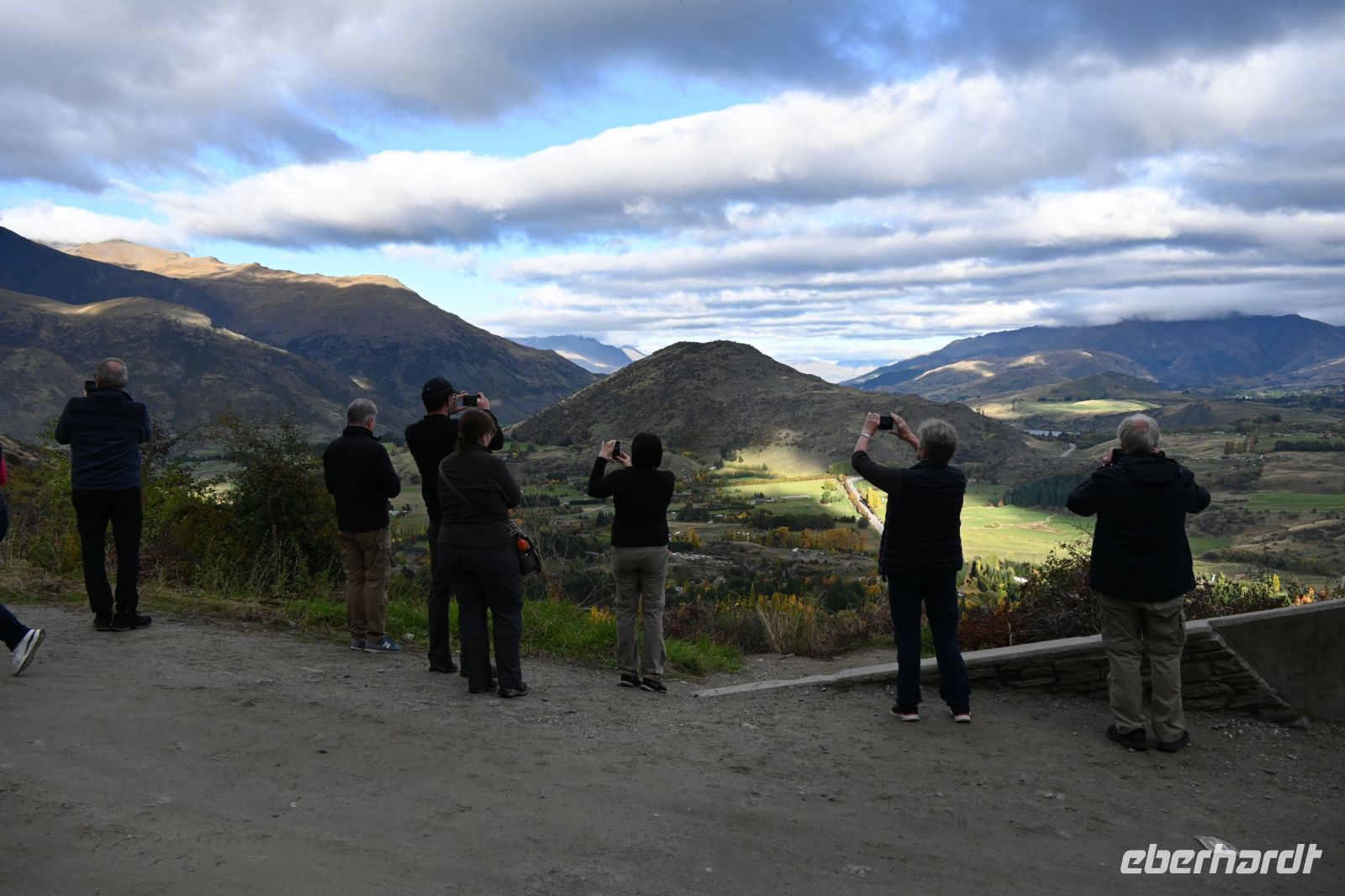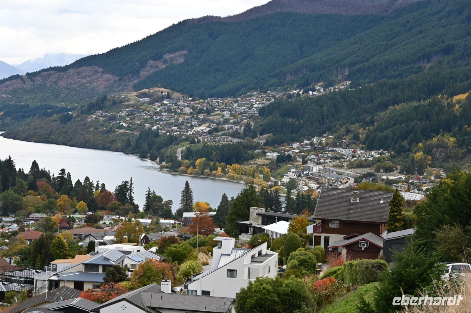 Am späten Nachmittag erreichen wir die adrenalinreichste Stadt von Neuseeland – willkommen in Queenstown. Die Stadt liegt umgeben von Bergen am Lake Wakatipu und bietet vor Allem Sportlern die ein oder andere Möglichkeit zur Betätigung. Bis zu 400 Tage könnte man hier verbringen und an jedem Tag etwas anderes erleben. Roger erzählt uns, dass der Erfinder des Bungeesprungs von hier kommt und hier der Sport auch zum ersten Mal kommerziell angeboten wurde. Die vorherige Probe fand am Eiffelturm in einer Nacht und Nebelaktion statt. Hier fuhren die beiden Erfinder am Abend hoch und versteckten sich auf der Plattform. Am Morgen wagten sie dann den Sprung der auch von Passanten beobachtet wurden.