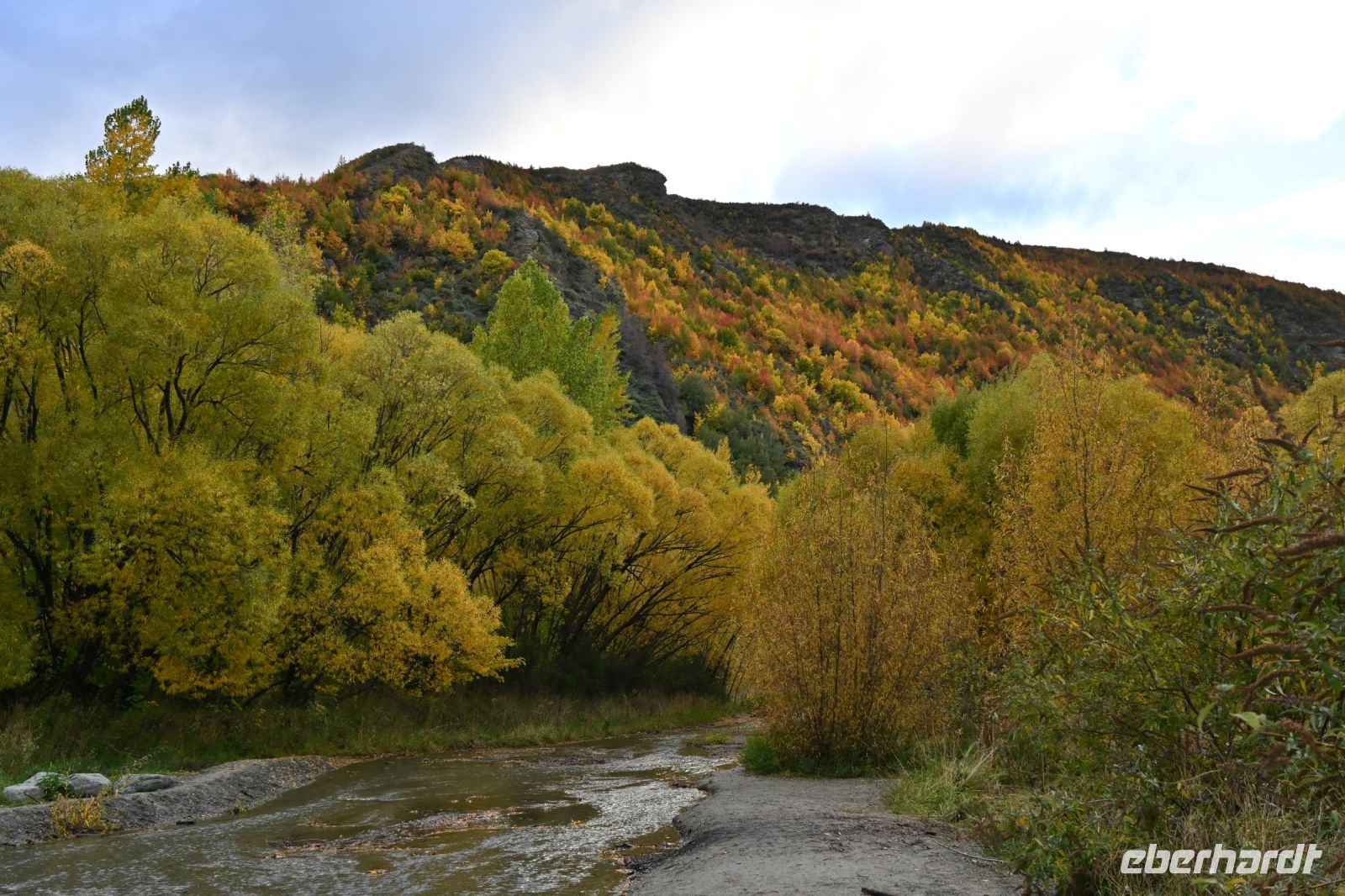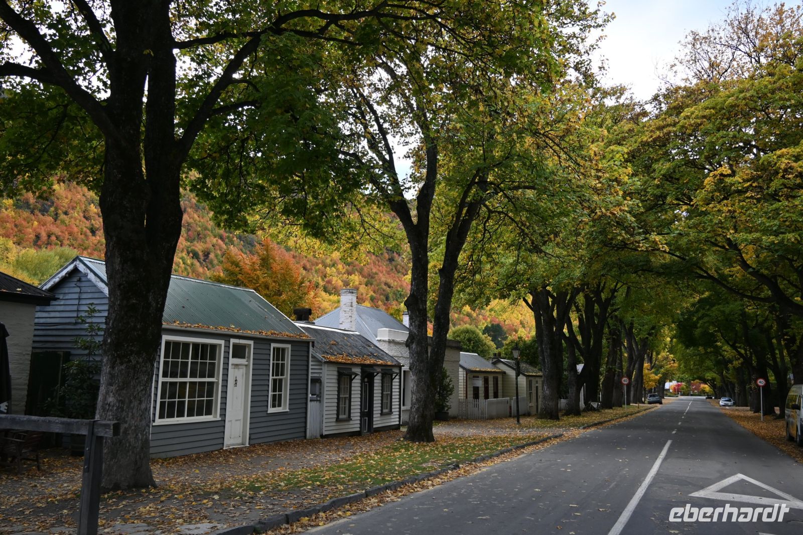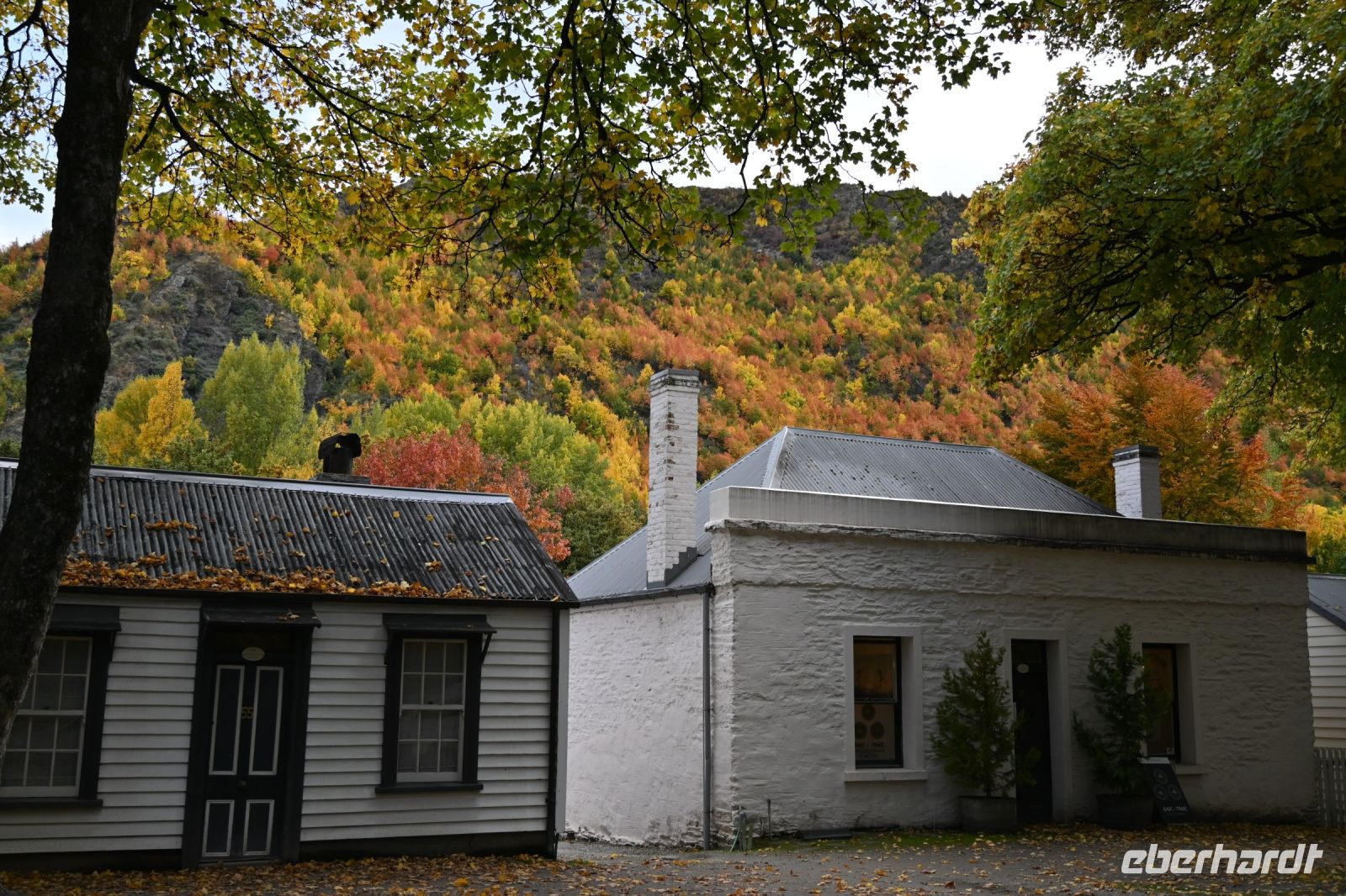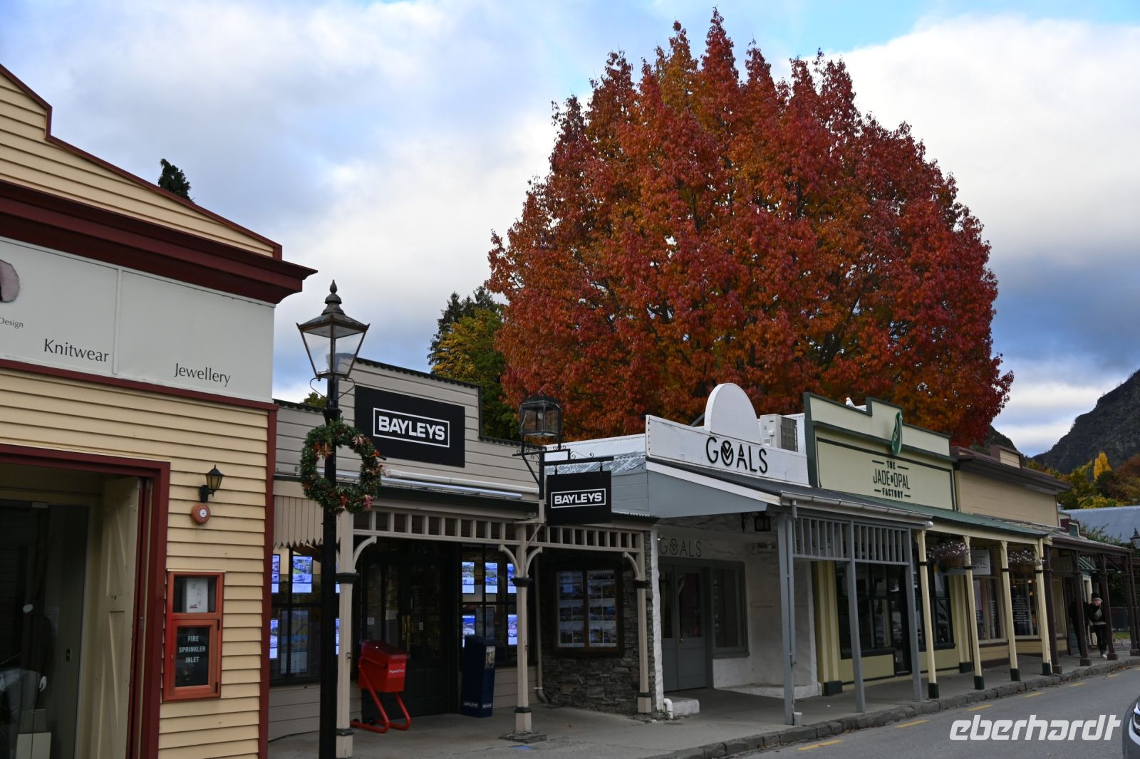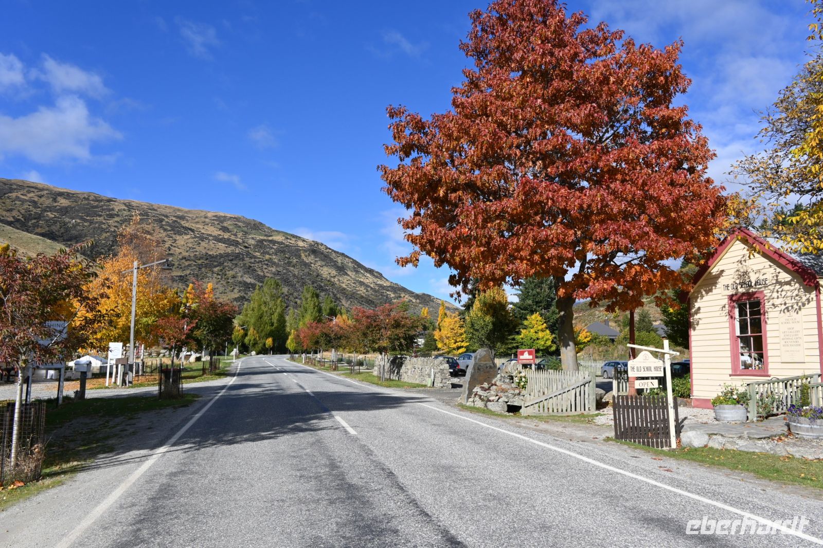 Bei strahlendem Sonnenschein verabschieden wir uns von Queenstown. Leider mussten wir uns auch von Roger verabschieden. Seine Rückenschmerzen sind während der gemeinsamen Reise schlimmer geworden und er musste sich in ärztliche Behandlung geben. Dank der organisierenden Agentur vor Ort, war schnell ein Ersatz gefunden und ab heute begleitet und Hampi. Er ist Schweizer und wohnt und arbeitet schon viele Jahre in Neuseeland. Schon auf den ersten Metern merken wir, er kennt sich auch super aus. Bei Sonnenschein wirken die aktuellen Herbstfarben der Laubbäume noch besser und unseren ersten Stopp legen wir in Arrow-Town ein. Das ehemalige Goldgräberdorf liegt noch ganz verschlafen, so können wir schöne Fotos machen. Im gleichnamigen Fluss wurde hier früher Gold geschürft. Wir haben kein Glück, mit dem bloßen Auge ist hier heute nix zu finden.