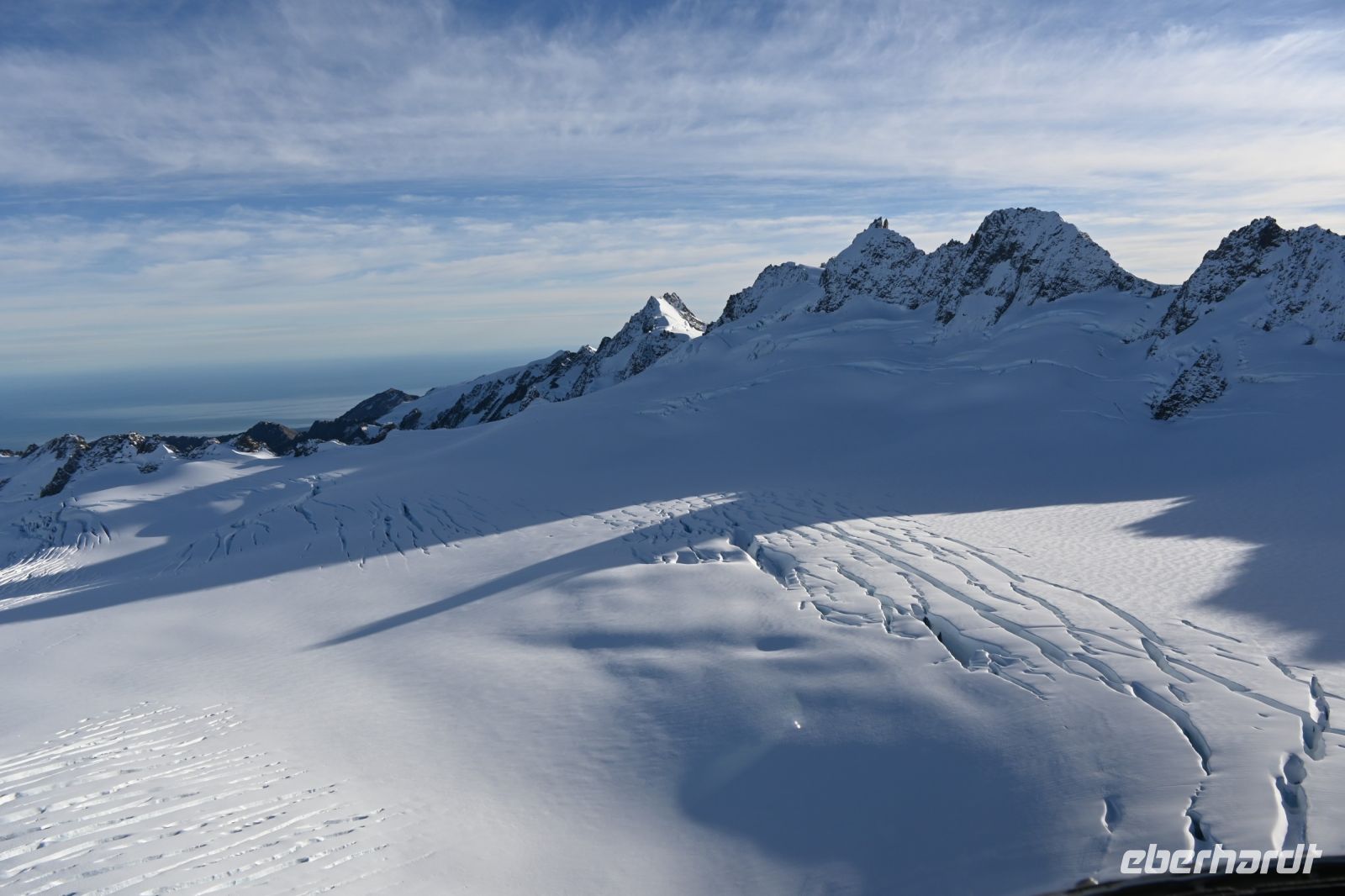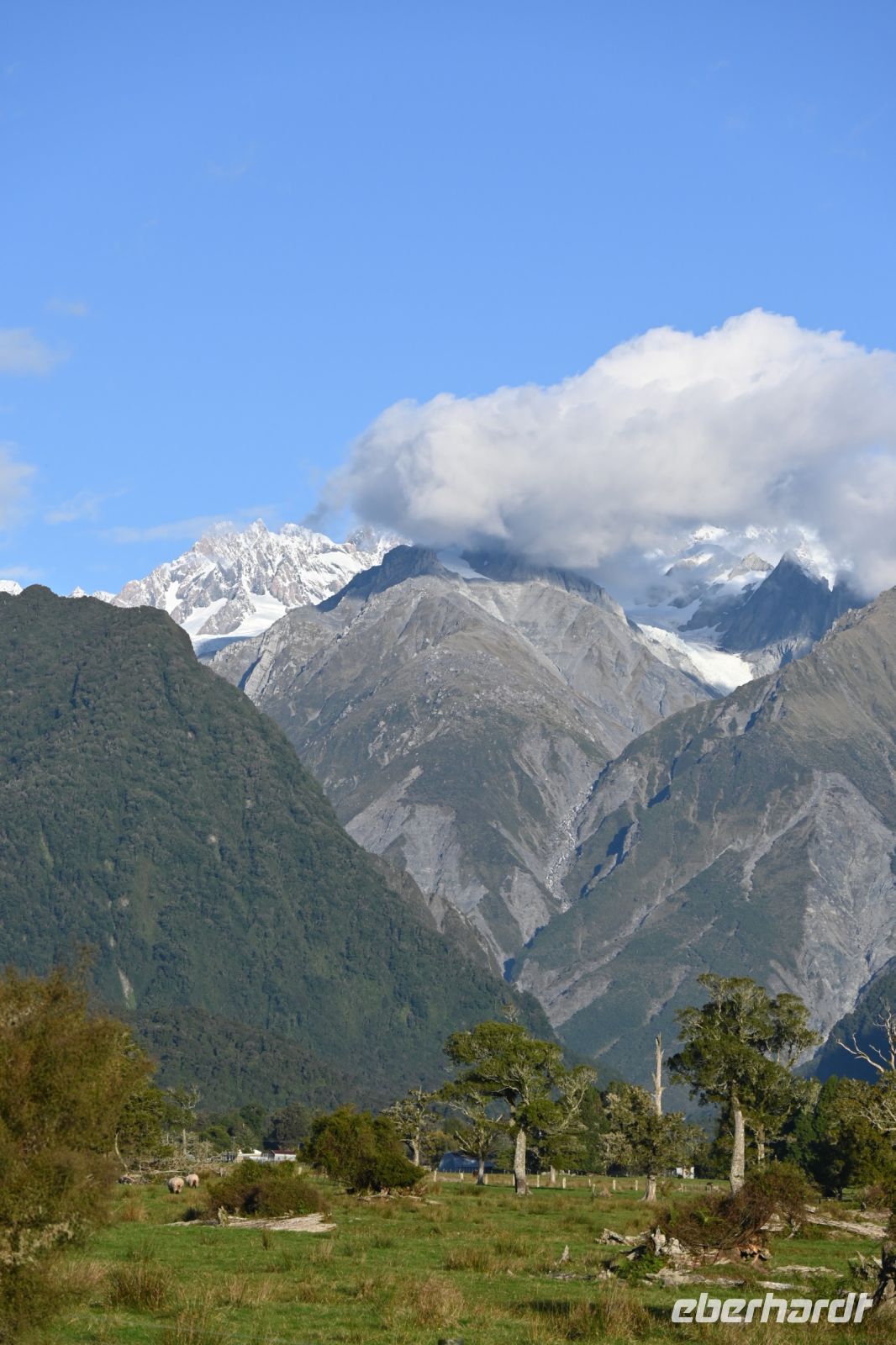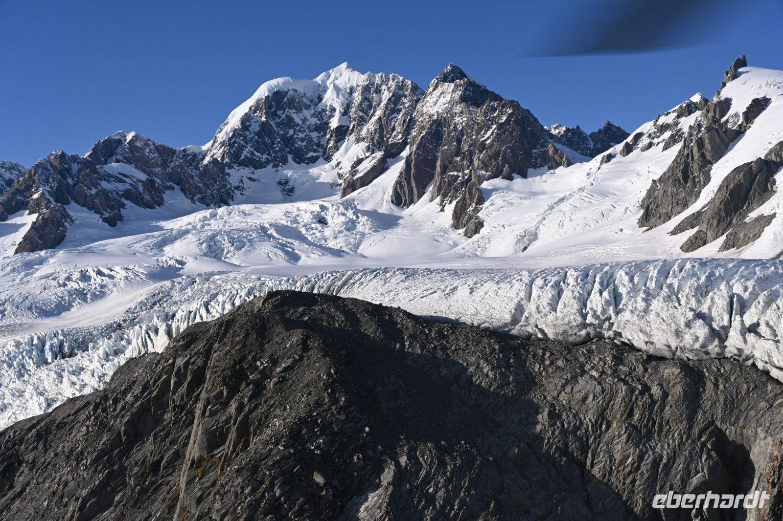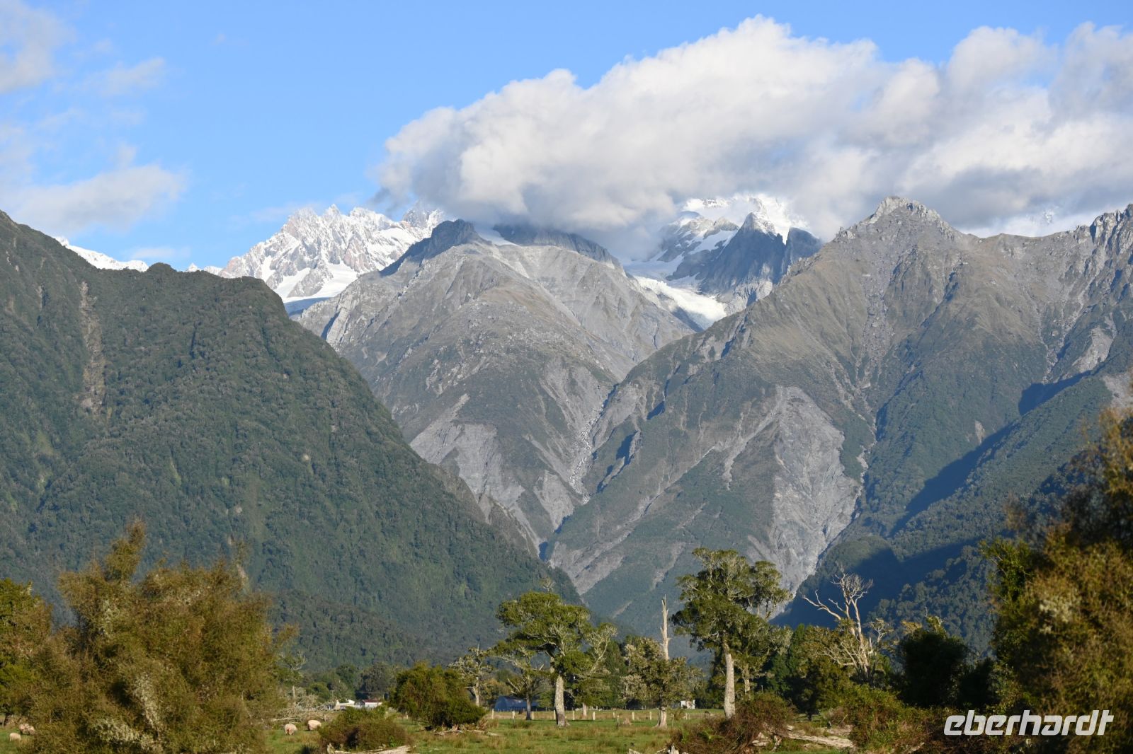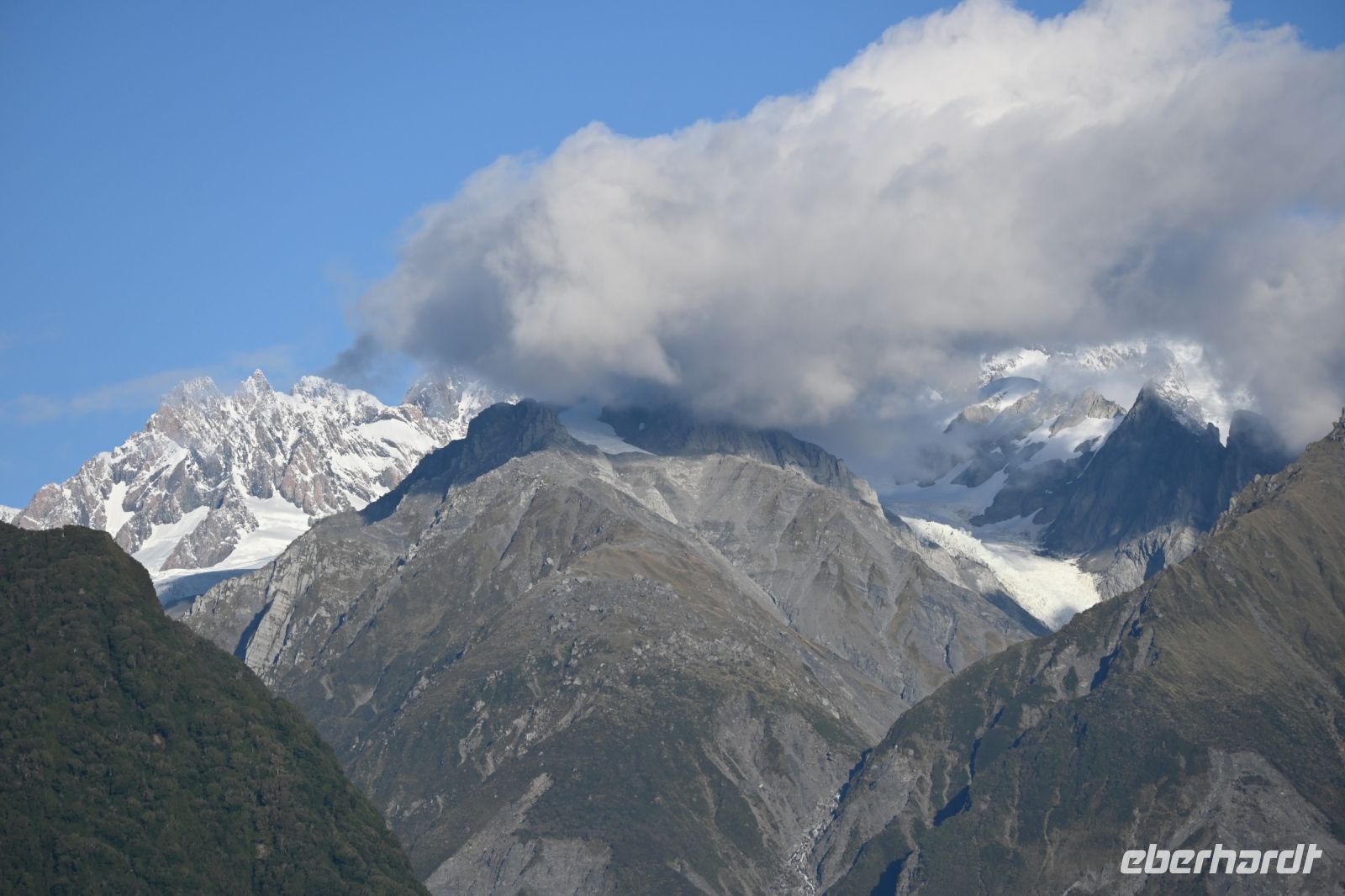 Wieder im Bus hat Hampi noch eine Überraschung für uns. Er fährt am Hotel vorbei und aus Fox heraus. Nachdem er rechts abgebogen ist und auf einem Parkplatz hält, dürfen wir aussteigen. Von hier hat man einen wunderbaren Blick auf die beiden höchsten Berge von Neuseeland. Mount Cook mit 3.724 Metern und Mount Tasman mit 3.497 Metern hatten sich soeben noch hinter den anderen Bergen versteckt. Die Spitze von Cook ist noch hinter Wolken verhüllt, aber der Blick von hier ist wirklich überwältigend.