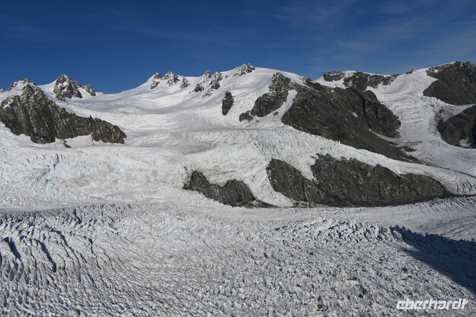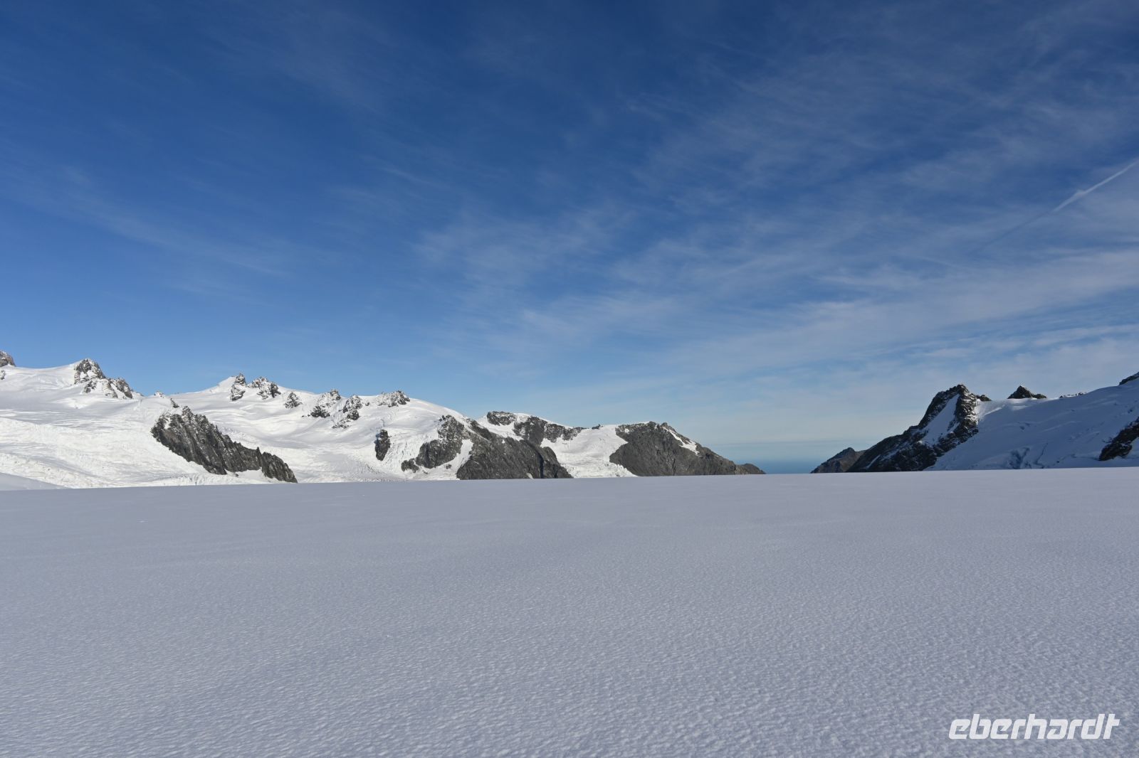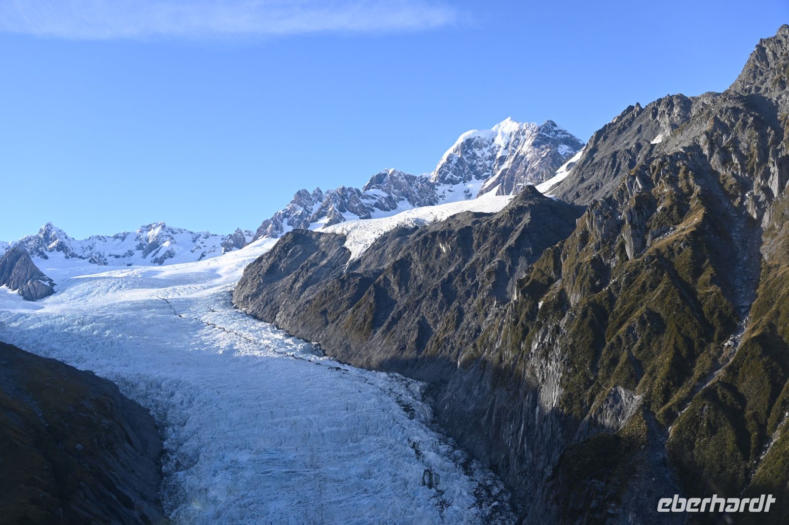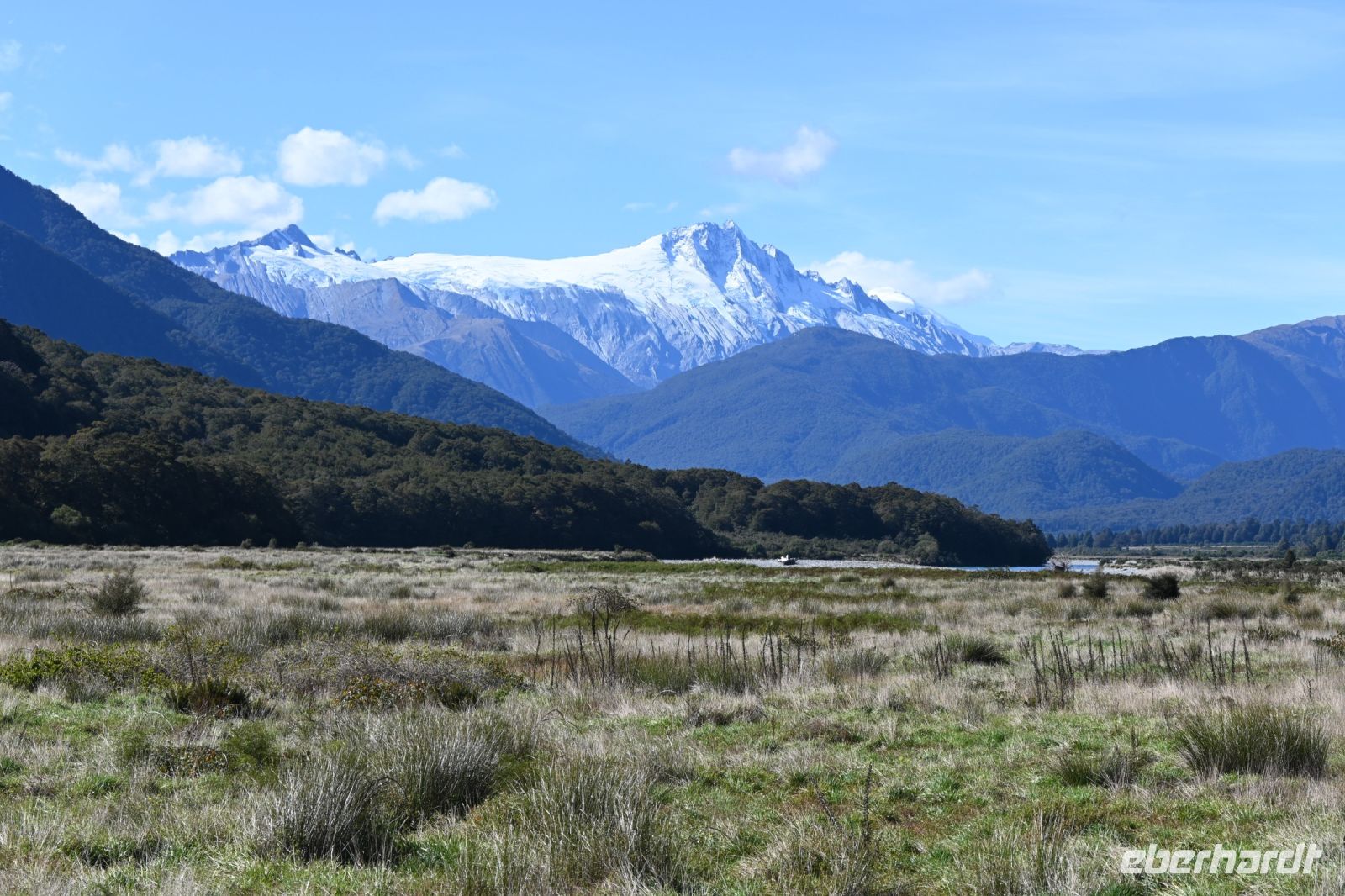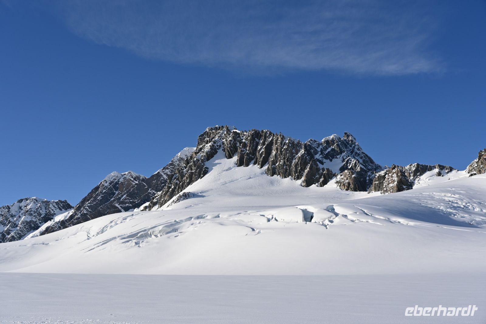 Wieder im Bus hat Hampi noch eine Überraschung für uns. Er fährt am Hotel vorbei und aus Fox heraus. Nachdem er rechts abgebogen ist und auf einem Parkplatz hält, dürfen wir aussteigen. Von hier hat man einen wunderbaren Blick auf die beiden höchsten Berge von Neuseeland. Mount Cook mit 3.724 Metern und Mount Tasman mit 3.497 Metern hatten sich soeben noch hinter den anderen Bergen versteckt. Die Spitze von Cook ist noch hinter Wolken verhüllt, aber der Blick von hier ist wirklich überwältigend.