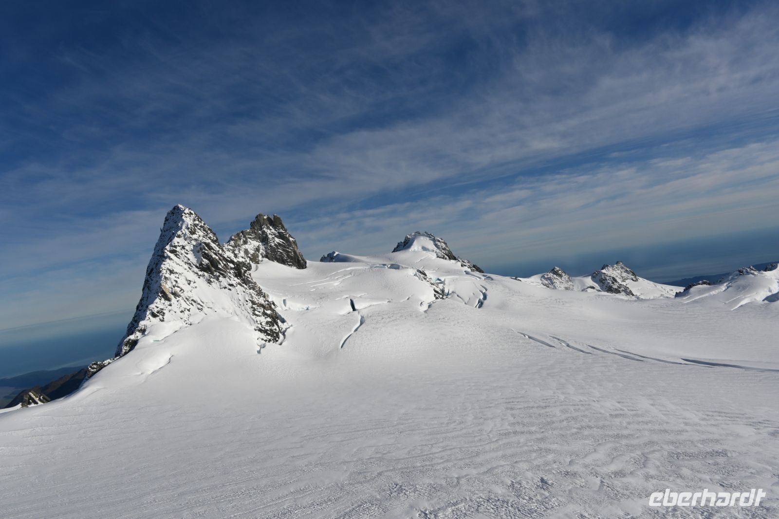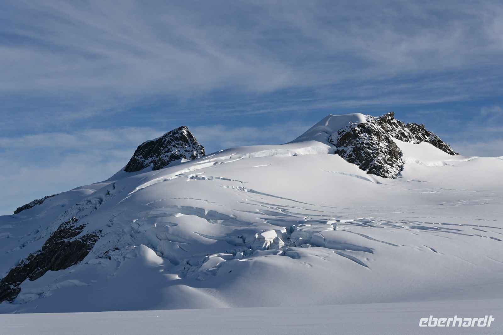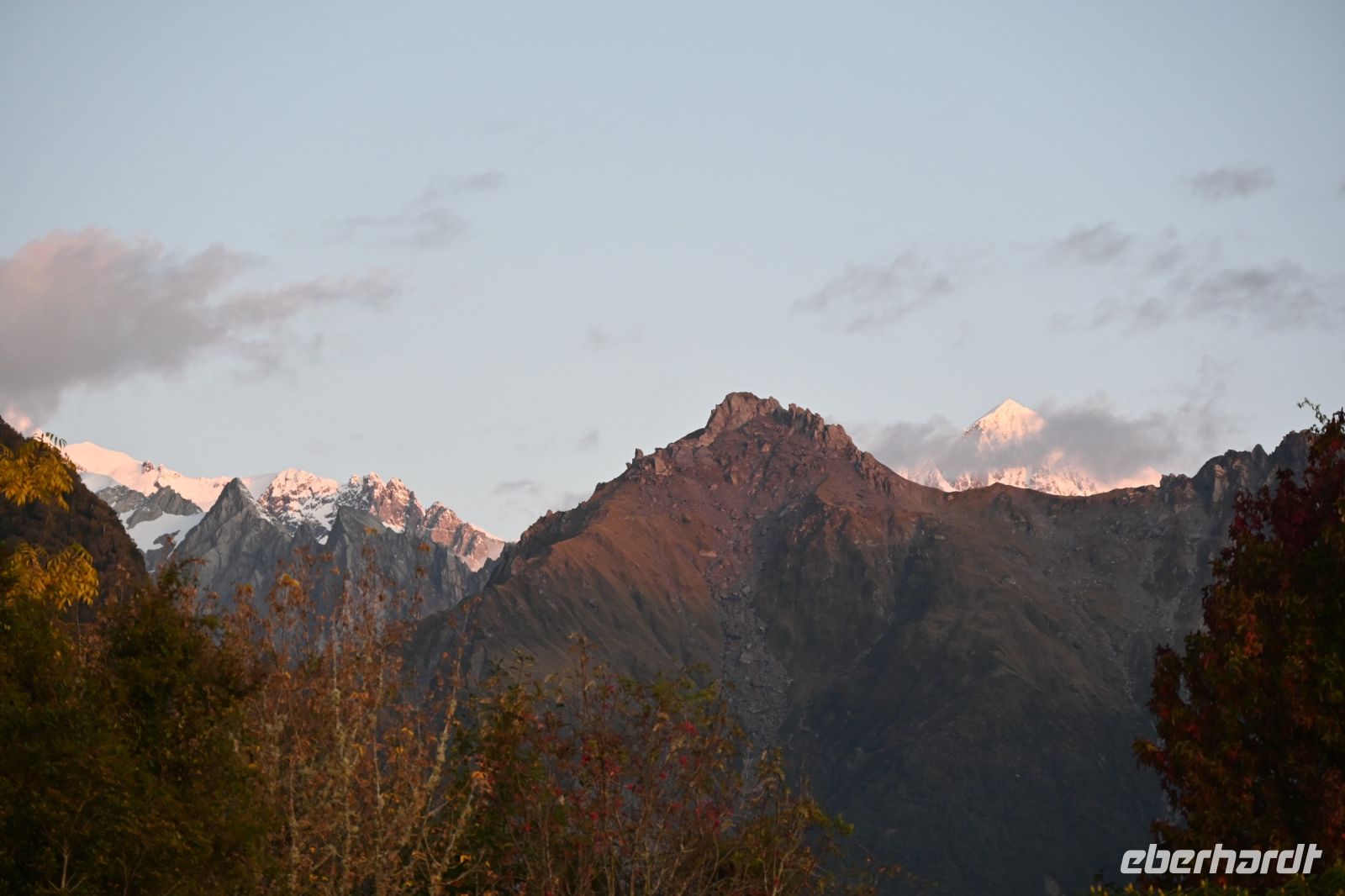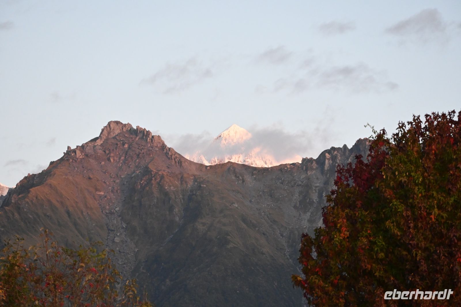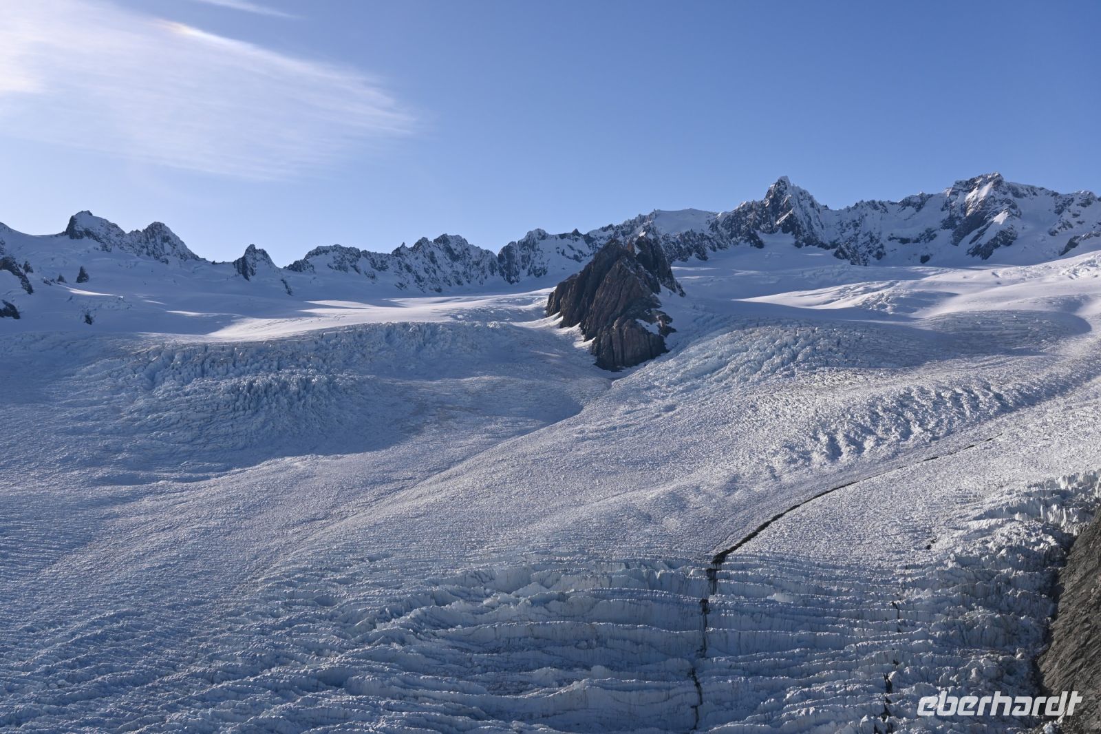 Wieder im Bus hat Hampi noch eine Überraschung für uns. Er fährt am Hotel vorbei und aus Fox heraus. Nachdem er rechts abgebogen ist und auf einem Parkplatz hält, dürfen wir aussteigen. Von hier hat man einen wunderbaren Blick auf die beiden höchsten Berge von Neuseeland. Mount Cook mit 3.724 Metern und Mount Tasman mit 3.497 Metern hatten sich soeben noch hinter den anderen Bergen versteckt. Die Spitze von Cook ist noch hinter Wolken verhüllt, aber der Blick von hier ist wirklich überwältigend.