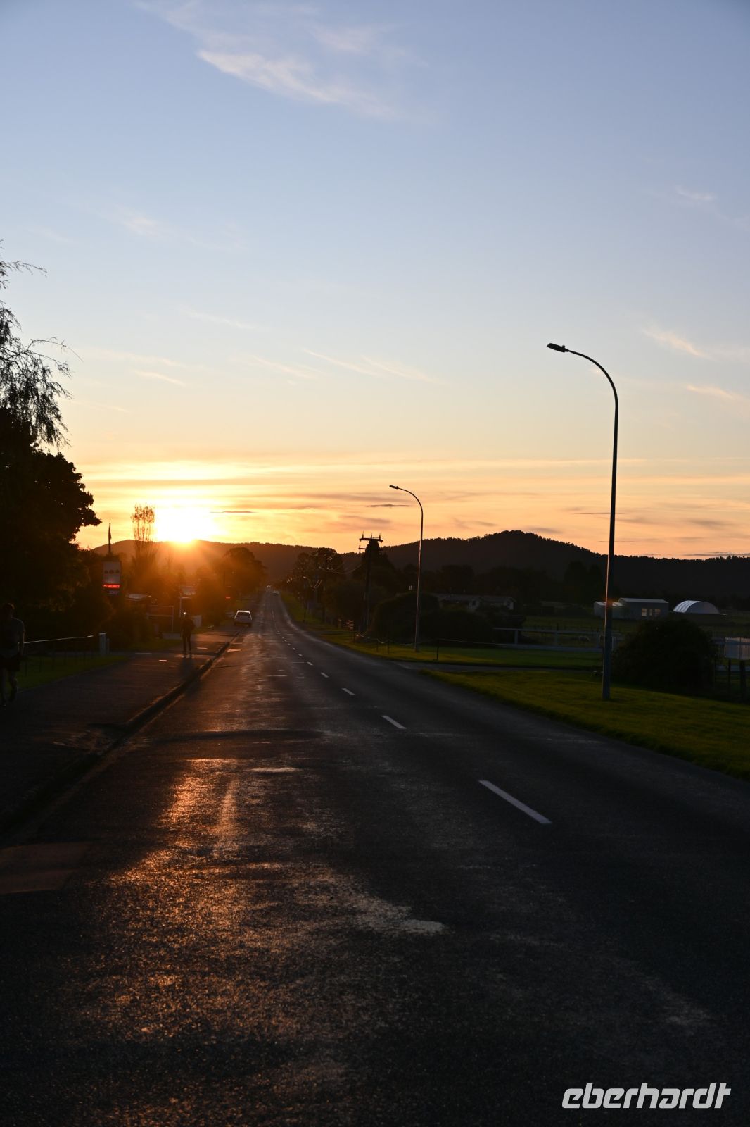 Nach dem Frühstück starten wir wieder zeitig, vor uns liegen rund 400 Kilometer bis nach Pauanui. Dieser kleine Ort liegt mitten auf der Coromandel-Halbinsel, bekannt für seine schönen Strände und vielen Abenteuer, die man hier erleben kann. Wir verlassen also das dünnbesiedelte Nordland mit seinen knapp 200.00 Einwohnern. Für uns geht es erstmal wieder nach Auckland, ohne den Umweg über die kurvigen Straßen durch die Kauriwälder. Damit haben wir schon einiges an Strecke hinter uns. Über Thames, benannt nach dem englischen Vorbild, gelangen wir am Nachmittag auf die Coromandel-Halbinsel. Bereits von weitem fällt uns der Gebirgszug auf, der die Insel wesentlich gestaltet. Durch den Zyklon wurde auch hier viel Unheil angerichtet, so ist es diesem verschuldet, dass wir einen Umweg zu unserer Unterkunft auf uns nehmen müssen. Wieder einmal ist die Fahrt mit vielen Kurven verbunden. Erst bergauf, dann wieder bergab. An den Hängen fallen immer wieder Rutschungen auf, die das viele Wasser ausgelöst hat. Von der größten Baustelle sind wir jedoch sehr überrascht, hier fehlt auf der einen Hälfte der Fahrbahn ein halbrunder Teil der Straße. Dieser wurde in das Tal darunter gespült. Helle erklärt uns, dass die Neuseeländer sich bei kleinen Schäden oft selbst helfen und reparieren. Hier müssen jedoch richtige Profis ans Werk und den Hang von unten wieder aufbauen. Wie lange die eigentliche Straße noch gesperrt sein wird, ist auch noch ungewiss. Zum Sonnenuntergang erreichen wir Pauanui und unsere Unterkunft „Pauanui Pines Motor Lodge“. Hier haben wir kleine Häuschen mit je zwei Wohnungen, ohne große Straße in der Nähe, werden wir hier zwei ruhige Nächte verbringen.