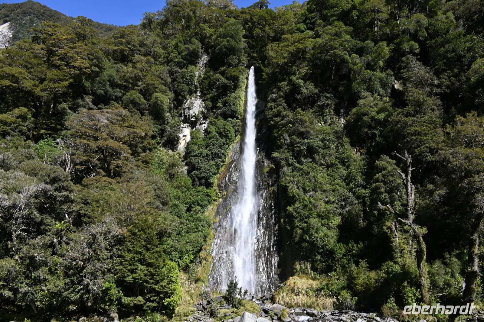 Dafür spielt das Wetter mit und die Ausblicke aus dem Fenster und den Fotostopps machen uns glücklich. Bevor heute die Alpen überqueren und unsere Reise an der Westküste fortsetzen, legen wir einen Stopp im Ort Wanaka ein. Die Straßen laden zum Bummeln ein und wie bekommen hier noch das ein oder andere Souvenir von den örtlichen Händlern. Am See lässt es sich aber auch wunderbar entspannen und den Enten beim Schwimmen zusehen. Wir wollen gar nicht zurück in den Bus. Doch umso pünktlicher wir losfahren, desto mehr Zeit haben wir für tolle Fotostopps auf der Route. So halten wir noch am Thunder Creek Fall im Mount-Aspiring-Nationalpark. Insgesamt stürzt sich der Wasserfall 96 Meter in die Tiefe, das meiste davon im Regenwald versteckt. So sehen wir nur die letzte Fallstufe mit 28 Metern, doch so versteckt im Wald ist das eine schöne Kulisse. Am späten Nachmittag erreichen wir den Ort Fox, vor dem Alpenpanorama werden wir heute die Nacht verbringen.