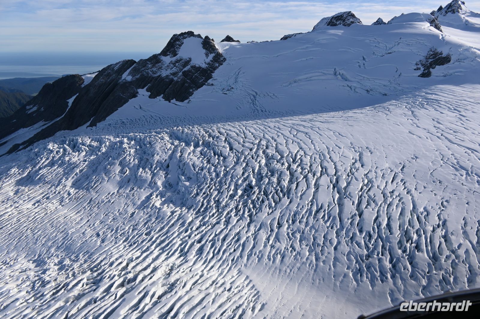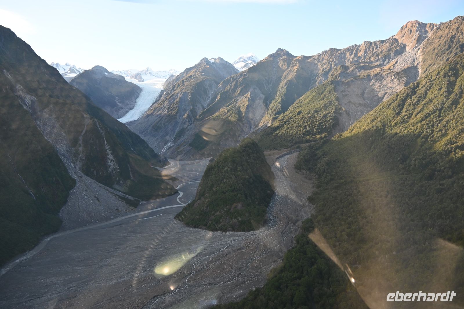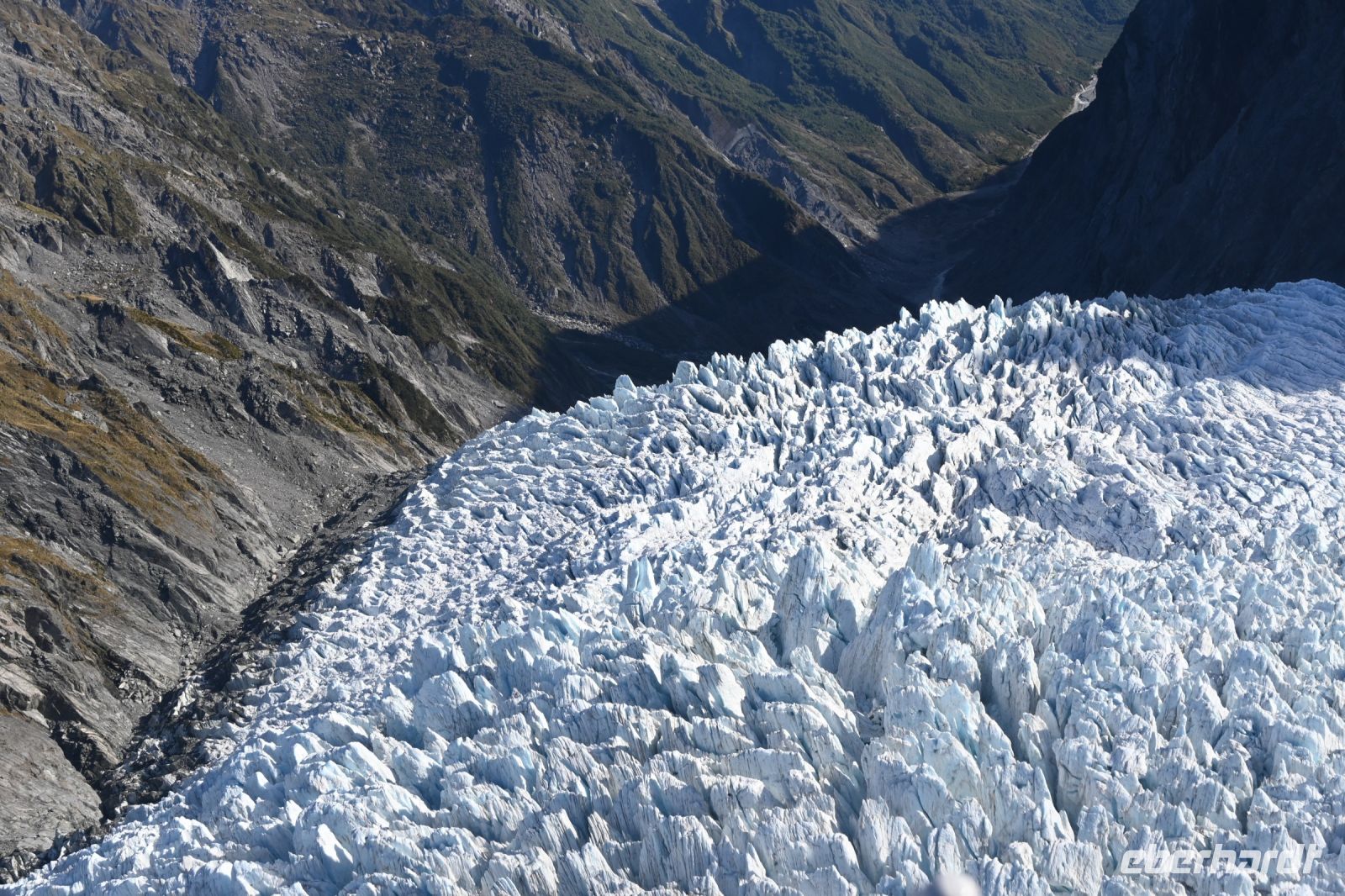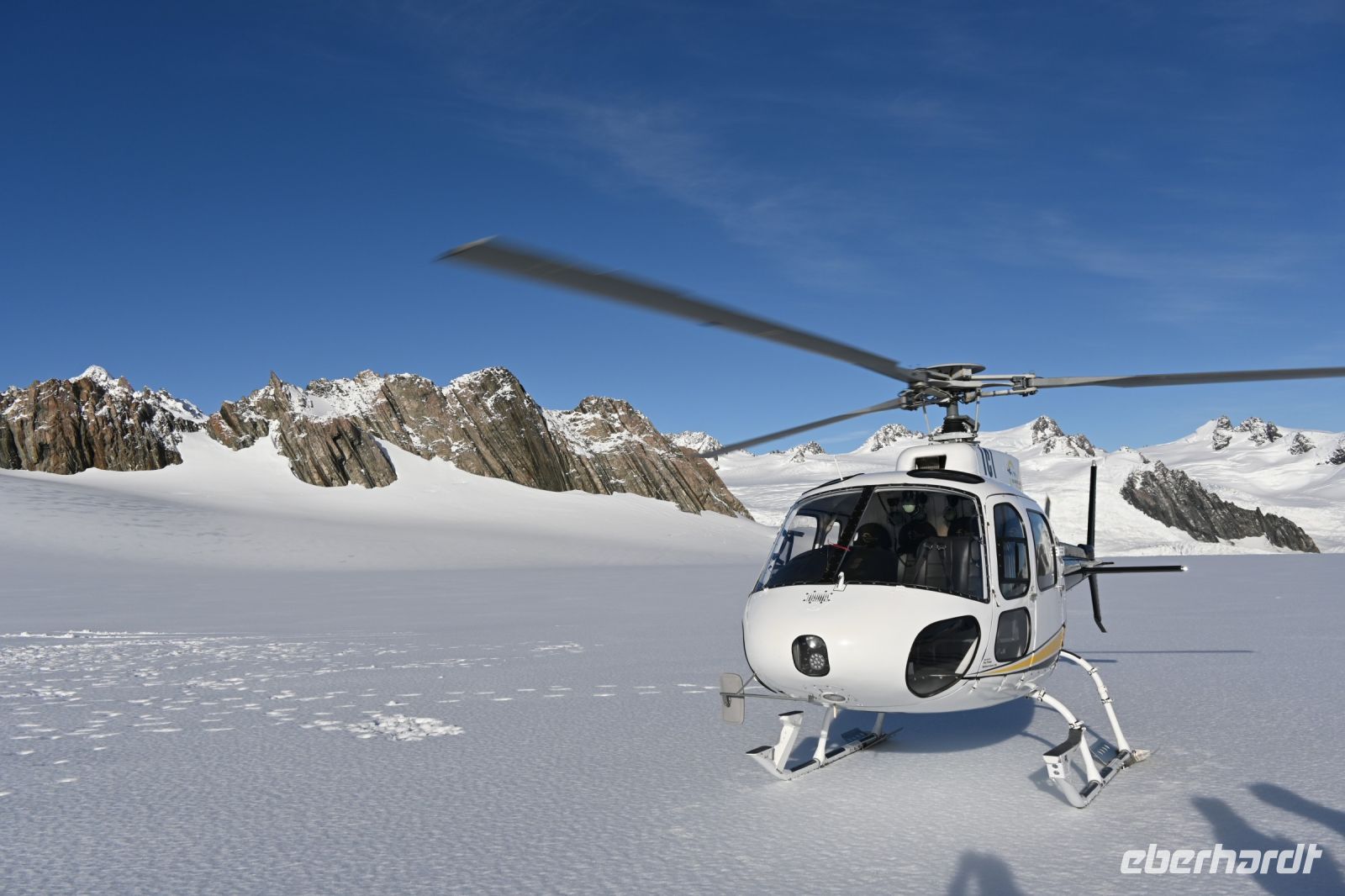 Ein Traum für einige Reisegäste wird heute nach dem Frühstück war und macht diesen Teil der Gruppe sprachlos. Gleich neben unserem Hotel ist das Büro der Helikopterfirma. Der Shuttle bringt uns etwas außerhalb und schon kommt der erste Helikopter angeflogen. Wir teilen uns ins zwei Gruppen. Die erste fliegt 30 Minuten über die Gletscherwelt, die zweite Gruppe hat dafür 40 Minuten Zeit und macht noch eine Extrarunde über Mount Cook und Tasman. Die Sonne gibt heute alles und wir haben beste Voraussetzungen für einen unvergesslichen Flug. Die Besonderheit der beiden Flüge ist die kurze Landung oberhalb des Franz-Josef Gletscher. Unter uns türmen sich circa 300 Meter Eis.