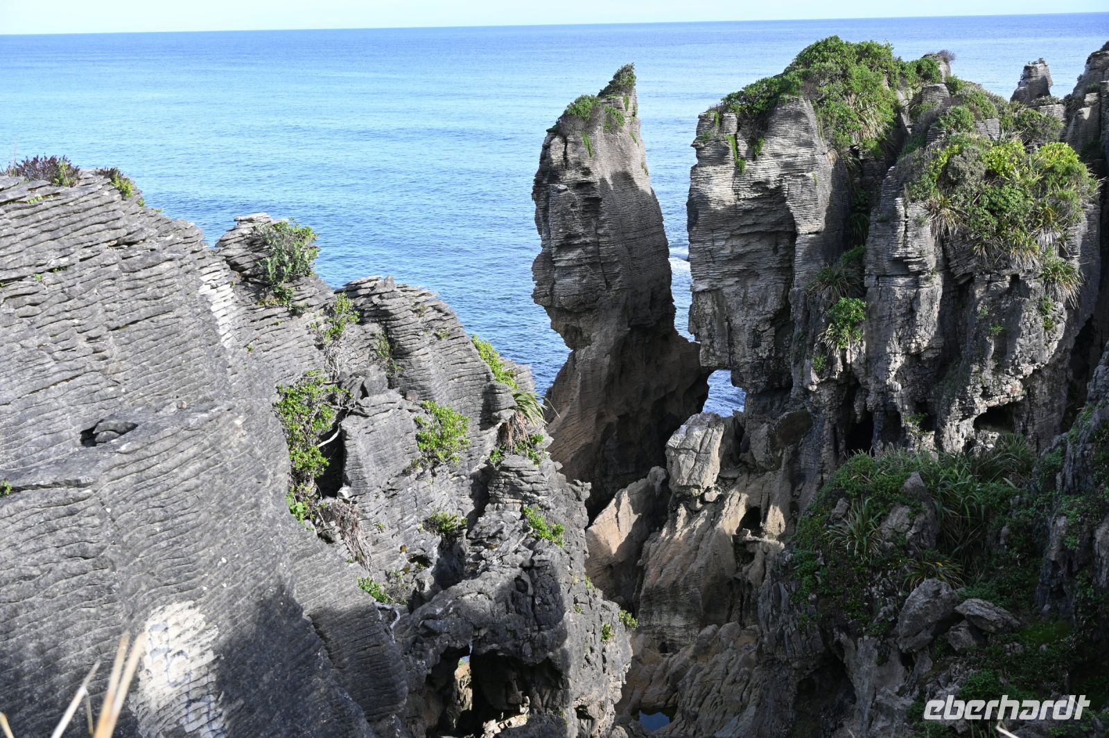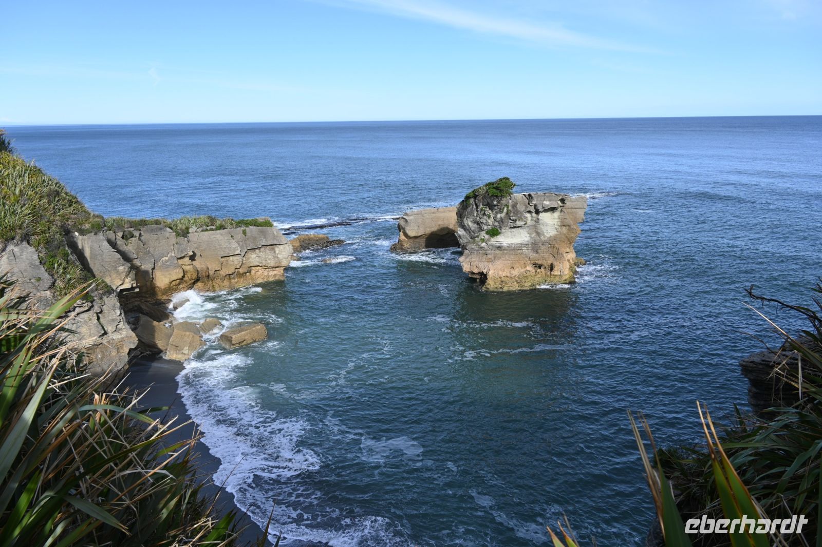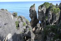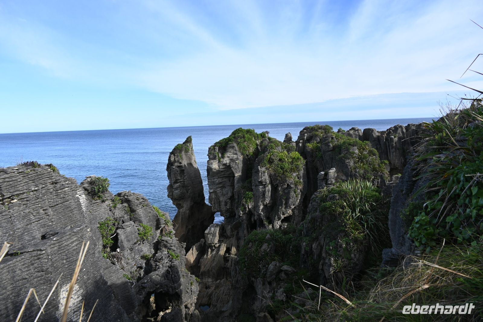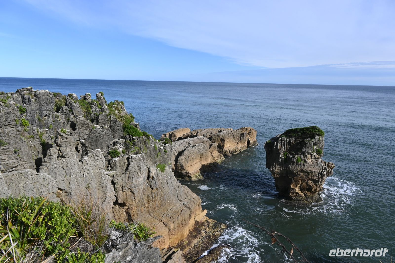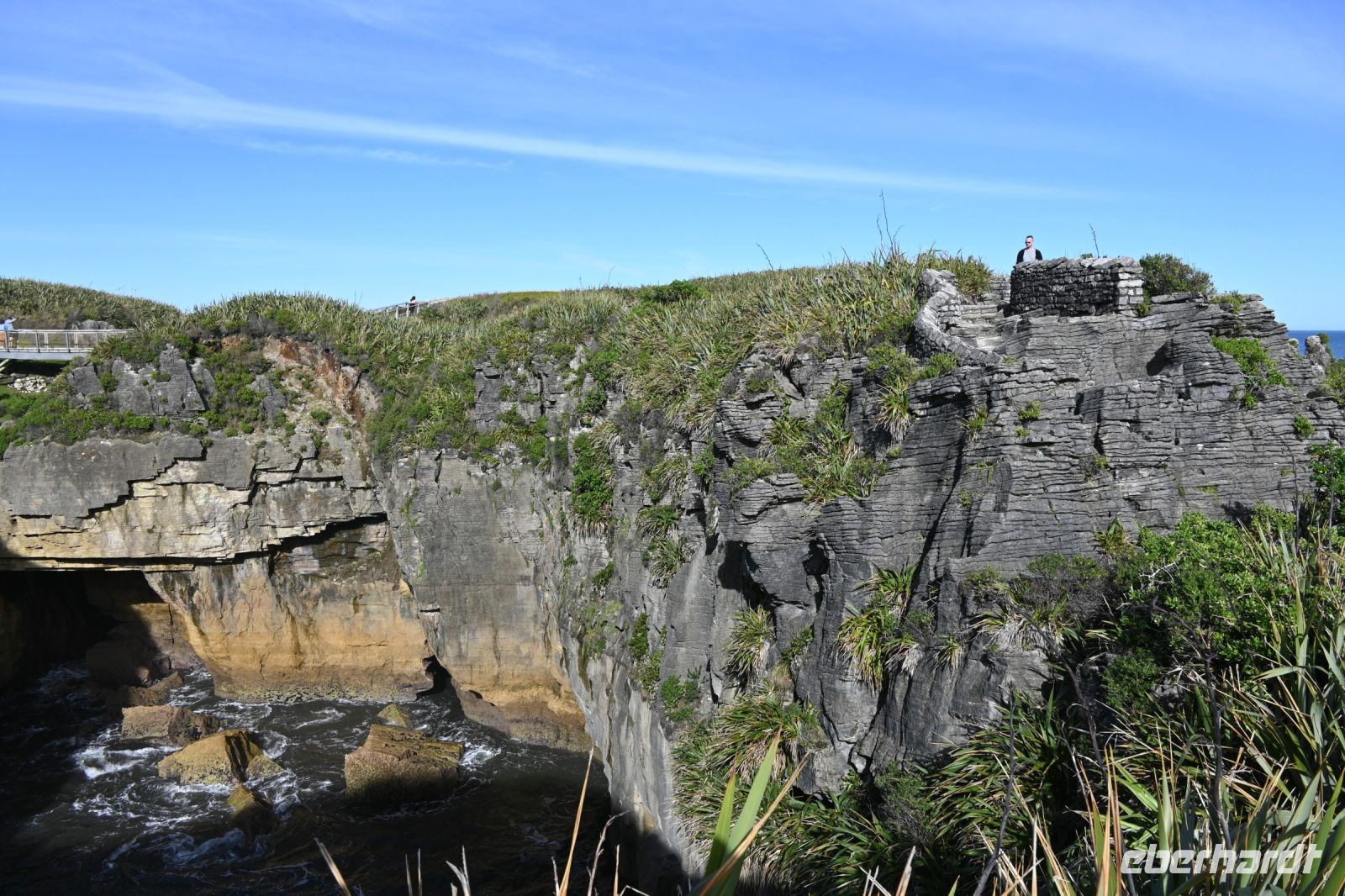 Der letzte richtige Tag hier am schönsten „Ende der Welt“ bricht an und wir brechen zu unserem letzten Ausflug auf. Obwohl wir ein reichhaltiges Frühstück hatten, wollen wir uns gestapelte Eierkuchen anschauen. Etwa eine Stunde von Greymouth entfernt gibt es dieses interessante Naturschauspiel hier im Paparoa-Nationalpark. Über 30 Millionen Jahren haben sich Schichten und Kalk übereinandergelegt und die Pancake Rocks gebildet. Zwischen den Felsen sind sogenannte „Blow Holes“ entstanden. Bei starkem Wellengang und Flut können hier meterhohe Wasserfontänen entstehen. Auf dem kleinen Rundweg bekommen wir einen schönen Überblick über die verschiedenen Formationen. Während eines Kaffees oder bzw. und eines Eis kann man die hier rumlaufenden Wekas beobachten. Die Vögel sind den Kiwis im Aussehen sehr ähnlich. Jedoch sind sie tagaktiv und auch sehr zutraulich.