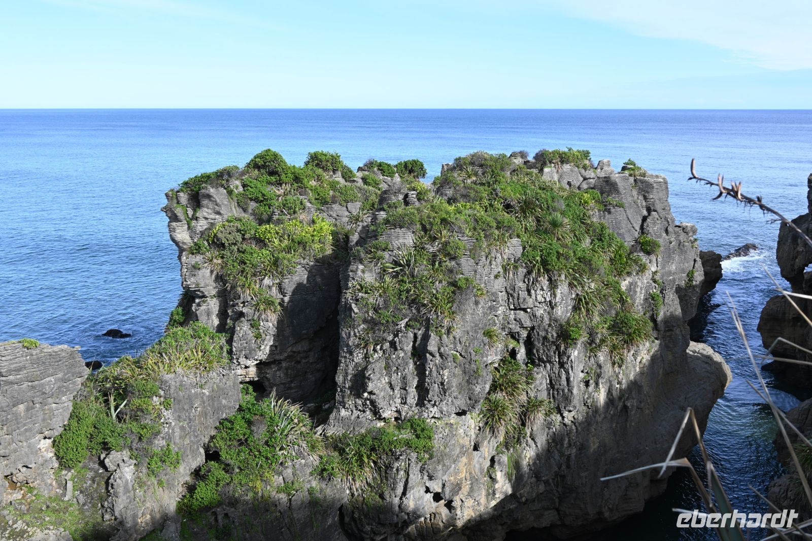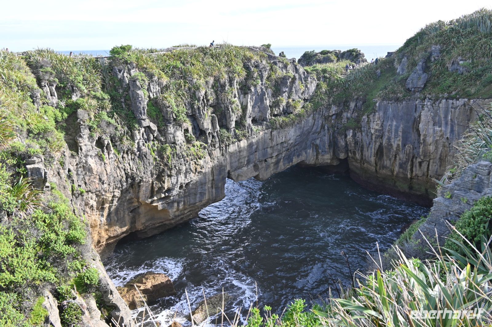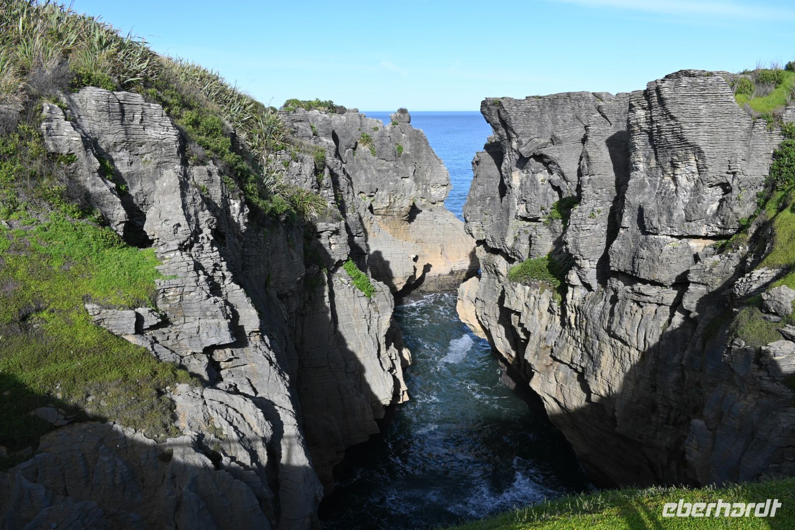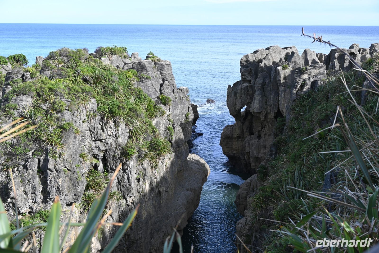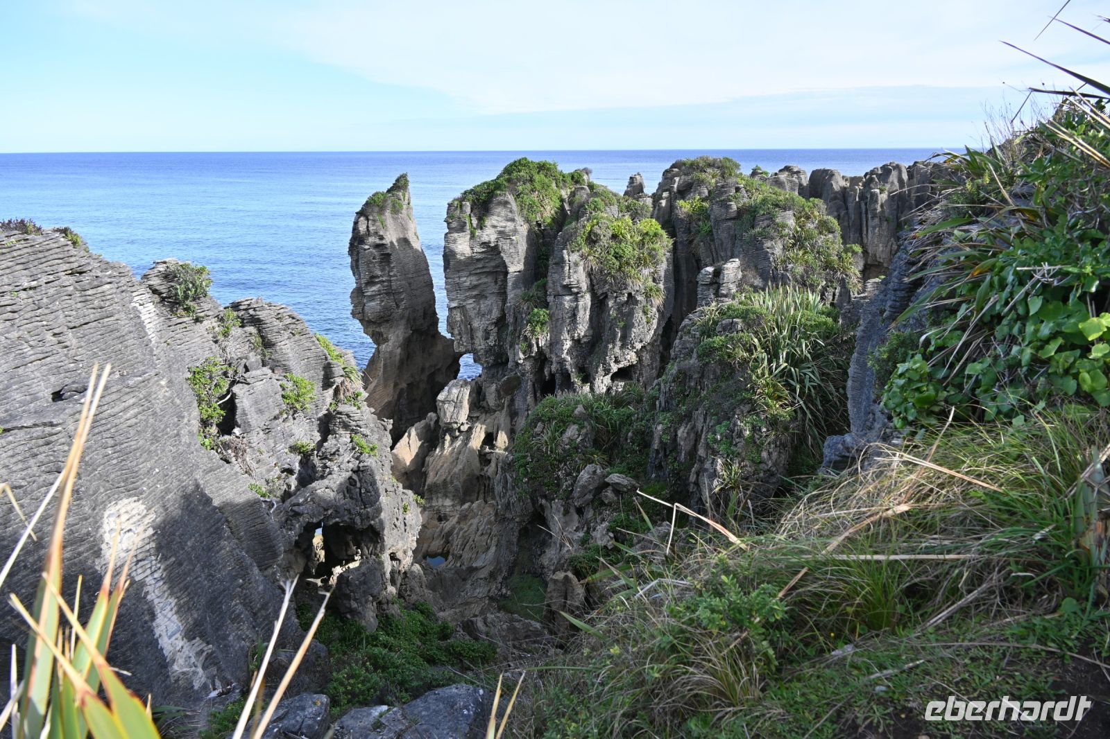Der letzte richtige Tag hier am schönsten „Ende der Welt“ bricht an und wir brechen zu unserem letzten Ausflug auf. Obwohl wir ein reichhaltiges Frühstück hatten, wollen wir uns gestapelte Eierkuchen anschauen. Etwa eine Stunde von Greymouth entfernt gibt es dieses interessante Naturschauspiel hier im Paparoa-Nationalpark. Über 30 Millionen Jahren haben sich Schichten und Kalk übereinandergelegt und die Pancake Rocks gebildet. Zwischen den Felsen sind sogenannte „Blow Holes“ entstanden. Bei starkem Wellengang und Flut können hier meterhohe Wasserfontänen entstehen. Auf dem kleinen Rundweg bekommen wir einen schönen Überblick über die verschiedenen Formationen. Während eines Kaffees oder bzw. und eines Eis kann man die hier rumlaufenden Wekas beobachten. Die Vögel sind den Kiwis im Aussehen sehr ähnlich. Jedoch sind sie tagaktiv und auch sehr zutraulich.
