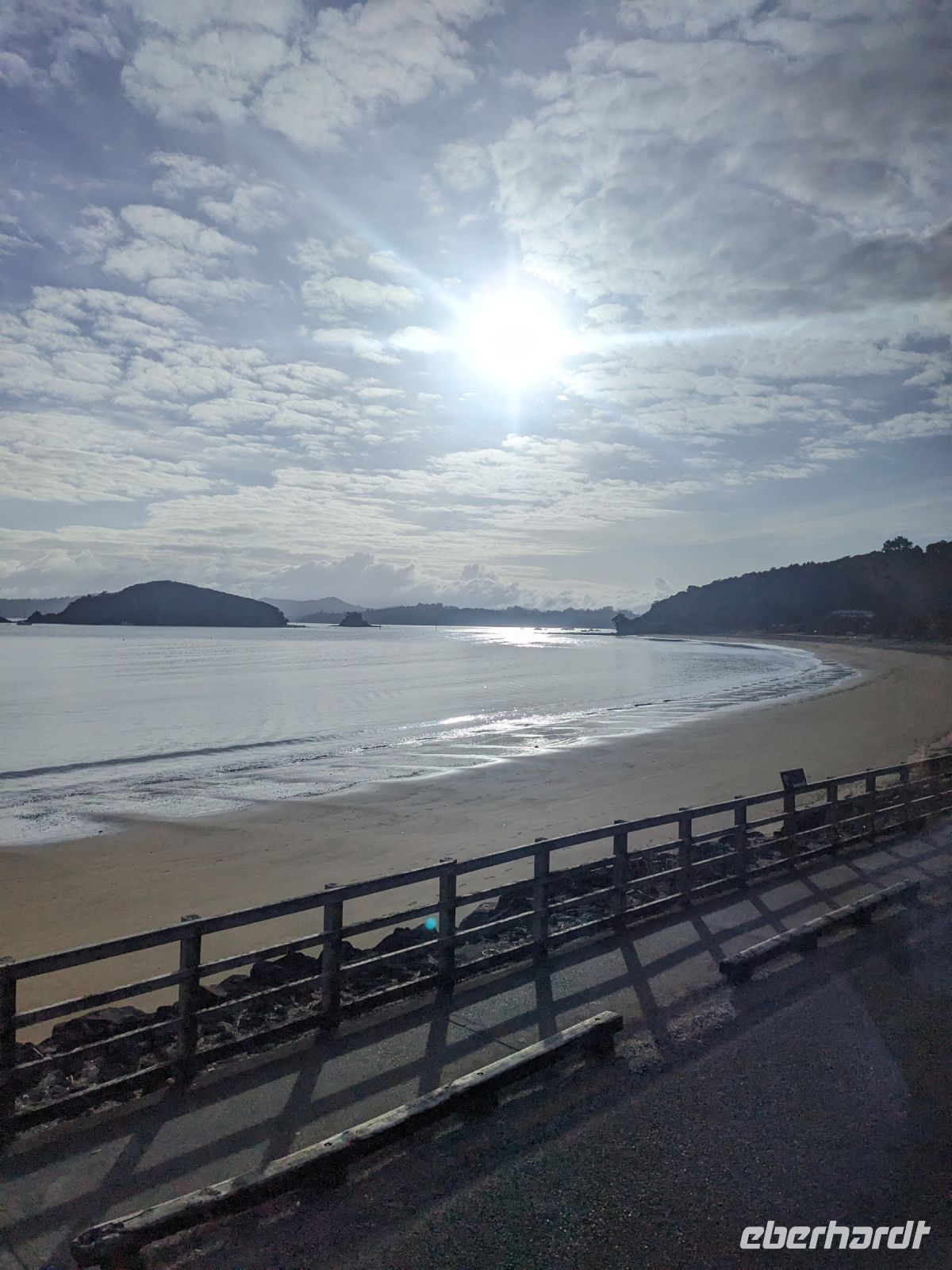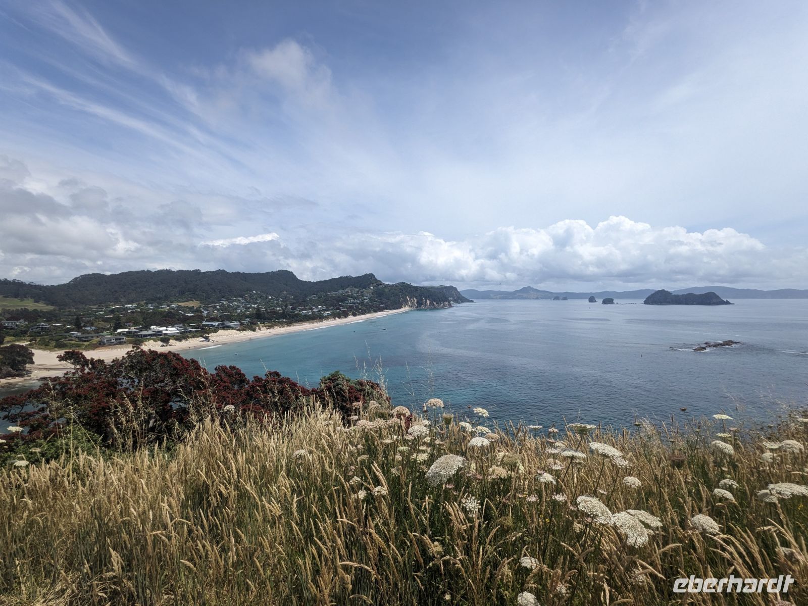 Unser nächstes Ziel war der Hahei Beach. Aufgrund der vorherigen Enttäuschung über die geschlossene Cathedral Cove versuchten wir, nach einem Wassertaxi Ausschau zu halten. Leider erfuhren wir telefonisch, dass an diesem Tag keine Wassertaxis fuhren und die Cathedral Cove weiterhin für uns unzugänglich blieb. Als Ersatz unternahmen wir eine kurze Wanderung auf dem Te Whanganui-A-Hei Coastal Walkway, gefolgt von einem Mittagessen, bei dem Polenta-Sticks, Sandwiches, Eis und Kaffee für unsere Stärkung sorgten.
