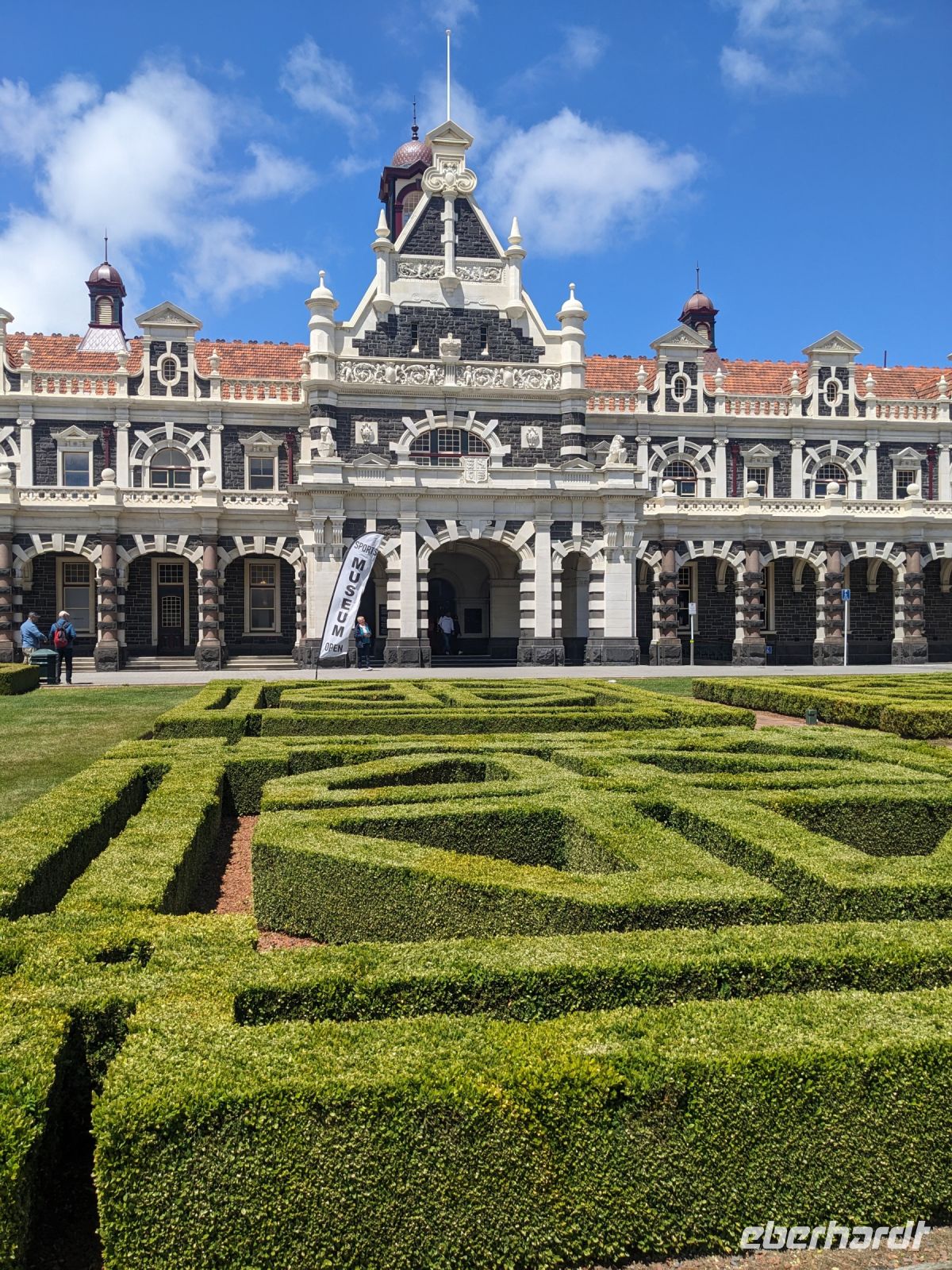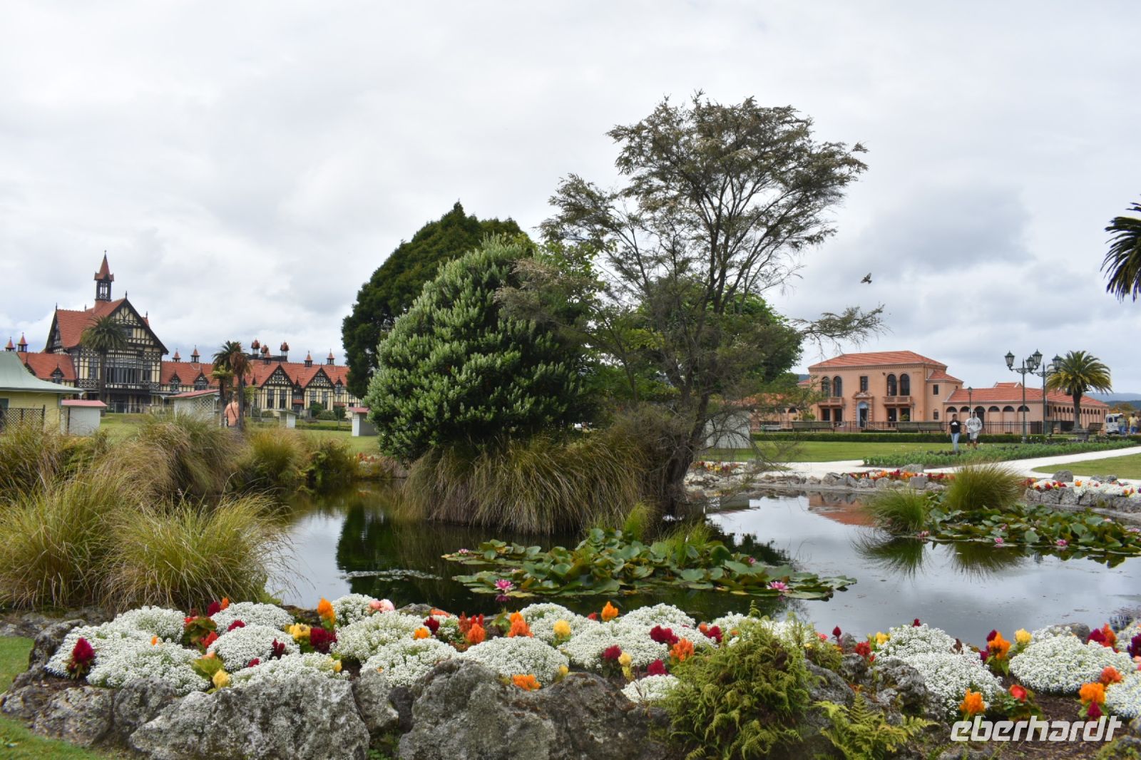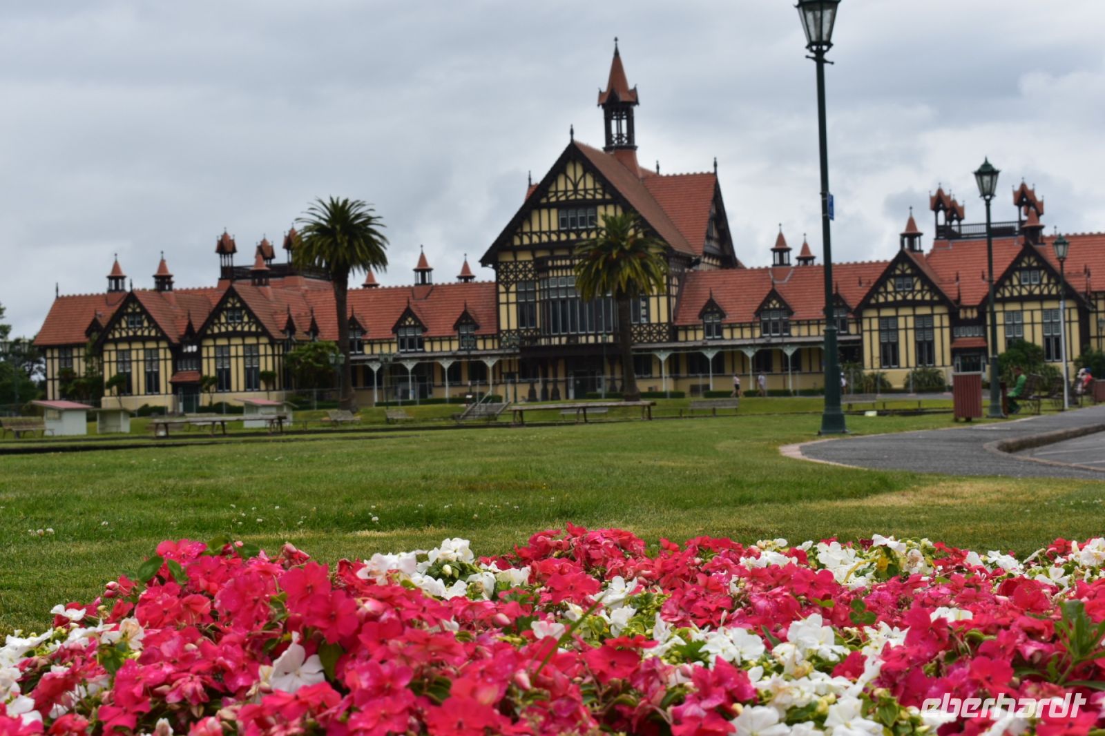 Heute teilte sich unsere Gruppe zumindest für den halben Tag auf. Nach einer längeren Fahrt setzten wir einige Personen am Hobbiton Film Set ab. Nachdem die Tickets abgeholt und eine App für die deutsche Übersetzung organisiert wurden, machte sich der Rest auf den Weg nach Rotorua. Bereits beim Fotostopp an den Government Gardens wurde klar, dass die Vorwarnung vor dem üblen Geruch nicht untertrieben war. Die Schwefelgase, die hier durch die vulkanische Region freigesetzt werden, ließen uns ganz schön die Nase rümpfen.