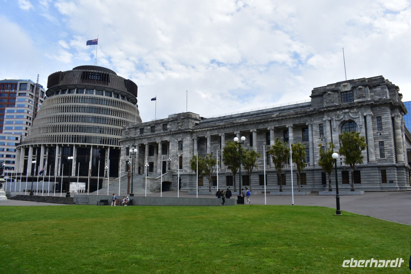 Auf dem Weg erblicken wir den Ort, an dem die größte Mohrrübe geerntet wurde, und den Ort, an dem der Stiefel am weitesten geworfen wurde – bis zum Ort "Bulls", der natürlich bekannt für seine Bullen ist. Hier wird allem der Name "Bull" angehängt – "Physio-Bull", Restaurant "La Bull" usw. Immerhin bleibt auf dem Weg genügend Zeit für die letzten wissenswerten Infos unserer Reiseleitung, da uns diese bereits am nächsten Tag verlassen wird. Wir erfahren, was es eigentlich mit dem Lachs auf sich hat, wie Liebende bei einer Kanufahrt der Flüsse auf die Probe gestellt werden, und der letzte geschichtliche Zusammenhang, warum Wellington Wellington heißt. In Wellington angekommen, staunen wir über den Ausblick vom Victoria Mount. Eine kleine Stadtrundfahrt lässt uns die immer noch nicht vollständig entwickelte Architektur Neuseelands bestaunen und tiefer in die Geschichte vor dem Regierungssitz eintauchen. Dennoch am ersten Weihnachtsfeiertag ist absolut nichts los in der Stadt, aber Windy Wellington macht seinem Ruf alle Ehre, denn es weht eine starke Brise.