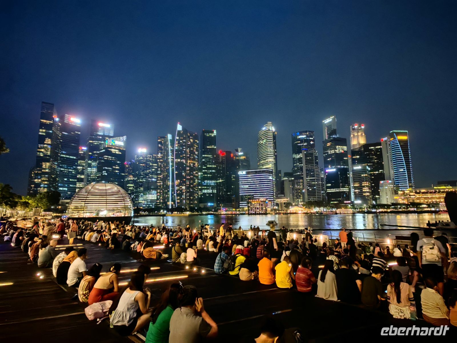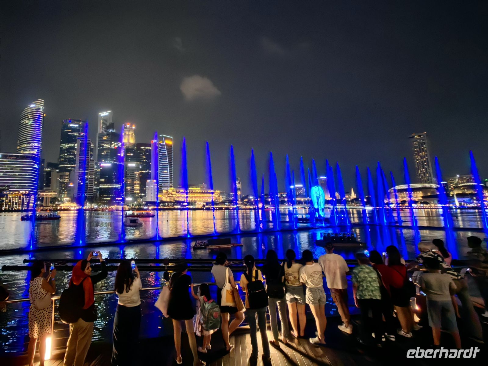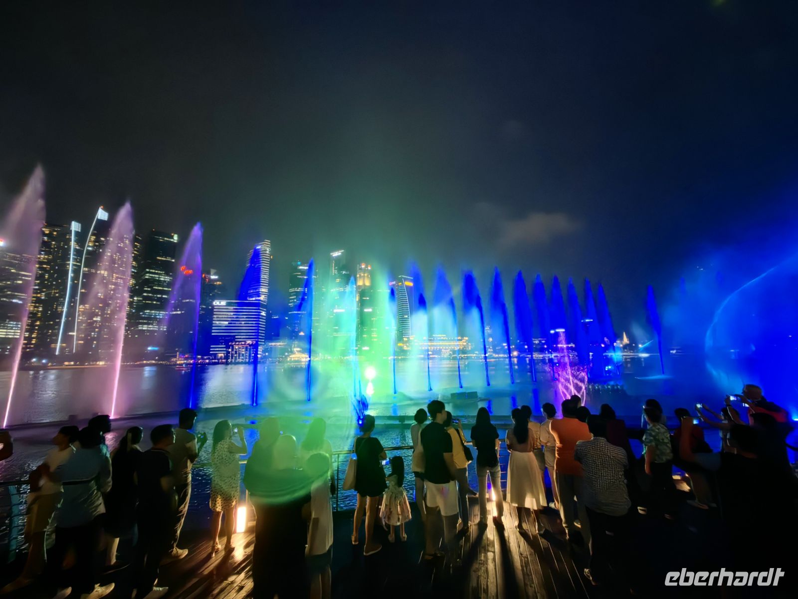 Am Abend entdecken wir die Skyline der Megacity mit ihren 5,5 Millionen Einwohnern und sind gebannt von der Kulisse, den vielen Lichtern und natürlich der imposanten Show an den Gardens by the bay, dem größten botanischen Garten der Welt. Wir schauen uns zuerst die Laser- und Wassershow am berühmten Marina Bay Sands Hotel an und laufen dann zu den riesigen Supertrees, den Bäumen aus Stahl, wo zu Musicalmelodien die "Bäume" magisch im Takt beleuchtet werden.