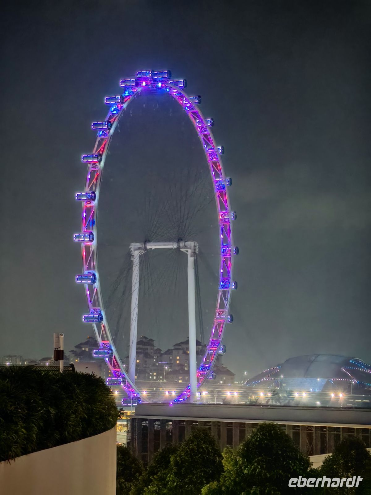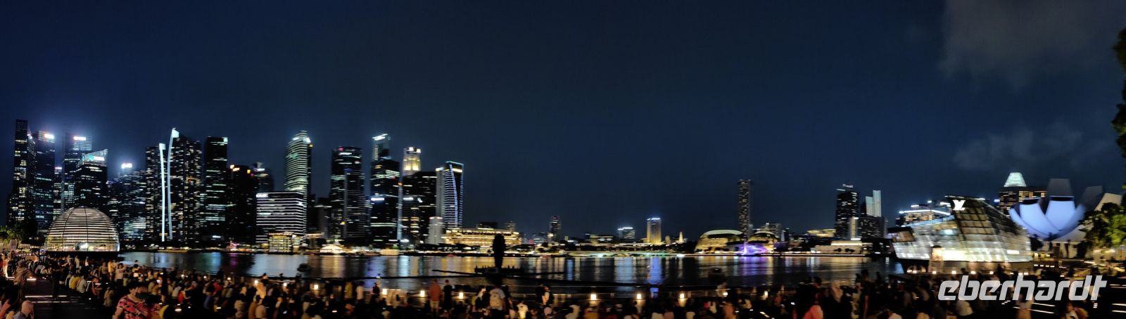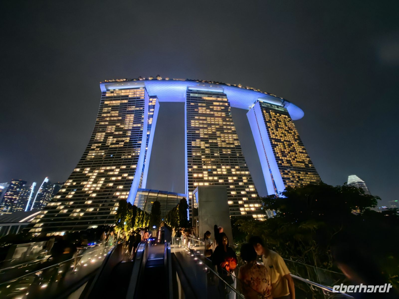 Am Abend entdecken wir die Skyline der Megacity mit ihren 5,5 Millionen Einwohnern und sind gebannt von der Kulisse, den vielen Lichtern und natürlich der imposanten Show an den Gardens by the bay, dem größten botanischen Garten der Welt. Wir schauen uns zuerst die Laser- und Wassershow am berühmten Marina Bay Sands Hotel an und laufen dann zu den riesigen Supertrees, den Bäumen aus Stahl, wo zu Musicalmelodien die "Bäume" magisch im Takt beleuchtet werden.