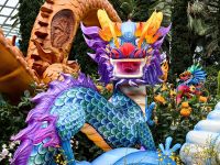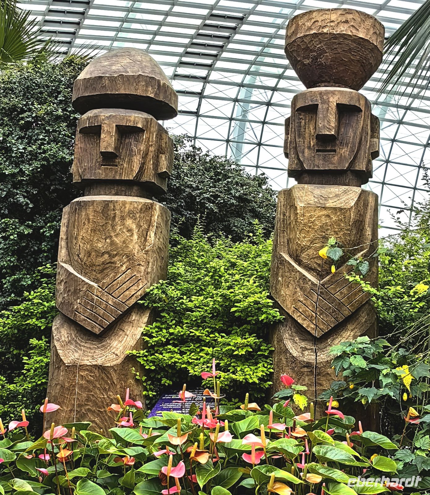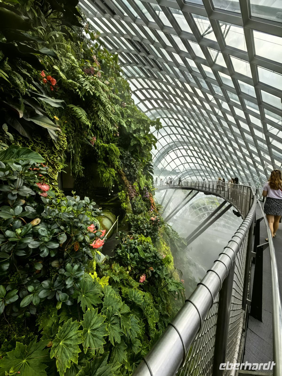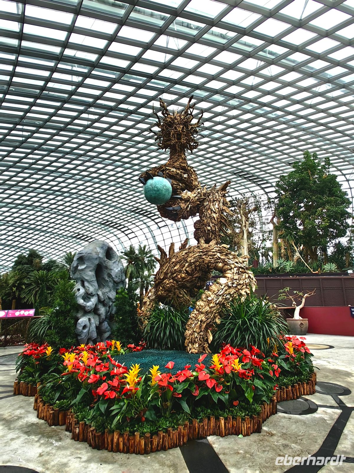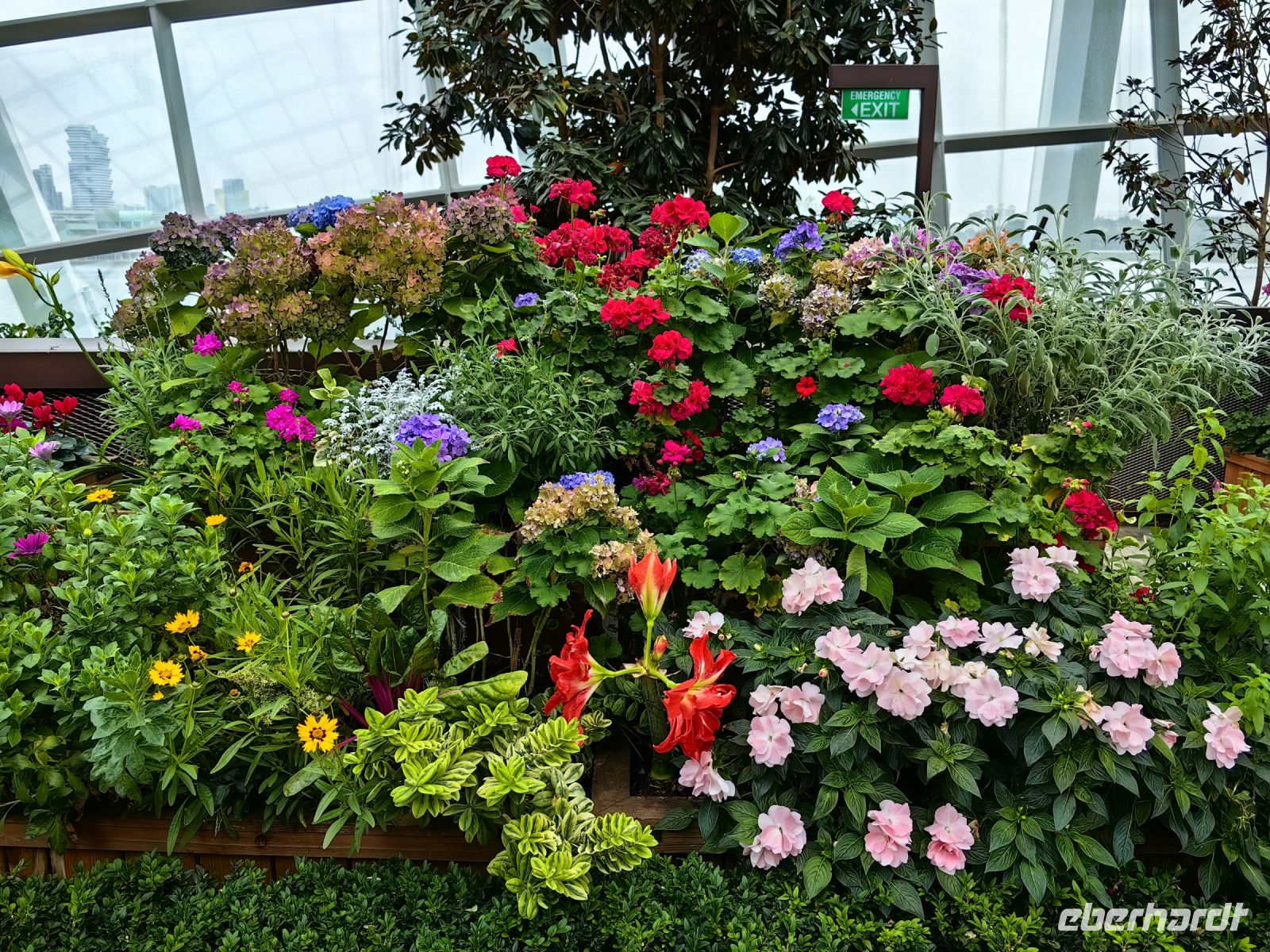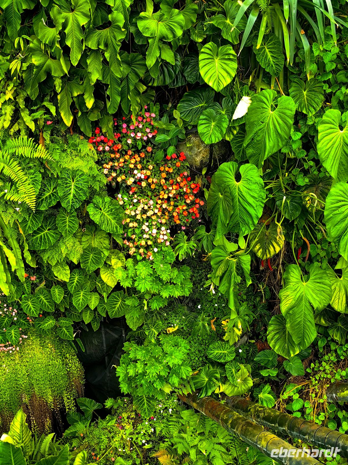 Morgens bewundern wir das reichhaltige und teilweise exotische Frühstücksbuffet im Carlton Hotel und brechen danach gestärkt zu den Gardens by the Bay auf. Dort schauen wir uns den Nebelwald (Cloud Forest) und den Blumenpavillon (Flower Dome) an. Diese zwei riesigen überdachten Gewächshäuser sind Heimat von vielen uns nur als Balkonpflanzen bekannten Blumen, die wir zu Hause in unseren Wohnungen mühevoll versuchen zu züchten und zu hegen. Hier wachsen sie meterhoch und überwuchern alles! Danach laufen wir zum Marina Bay Sands Hotel und wollen einen Abstecher aufs Dach machen, um von dort den Ausblick zu genießen. Leider ist die Schlange der Wartenden so lang, daß wir dieses Vorhaben verwerfen müssen. Wir kehren ins Hotel zurück und werden bereits von Martine erwartet, die uns sogleich mitnimmt, um uns ihre Wahlheimat bei einer Stadtrundfahrt zu zeigen.