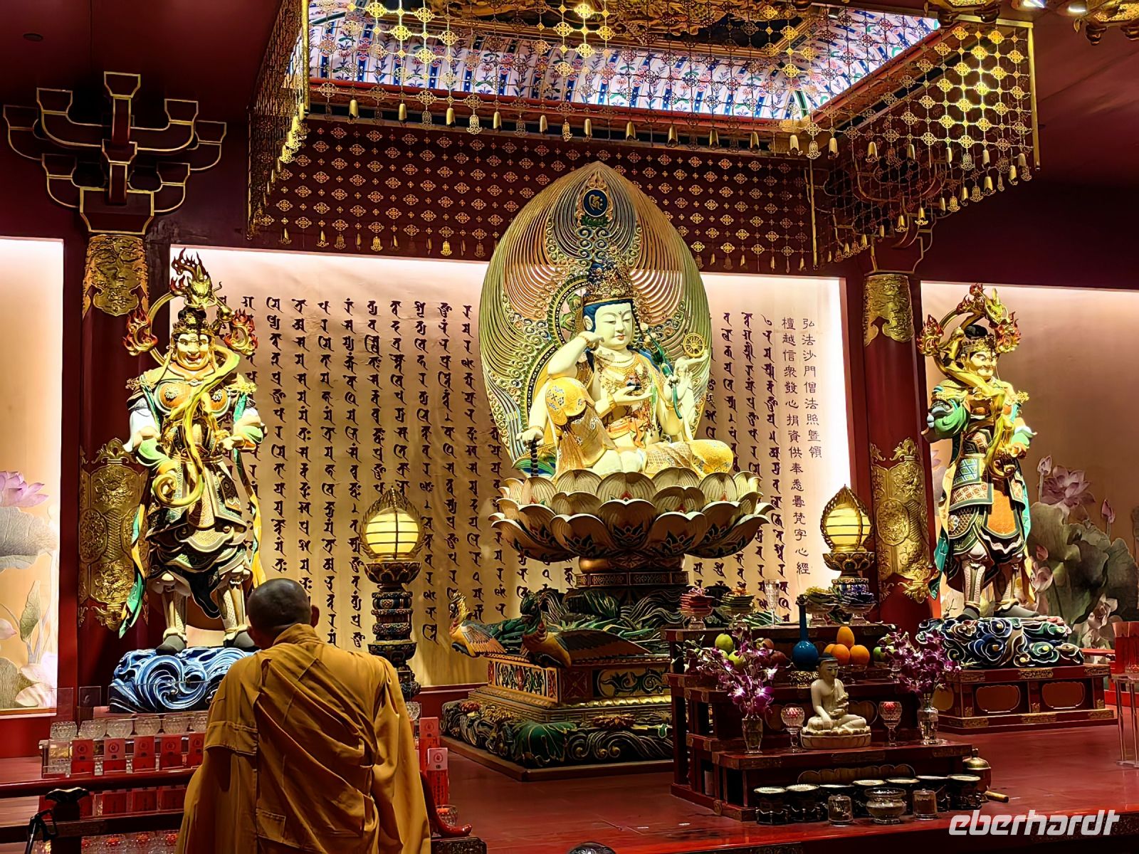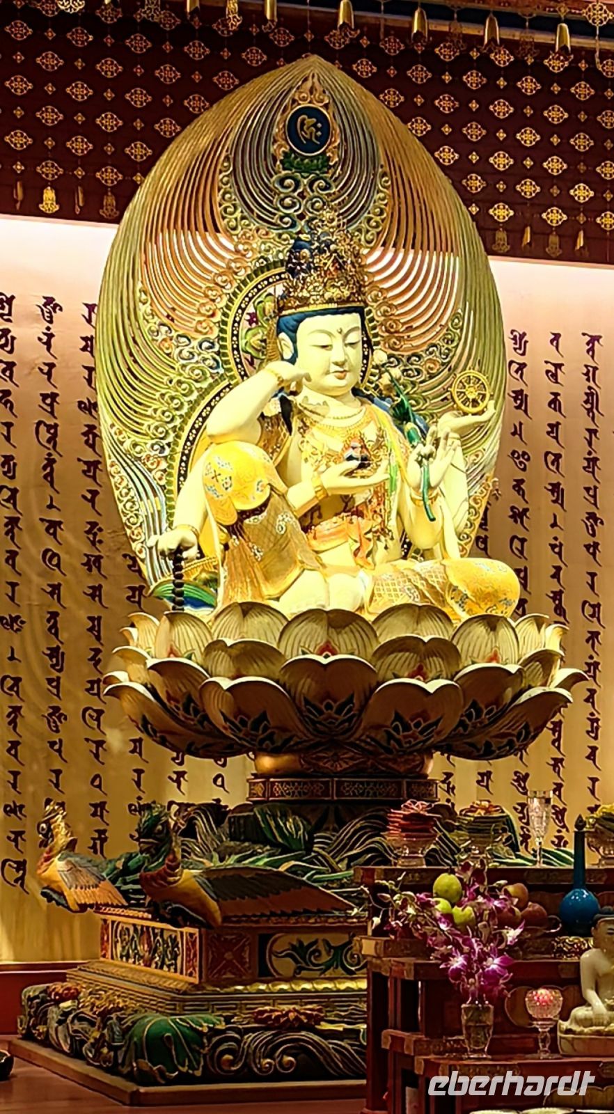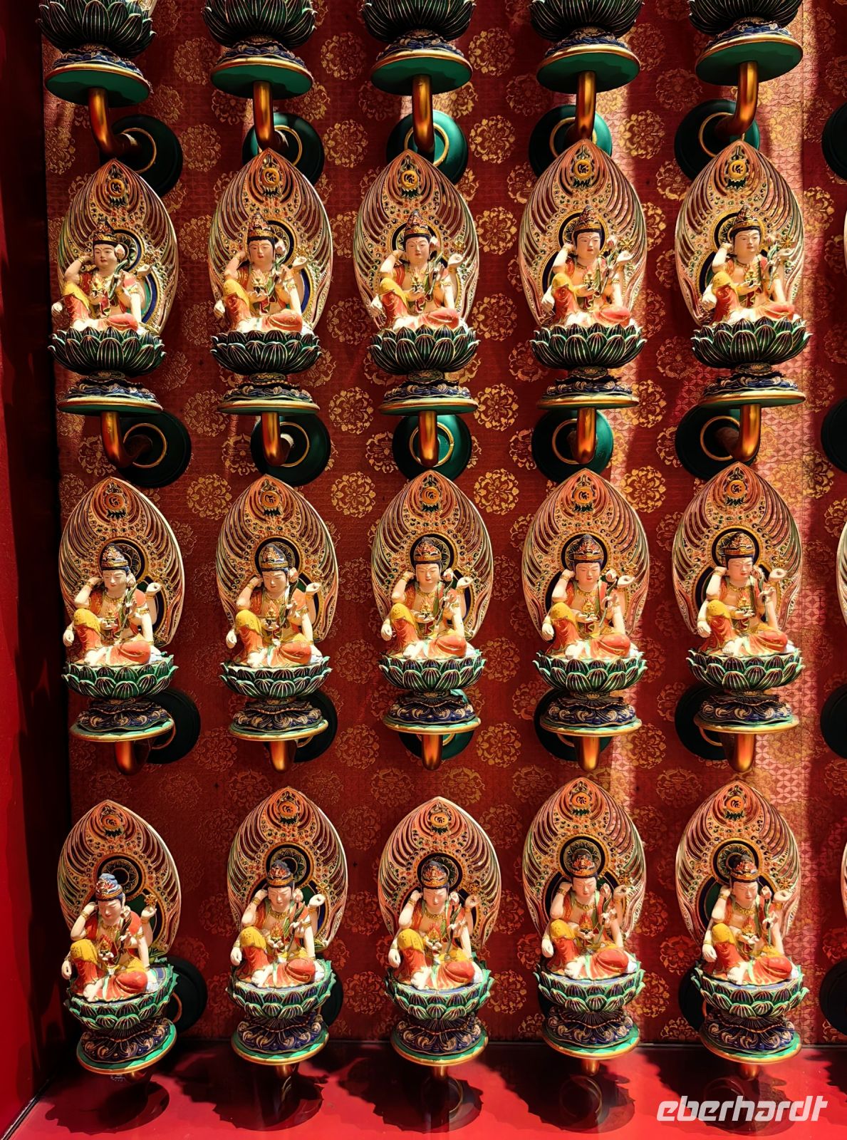 Im Anschluß besichtigen wir einen buddhistischen Tempel, wo gerade eine Gebetszeremonie zwischen riesigen goldenen Buddhastatuen abgehalten wird und wir schauen uns neugierig um. Viele Gäste errechnen ihre chinesischen Tier-Sternzeichen und es wird wild spekuliert, welches Tier mit welchem gut harmoniert oder eben nicht.