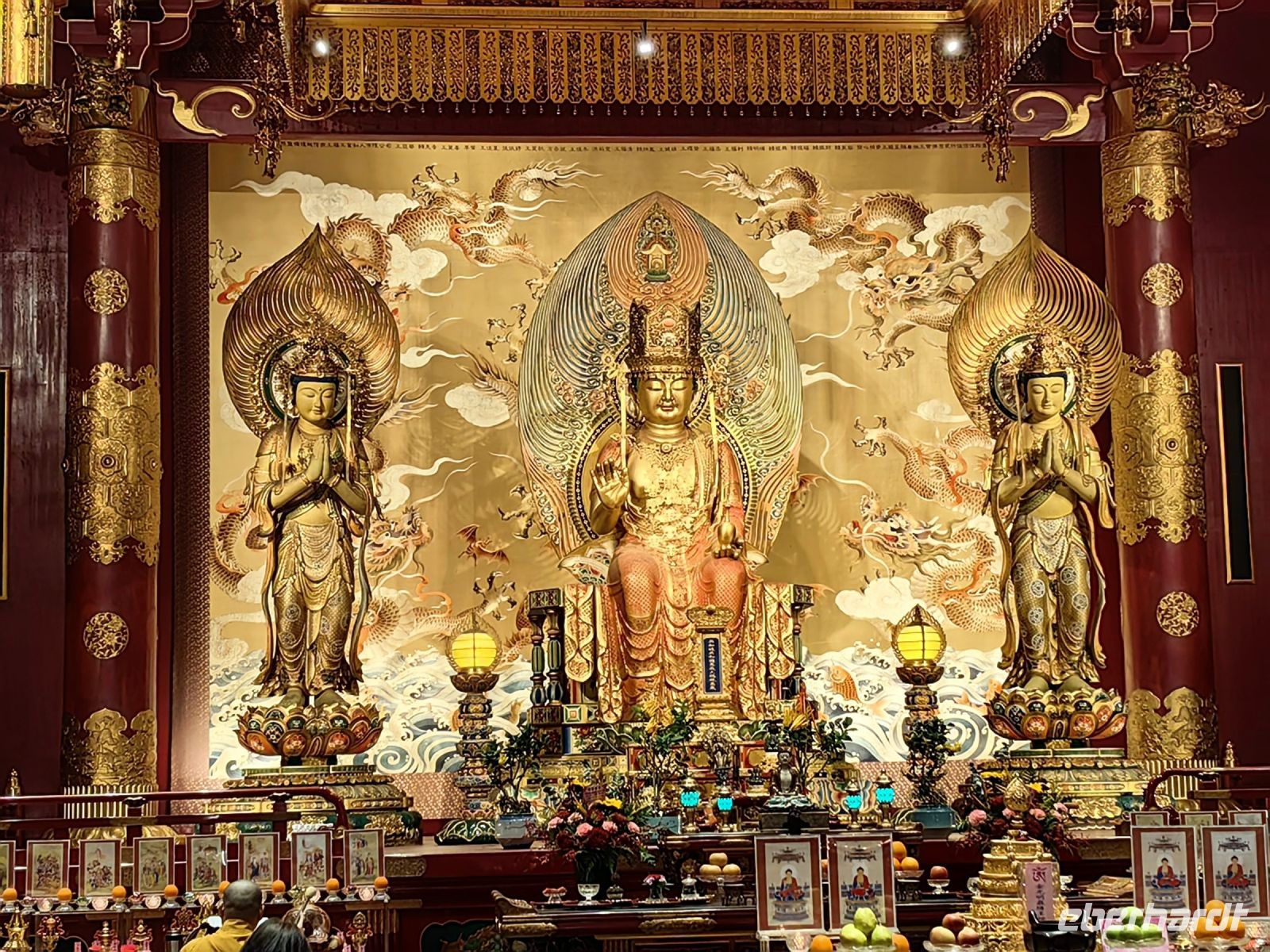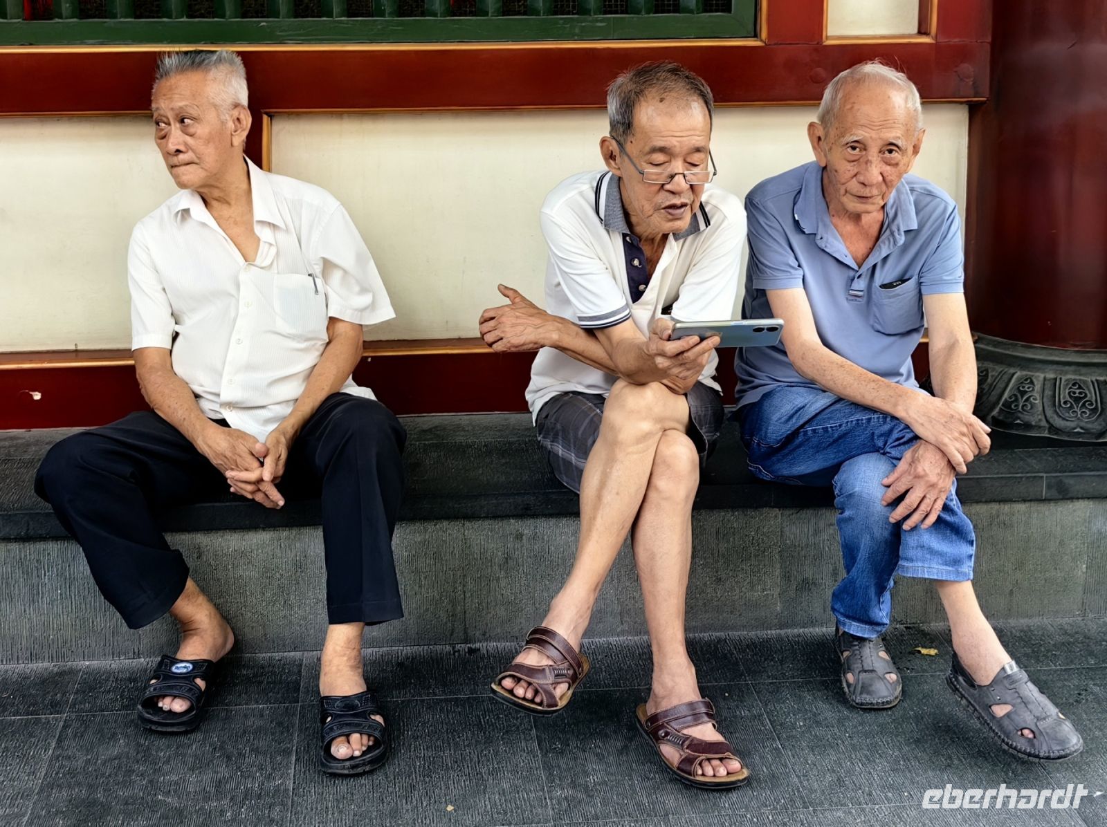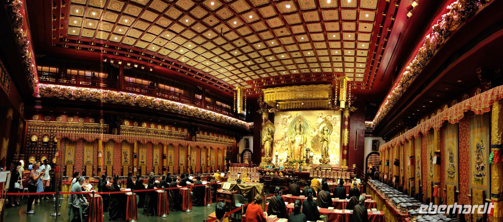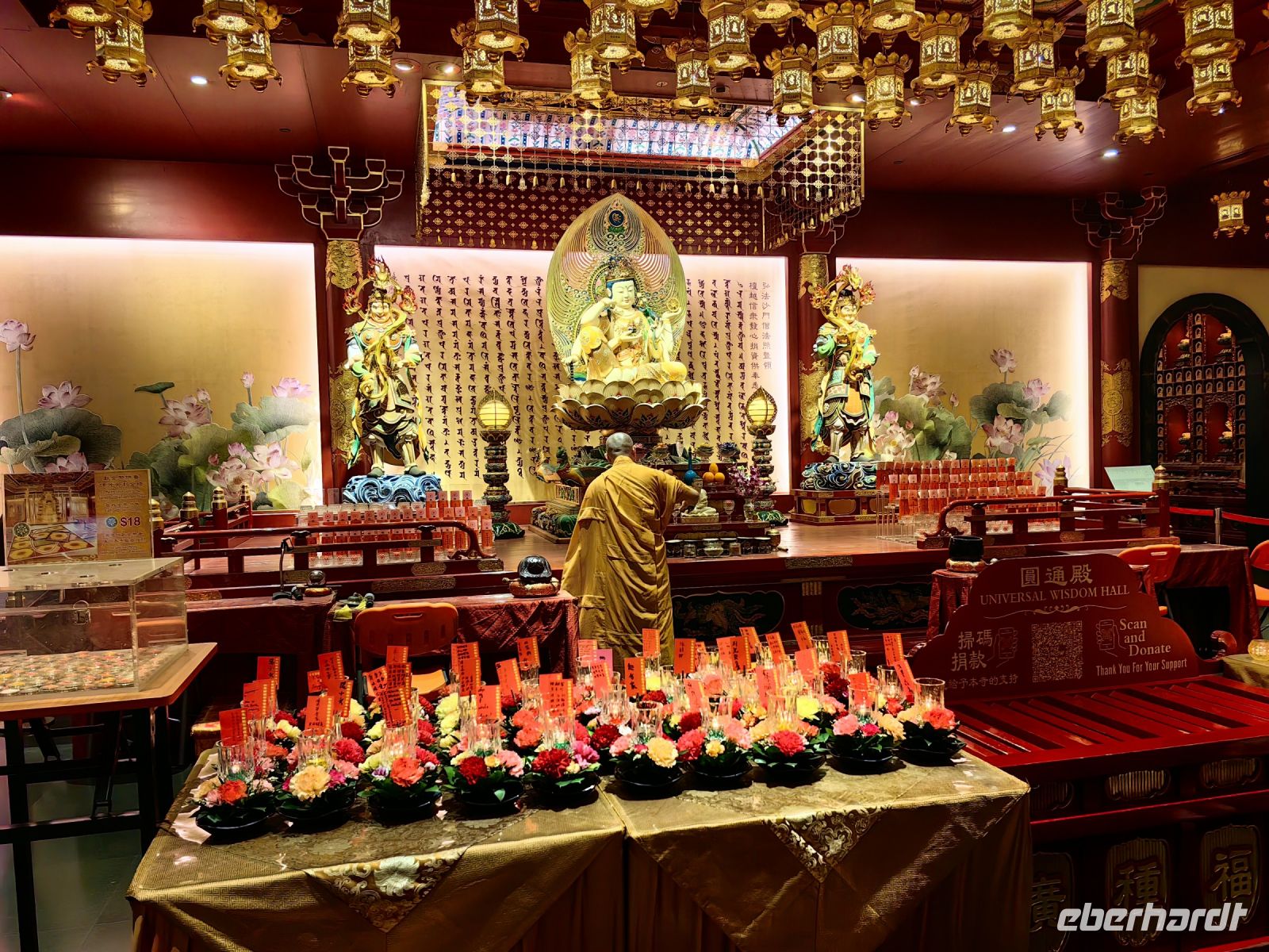 Im Anschluß besichtigen wir einen buddhistischen Tempel, wo gerade eine Gebetszeremonie zwischen riesigen goldenen Buddhastatuen abgehalten wird und wir schauen uns neugierig um. Viele Gäste errechnen ihre chinesischen Tier-Sternzeichen und es wird wild spekuliert, welches Tier mit welchem gut harmoniert oder eben nicht.
