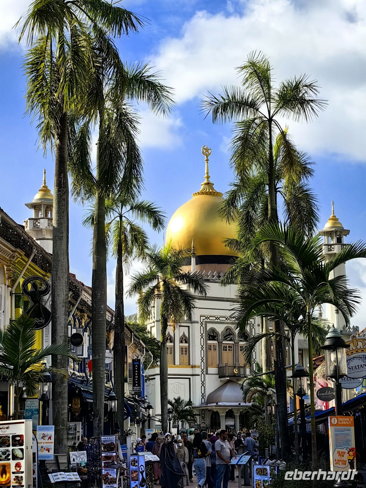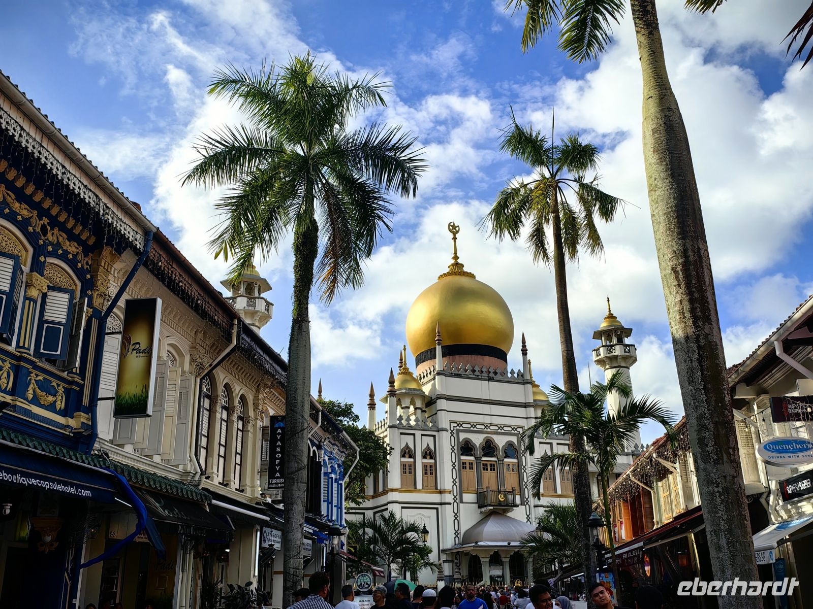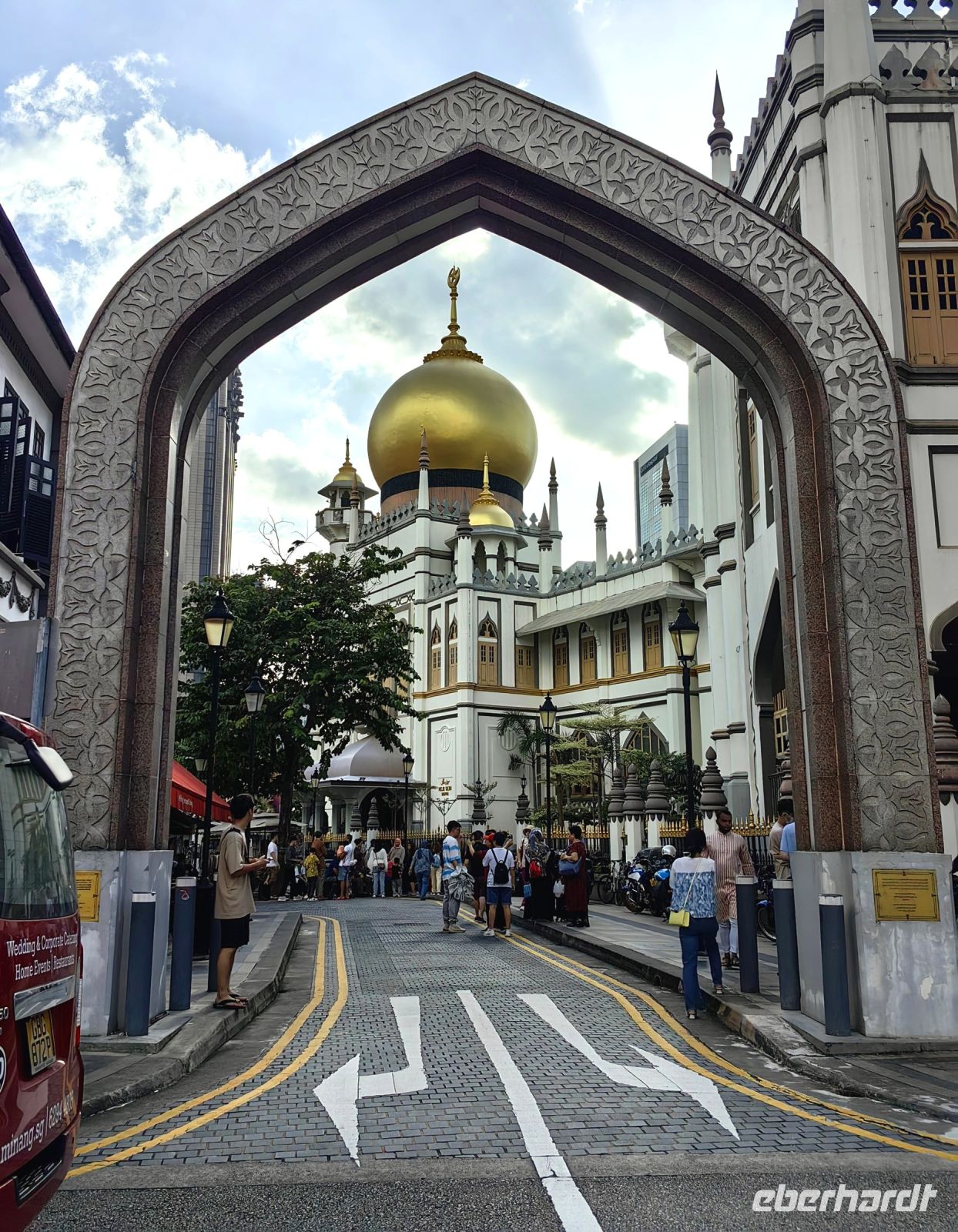 Nun fahren wir durch Little India, sehen plötzlich ein Gewirr aus Männern mit Turbanen und Frauen mit bunten Saris und fühlen uns wie in Bombay. Leider wird in dem Viertel gerade viel renoviert, die Hälfte der Straßen wird verbreitert, alles ist abgesperrt und so können wir nicht pausieren. Dafür haben wir in Little Arabia mehr Zeit und dieses Viertel verzaubert uns besonders mit den schönen alten Fassaden aus der Kolonialzeit und der alles überragenden Sultanmoschee mit ihrer imposanten goldenen Kuppel.