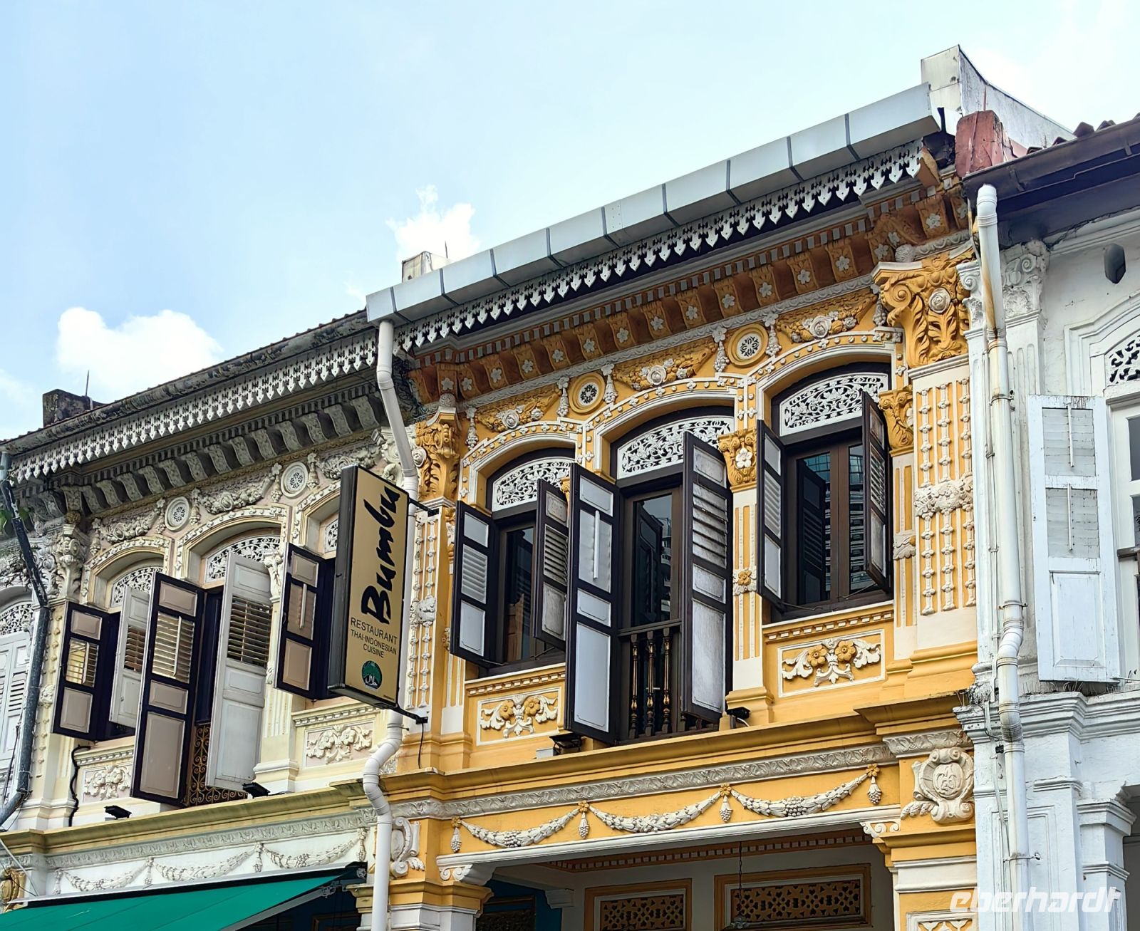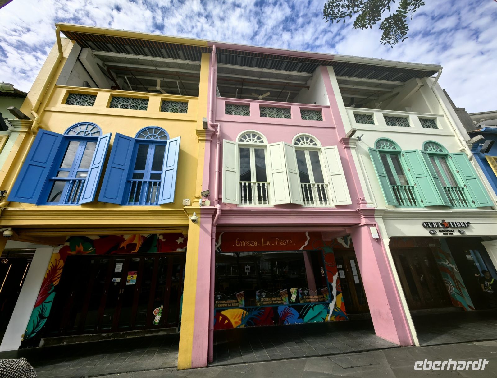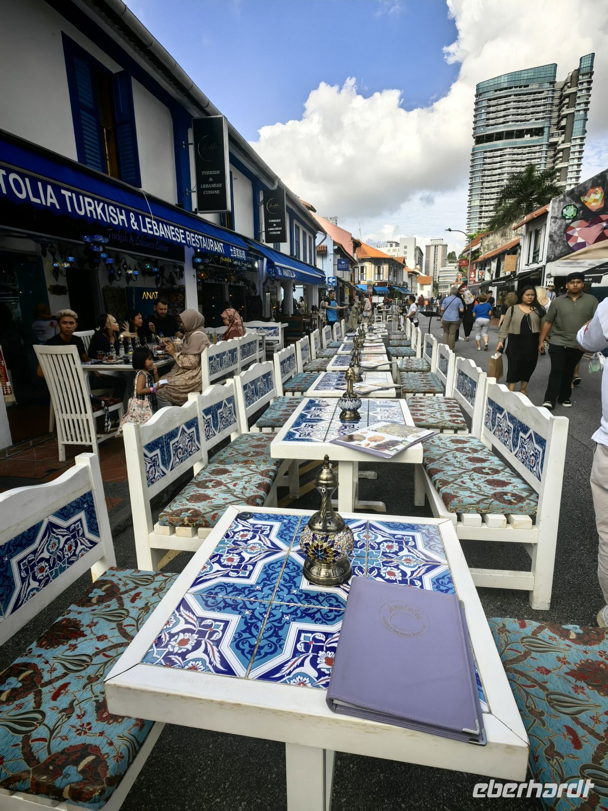 Nun fahren wir durch Little India, sehen plötzlich ein Gewirr aus Männern mit Turbanen und Frauen mit bunten Saris und fühlen uns wie in Bombay. Leider wird in dem Viertel gerade viel renoviert, die Hälfte der Straßen wird verbreitert, alles ist abgesperrt und so können wir nicht pausieren. Dafür haben wir in Little Arabia mehr Zeit und dieses Viertel verzaubert uns besonders mit den schönen alten Fassaden aus der Kolonialzeit und der alles überragenden Sultanmoschee mit ihrer imposanten goldenen Kuppel.