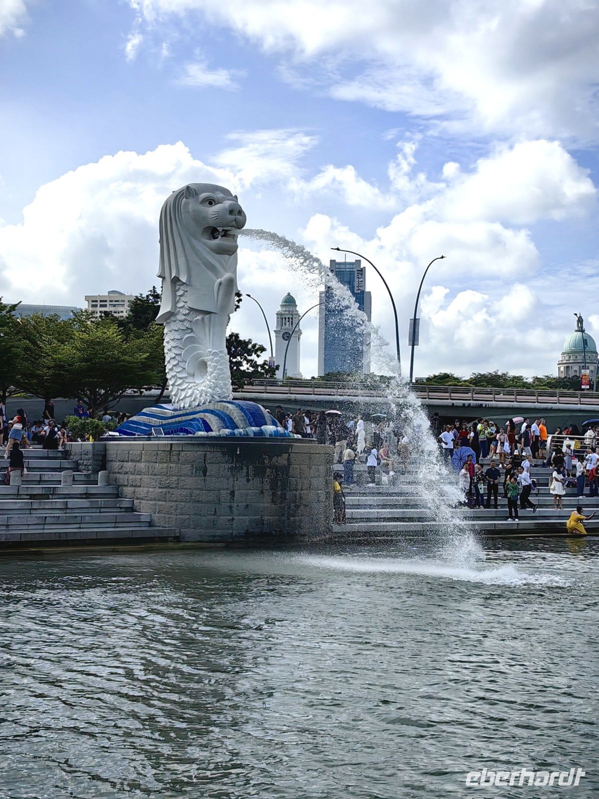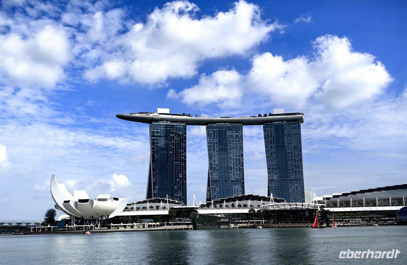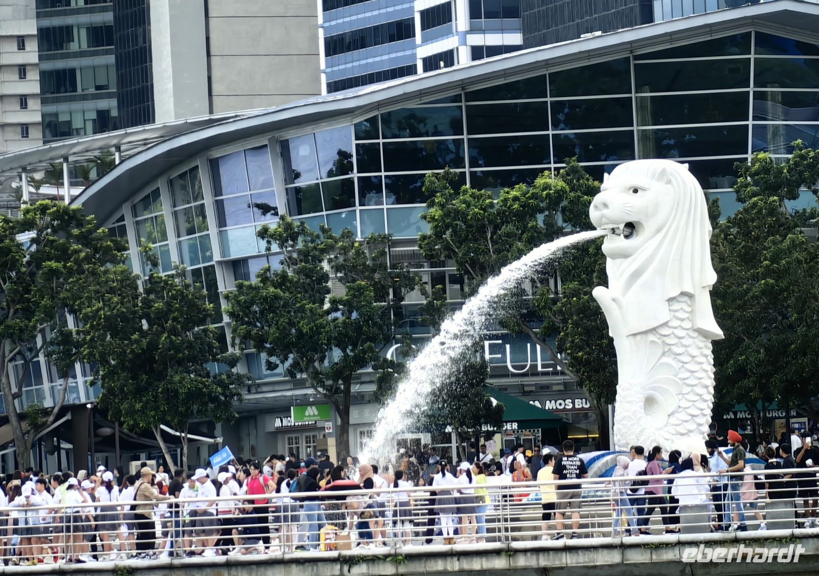 Danach macht Martine den Vorschlag, bei dem hervorragenden Wetter die Aussicht auf die Marina von einem Boot aus zu genießen und fast alle Gäste sind begeistert von dieser Idee und kommen mit. So schippern wir entlang des Clarke Quay, sehen den Merlion, das Wahrzeichen Singapurs und können Traumfotos vom Marina Bay Sands Hotel schießen. Dieser Ausflug bei azurblauem Himmel wird uns unvergessen bleiben.