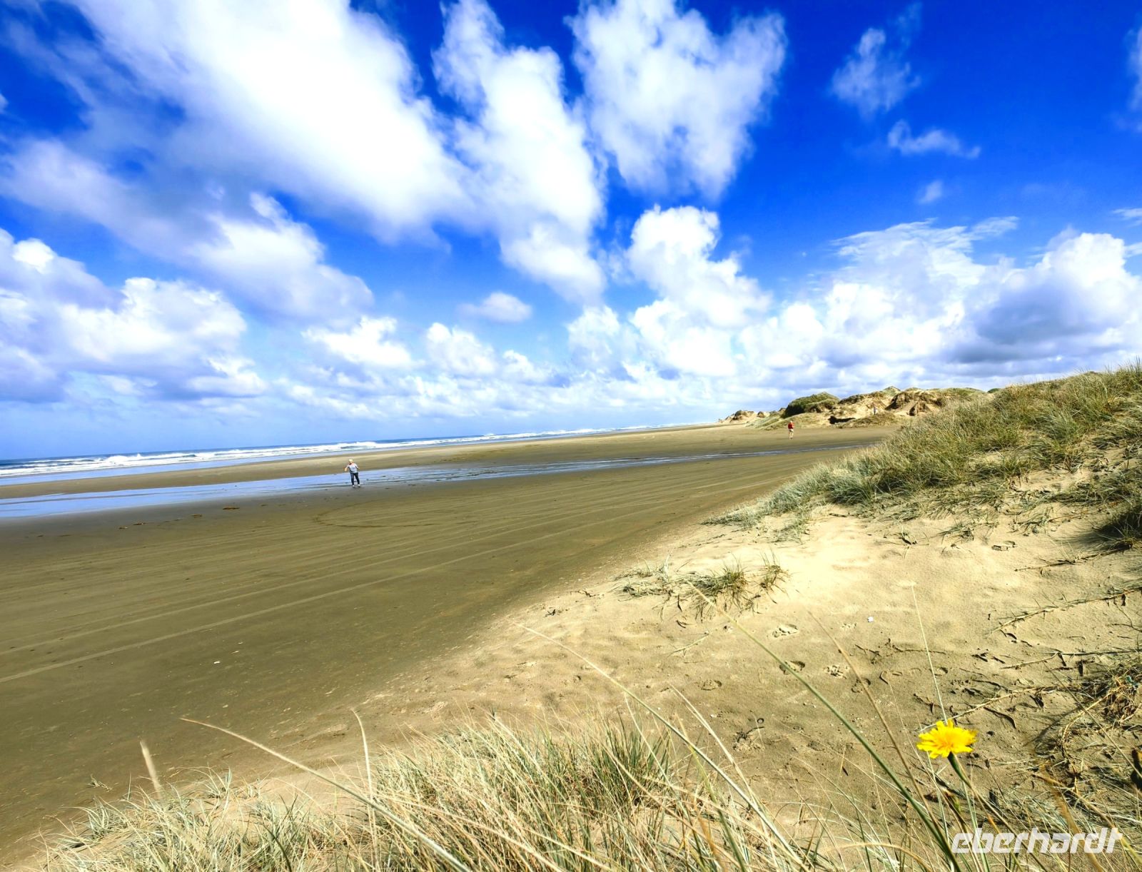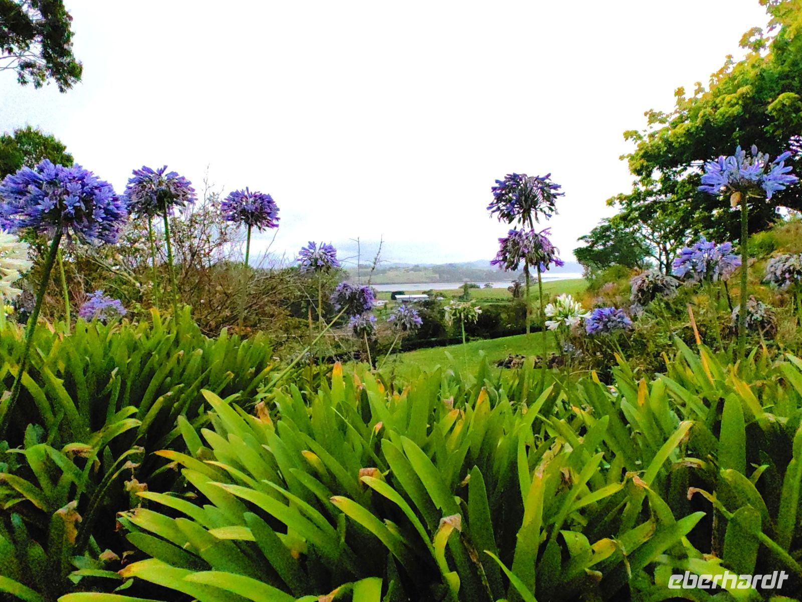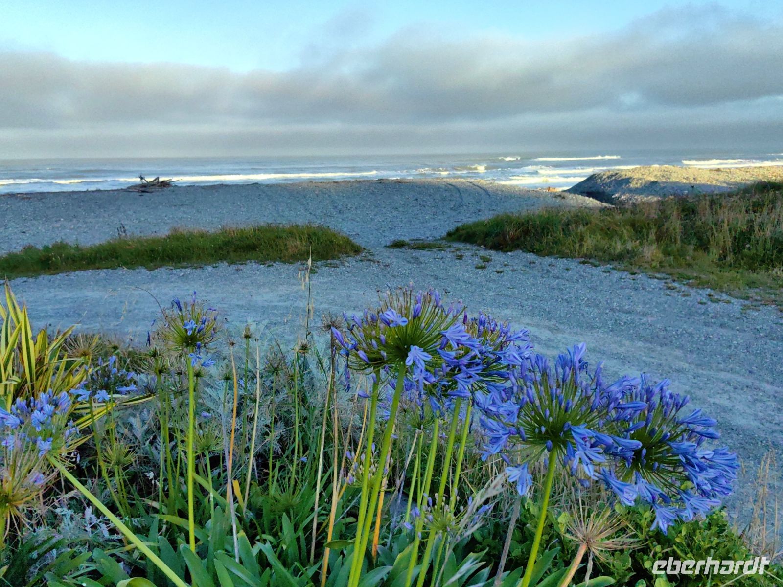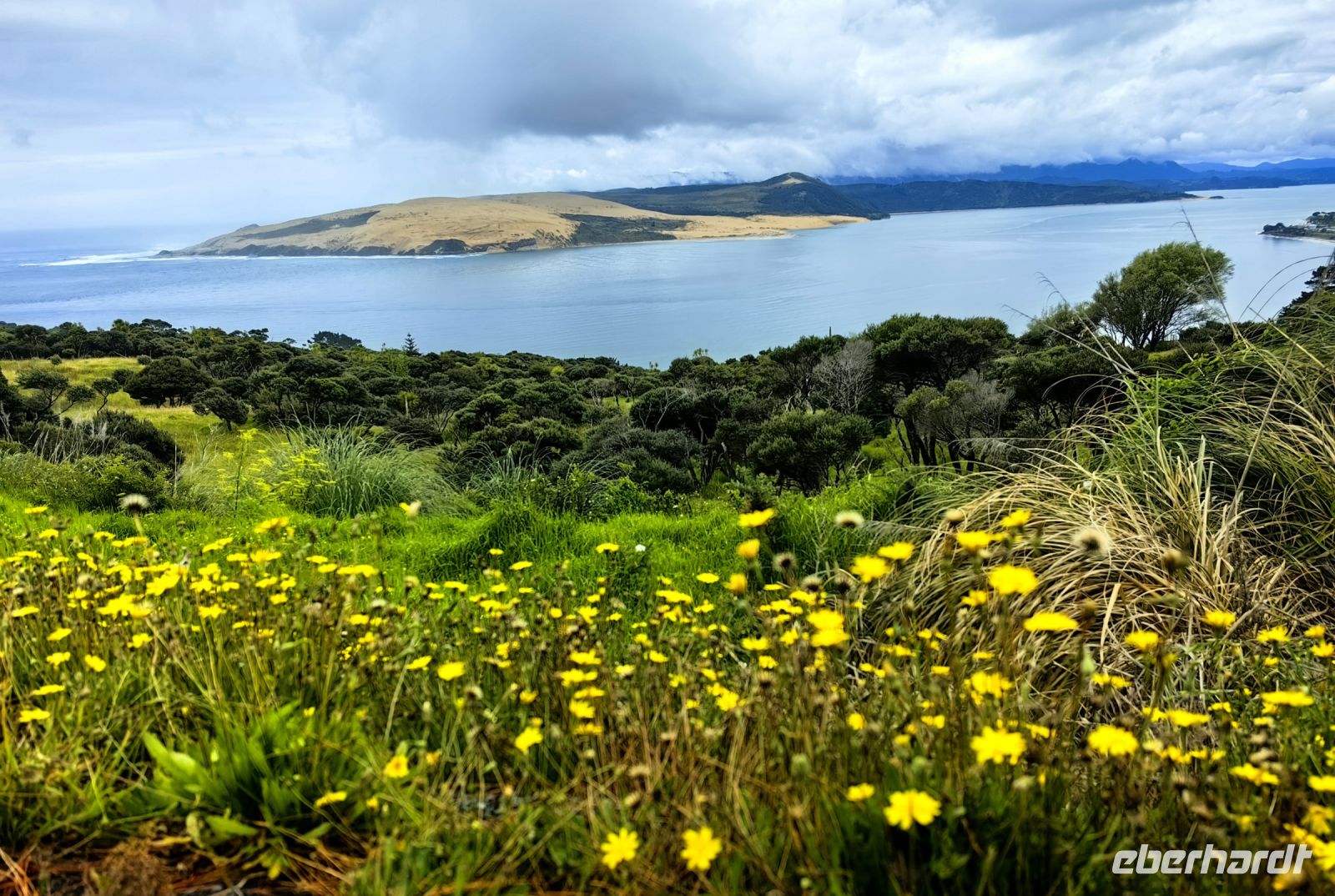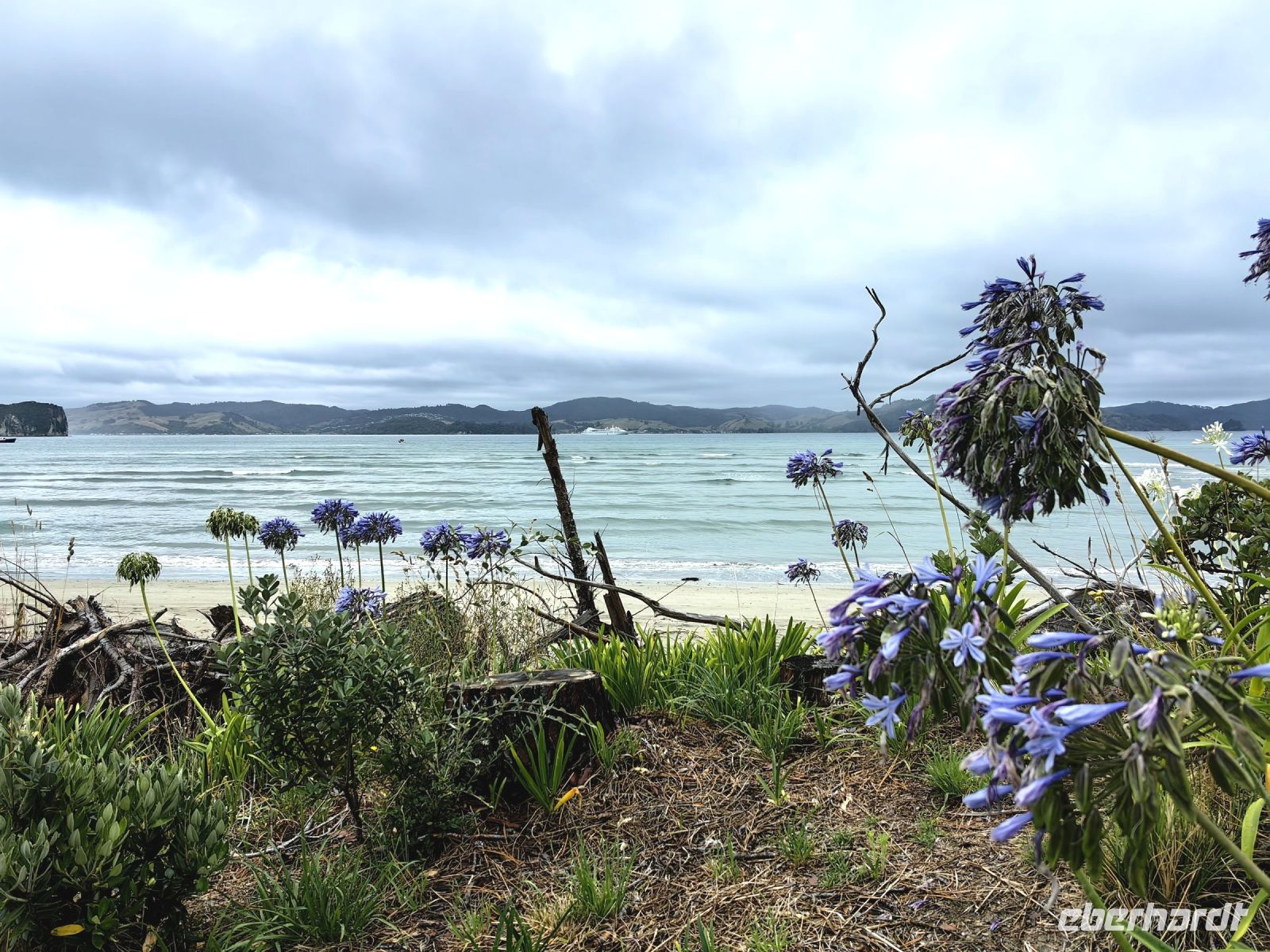 Am kleinen Hokiangahafen können wir die Auswirkungen der früheren Brandrodungen sehen, nichts als kahle Sanddünen sind vom einstigen alles bedeckenden Wald geblieben. Diese sehen allerdings trotz des immer noch trüben Wetters hinter den üppig blühenden Acapantus für uns immer noch faszinierend schön aus.