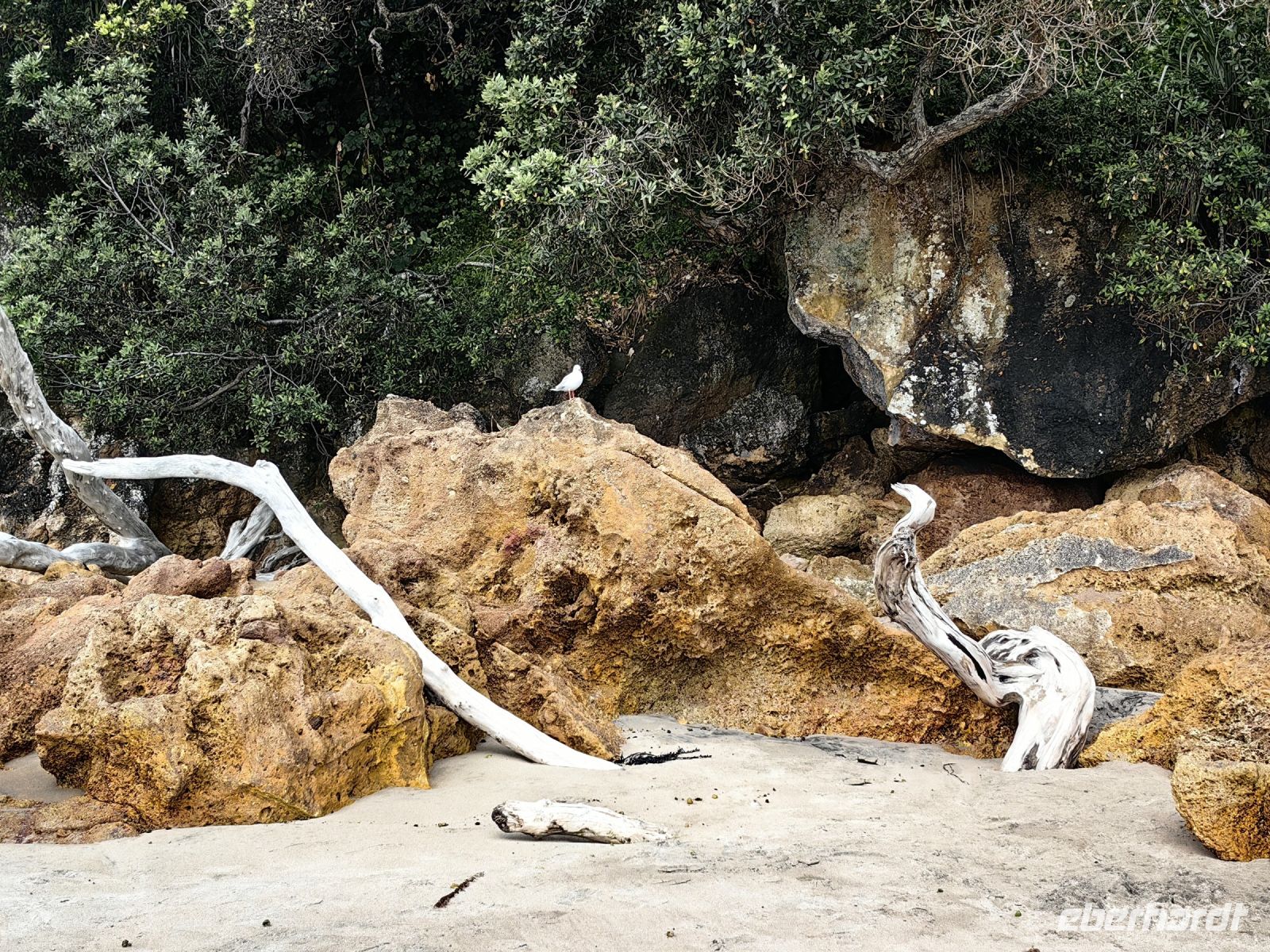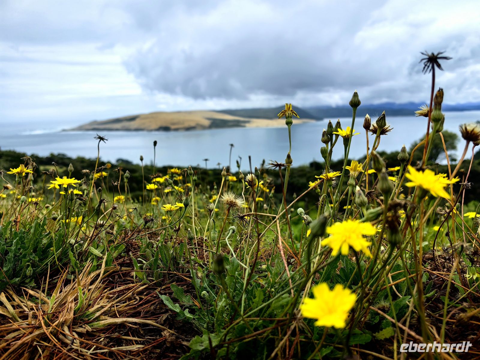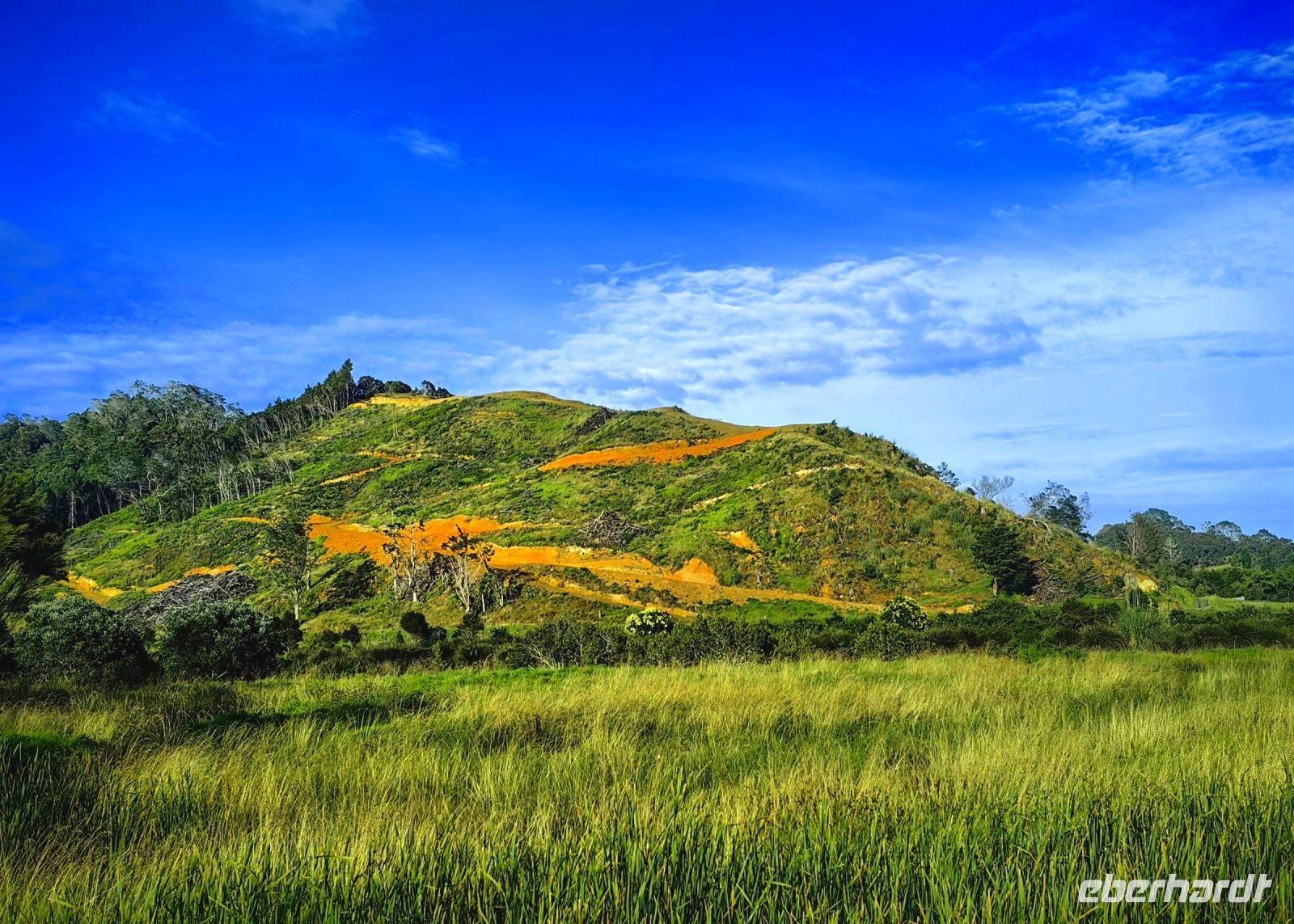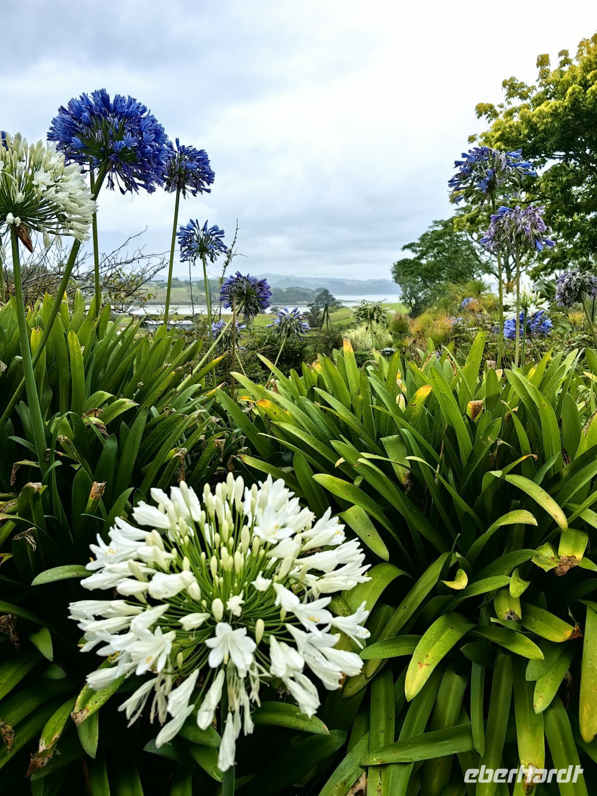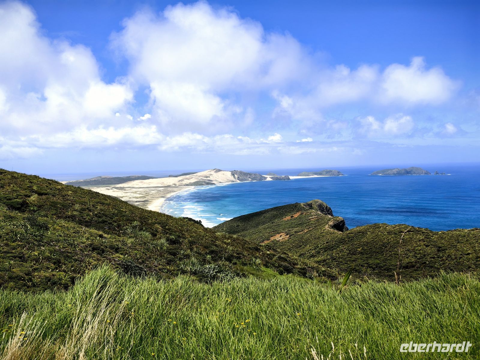 Am kleinen Hokiangahafen können wir die Auswirkungen der früheren Brandrodungen sehen, nichts als kahle Sanddünen sind vom einstigen alles bedeckenden Wald geblieben. Diese sehen allerdings trotz des immer noch trüben Wetters hinter den üppig blühenden Acapantus für uns immer noch faszinierend schön aus.