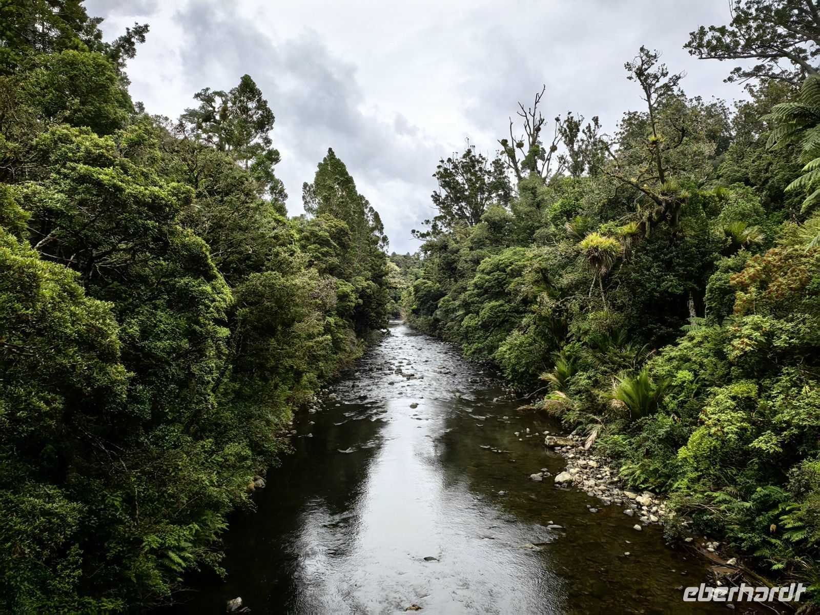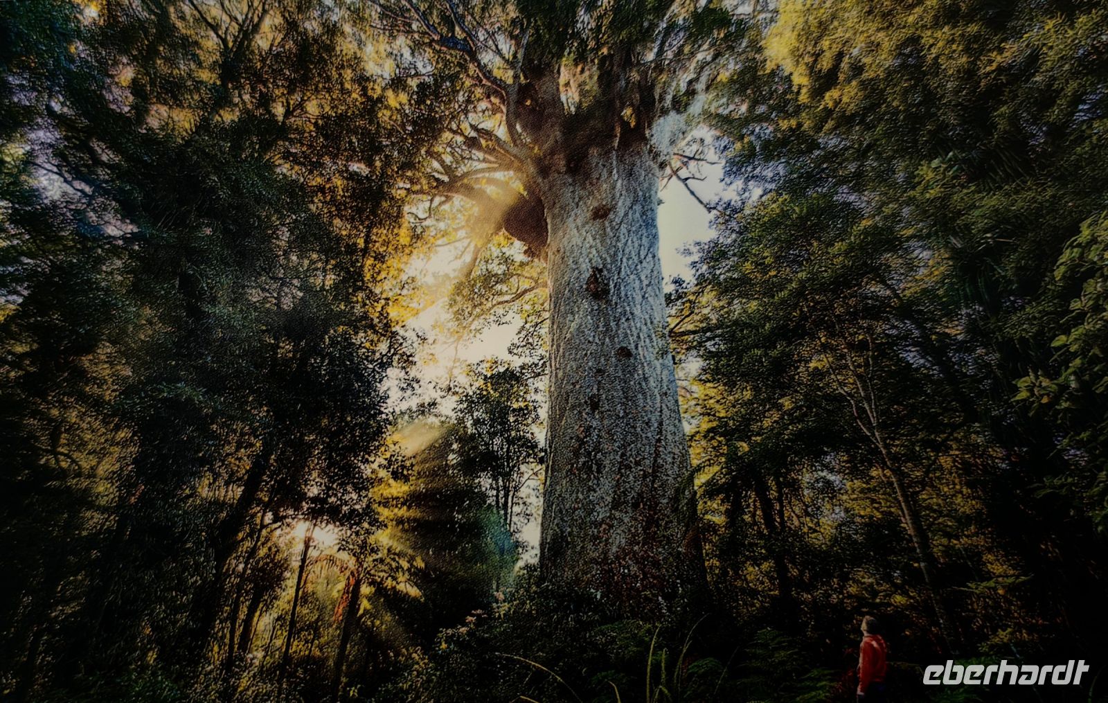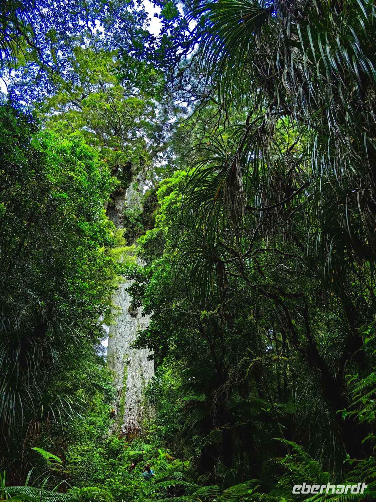 Auf dem Weg zum Waipoua-Wald sehen wir rechts und links der gewundenen Straße die verbliebenen Kauribäume, deren Stammdurchmesser bis zu acht Meter erreichen kann. Durch richtigen Urwald schreiten wir gespannt zum Tane Mahuta, dem Wächter des Waldes, dem wahrscheinlich größten Baum, den wir alle jemals im Leben zu Gesicht bekommen haben. Vor diesem Riesen stehen wir wie gebannt und versuchen recht verzweifelt, ihn im ganzen auf ein Foto zu bekommen. Wir Menschen sehen neben diesem Giganten wie kleine Ameisen aus. Dieser an der Westküste nördlich von Dargaville gelegene Urwald ist der berühmteste Kauriwald in ganz Neuseeland und die Magie darin ist deutlich spürbar. Farbenfrohe Farne und subtropisch anmutendes Dickicht säumen den Weg und der größte Kauribaum des Landes steht hier seit bereits 2.000 Jahren. Neben seinen etwa 18 Metern Stammhöhe und 4,5 Metern Stammdurchmesser wirkt unser recht großer Alec wie eine kleine Fliege. Den "Herrn des Waldes" werden wir sicher nicht so schnell vergessen.
