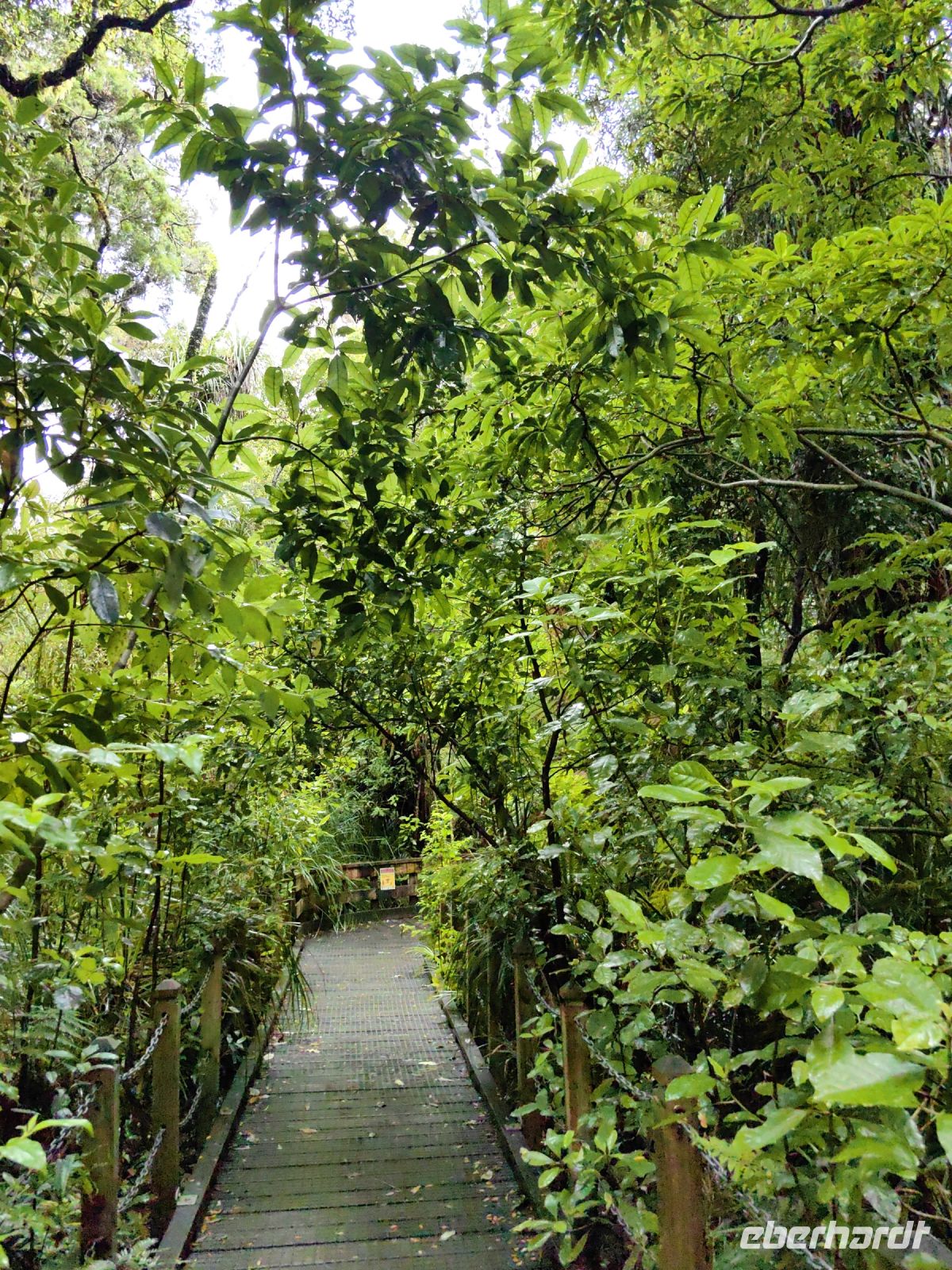 Danach zieht sich der graue Himmel noch mehr zu, wir lassen uns aber nicht aufhalten und wandern mitten durch den dichten Wald zu einem schönen Aussichtspunkt. Nach dem Waldspaziergang machen wir eine Mittagspause, eigentlich war sie am Strand geplant, aber mittlerweile regnet es so stark, daß wir den Platz in einem Café vorziehen.
