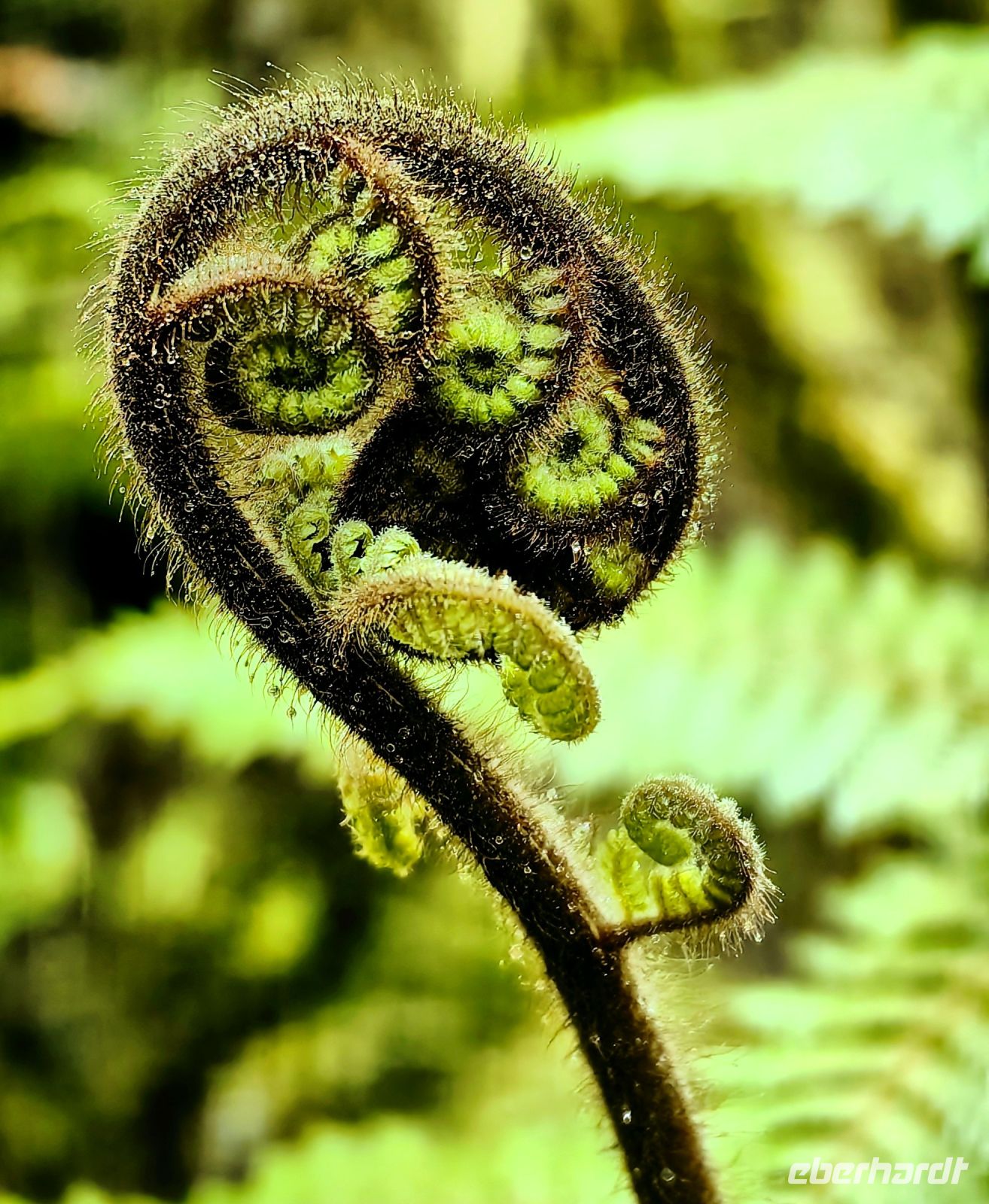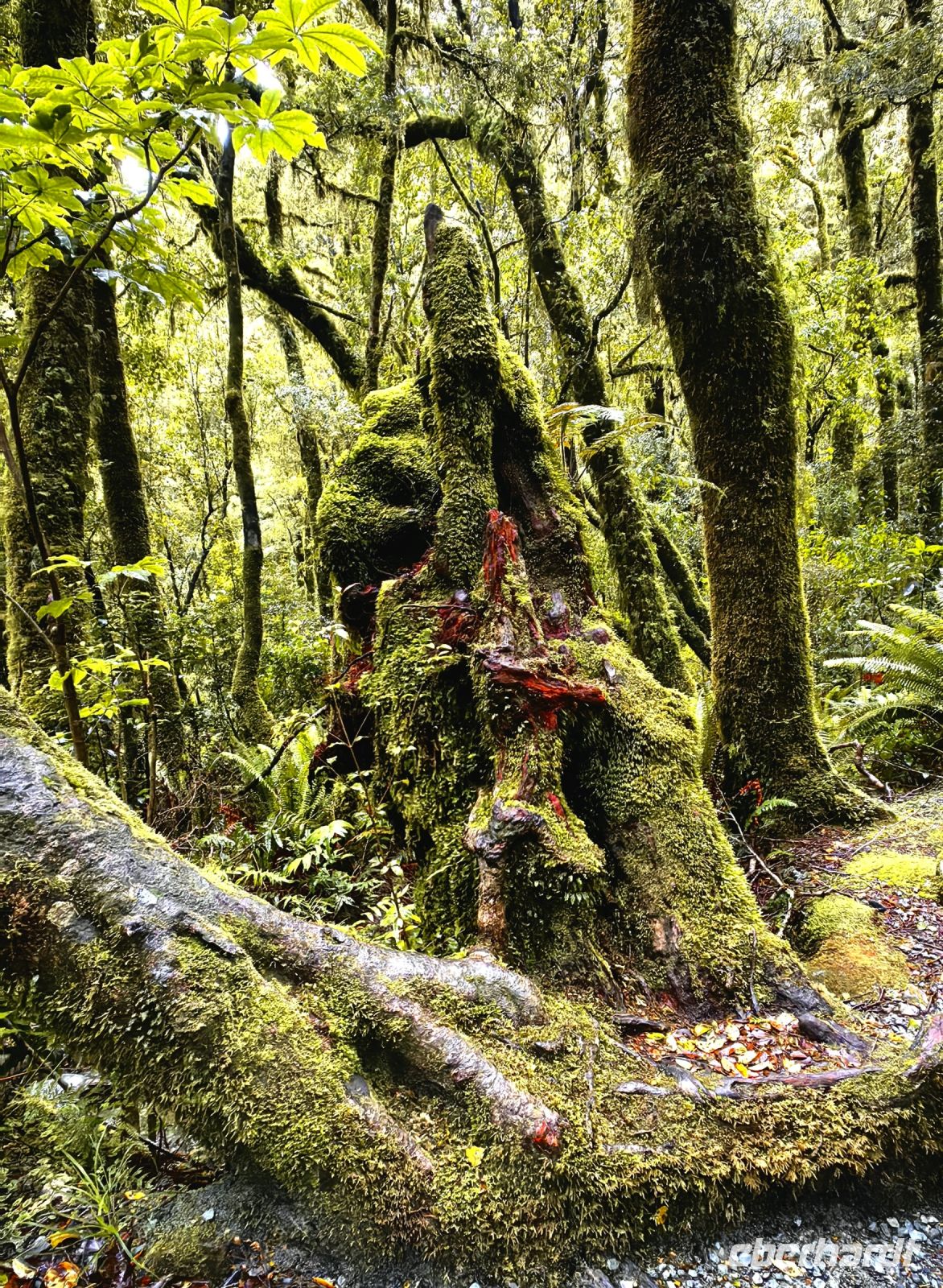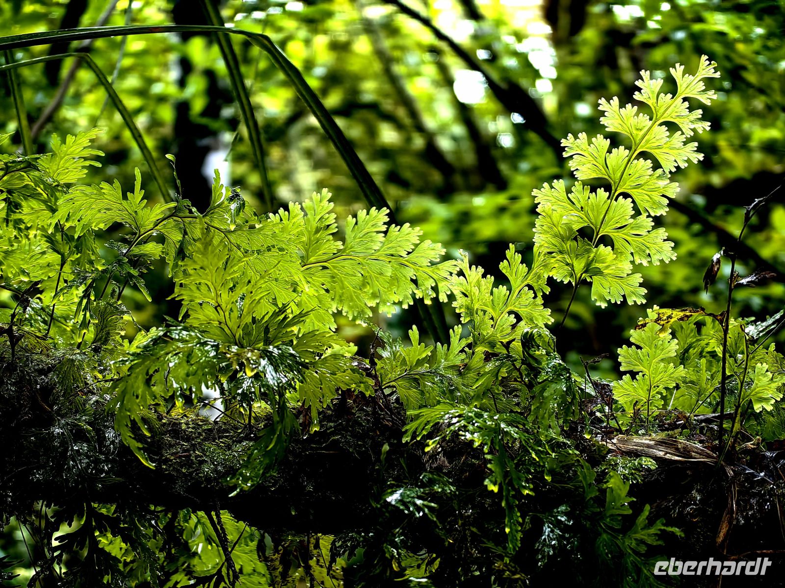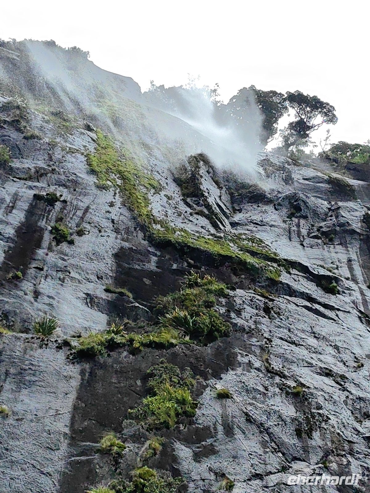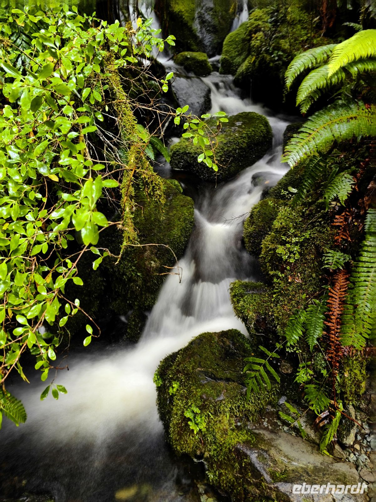 Gegen neun Uhr läßt uns der Kapitän wieder am Hafen aussteigen und Hampi erwartet uns mit dem Bus. Die kurvenreiche Straße, die wir gekommen sind, müssen wir bis Te Anau auch wieder zurück. Eine andere Verbindung gibt es nicht. Mitten im Bergregenwald unternehmen wir gemeinsam einen Spaziergang, um einen Eindruck von einem wirklichen Urwald zu bekommen. Hier gibt es meterhohe Farne, Fuchsien, die an Bäumen blühen, unzählige Moose und Flechten die jegliche Stämme überwuchern, Tillandsien, die von den Ästen hängen und aussehen wie lockiges Elfenhaar und da es in der vergangenen Nacht üppig geregnet hat, sind die verschiedenen Grüntöne besonders intensiv und um uns herum tropft es nur so. Einige Wasserfälle bahnen sich ihren Weg durch das dichte Grün. Kein botanischer Garten der Welt kann so etwas vermitteln, das muß man einfach selbst erlebt haben.