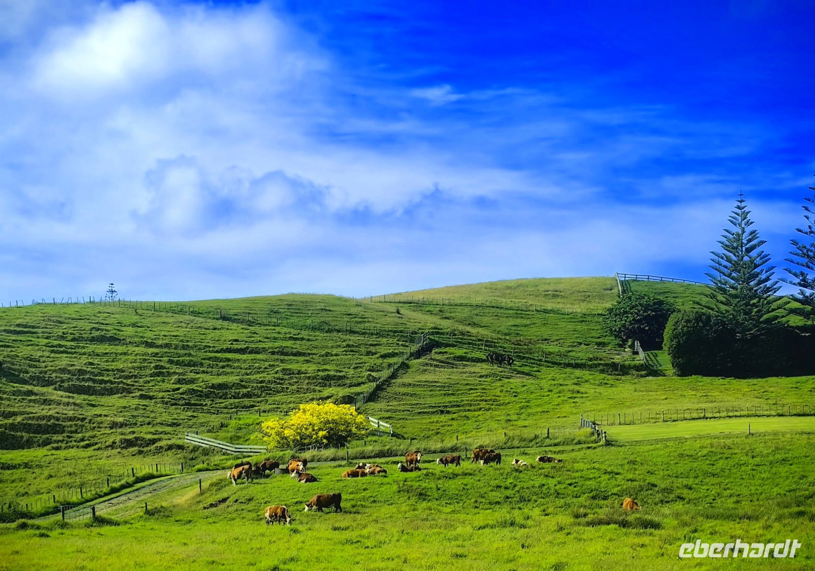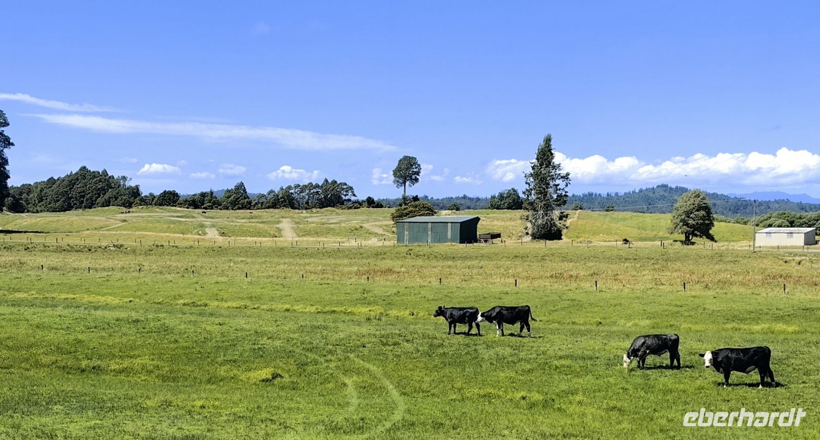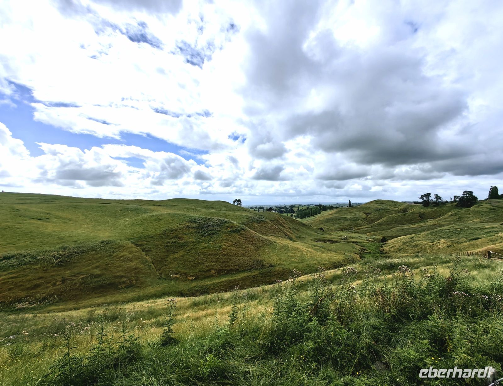 Heute morgen müssen wir alle früh aufstehen, der äußerste Nordwesten ist unser Ziel. Obwohl Neuseeland auf einer Weltkarte winzig aussieht, haben wir eine Strecke von fast 400 Kilometern vor uns und das erste Mal seit unserer Ankunft scheint heute die Sonne. Das läßt die hügelige Landschaft mit den vielen weidenden Schafen und Kühen noch bezaubernder aussehen. Wir fahren an Orangen-, Avocado- und Kiwianbaugebieten vorbei und Liam, unserer heutiger Fahrer, erzählt uns viele Geschichten über die Region. Die Maori lebten hier einst auf den Anhöhen der Berge. Ihre Dörfer ließen sich so weit oben am besten vor feindlichen Angriffen verteidigen. Die Hügel wurden oben eingeebnet und nach unten terrassiert. Auf diesen Terrassen bauten die neuseeländischen Ureinwohner Gemüse, Taro und Süßkartoffeln an. Diese Terrassierungen sind bis heute gut zu erkennen.