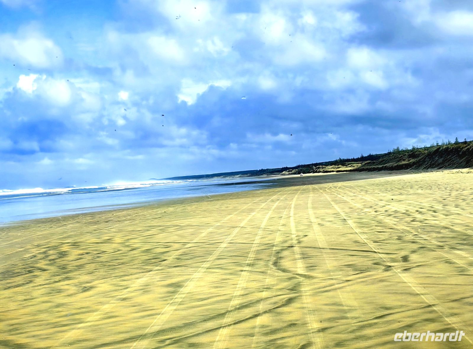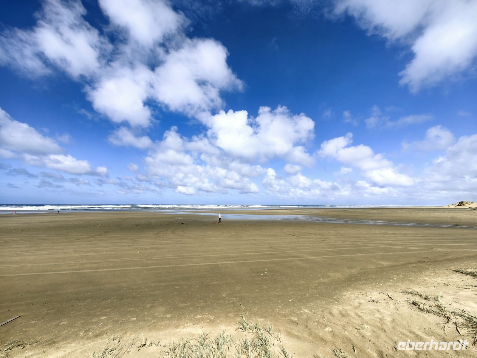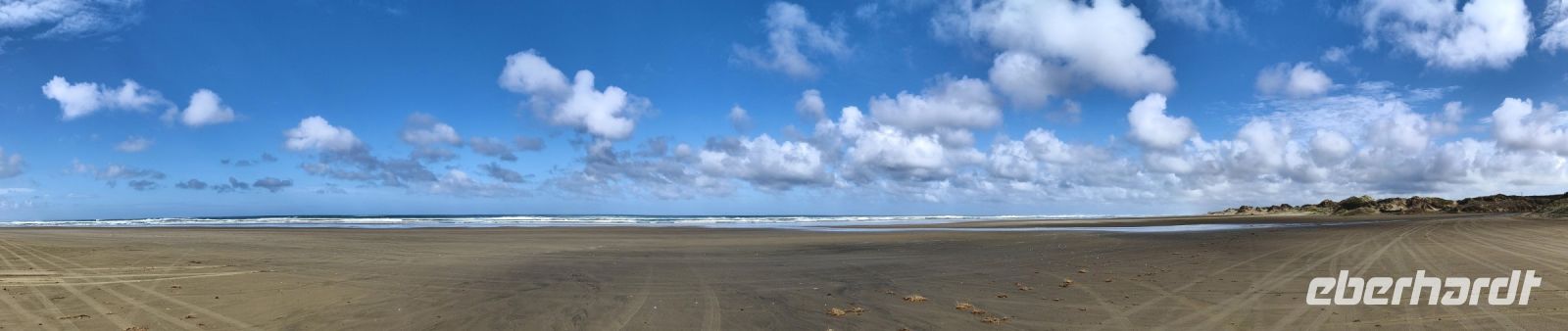 Ganz unvermittelt biegt Liam plötzlich von der Straße ab, wir verlassen den Asphalt und fahren auf dem 90 Miles Highway am Strand entlang mitten im Sand! Es gibt weder eine Straßenmarkierung noch eine Ausschilderung. In Deutschland undenkbar! Die Henderson Bay ist ein traumhaft schöner, einsamer Strand an dem wir fasziniert auf die sich auftürmenden Wellen schauen. Bei unserer Pause nehmen sich einige Mutige die Sandboards und brausen die Dünen hinunter, andere Gäste gehen auf Muschelsuche, zwei posieren in den Dünen für schöne Erinnerungsfotos und jeder genießt das Rauschen des Meeres und das unendliche Gefühl von Freiheit und Weite.