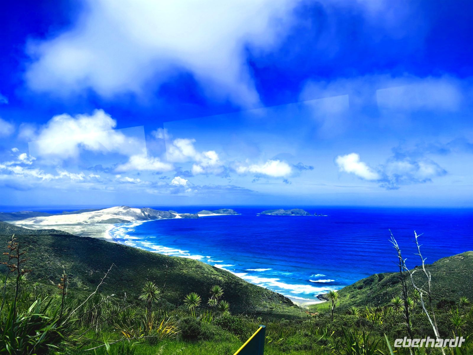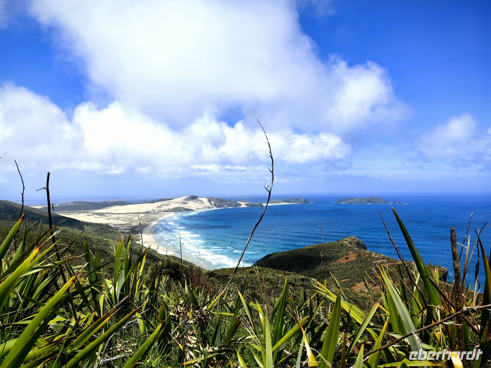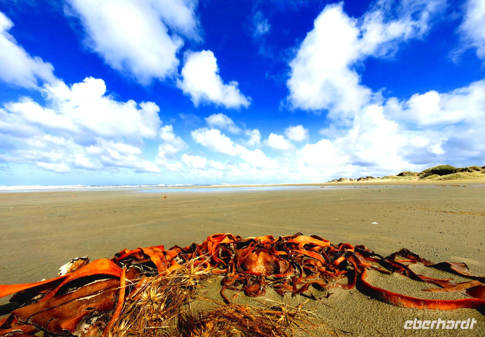 Ganz unvermittelt biegt Liam plötzlich von der Straße ab, wir verlassen den Asphalt und fahren auf dem 90 Miles Highway am Strand entlang mitten im Sand! Es gibt weder eine Straßenmarkierung noch eine Ausschilderung. In Deutschland undenkbar! Die Henderson Bay ist ein traumhaft schöner, einsamer Strand an dem wir fasziniert auf die sich auftürmenden Wellen schauen. Bei unserer Pause nehmen sich einige Mutige die Sandboards und brausen die Dünen hinunter, andere Gäste gehen auf Muschelsuche, zwei posieren in den Dünen für schöne Erinnerungsfotos und jeder genießt das Rauschen des Meeres und das unendliche Gefühl von Freiheit und Weite.