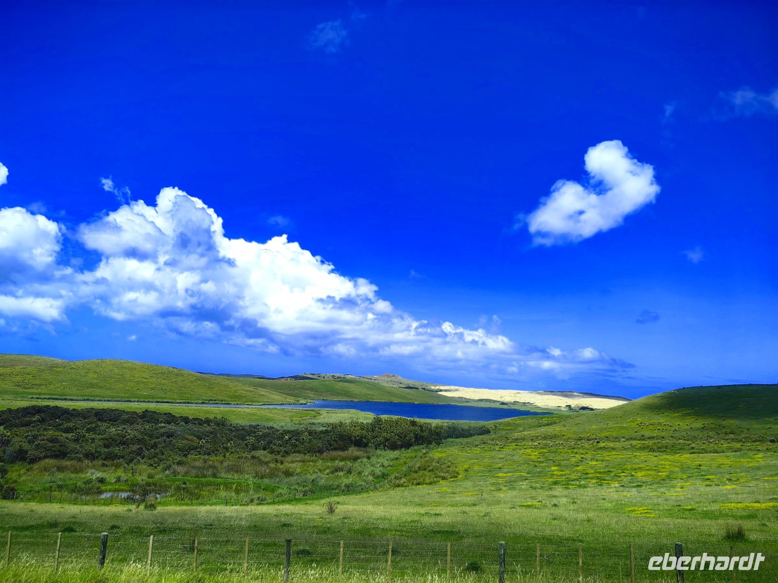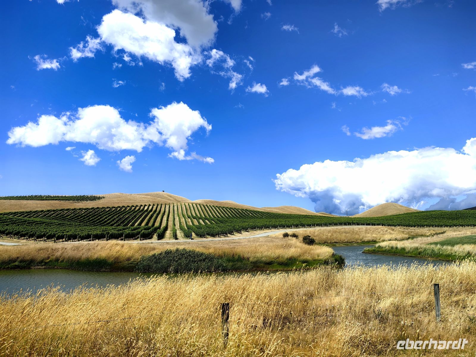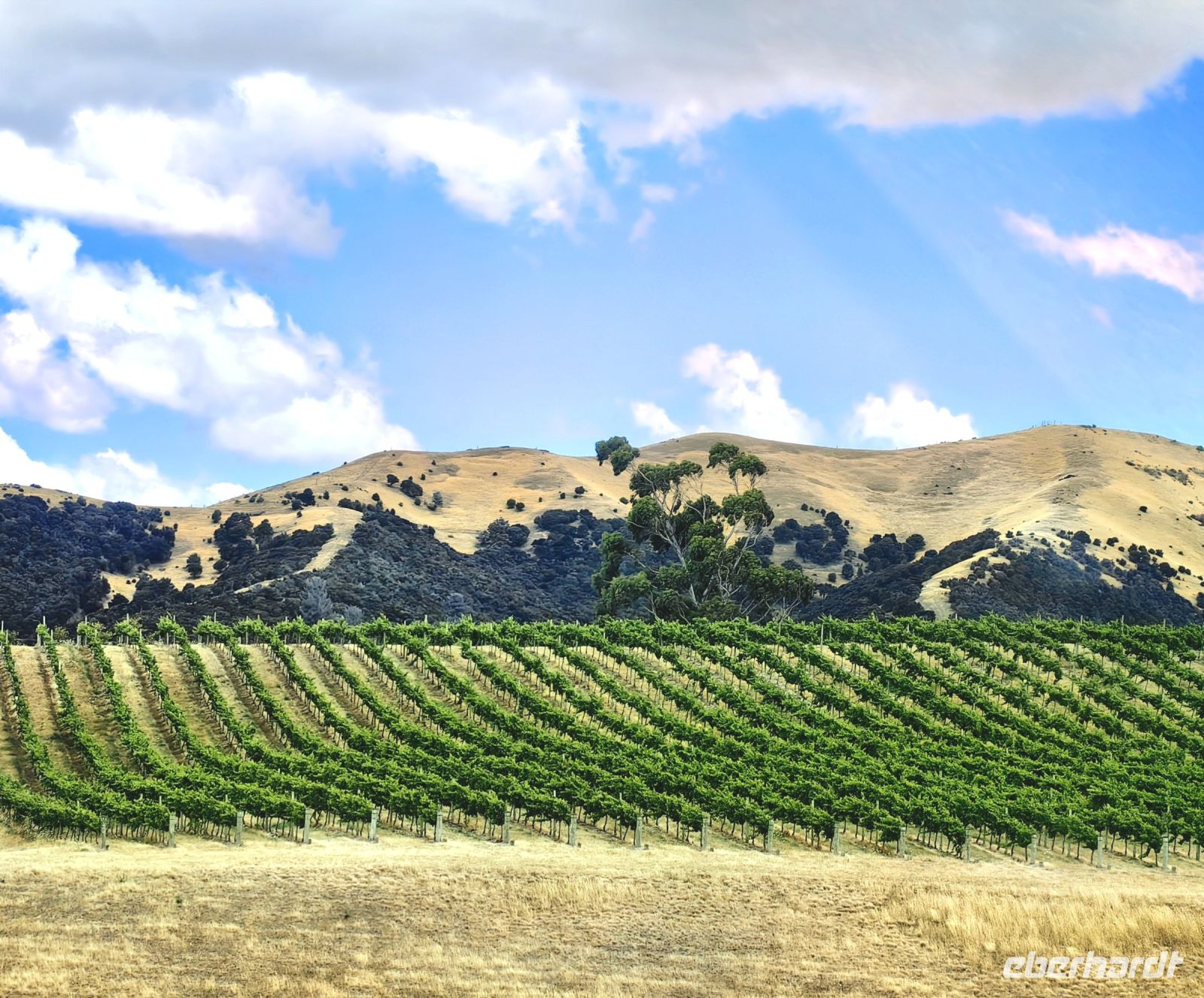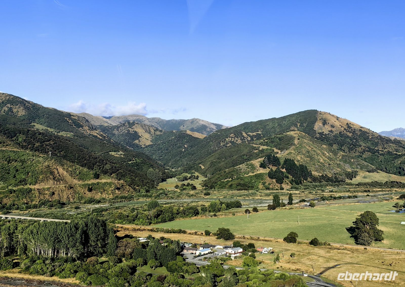 Wir genießen diese Fahrt sehr und schaukeln gemütlich auf die Südinsel zu, wo Hampi, unser Reiseleiter schon auf uns wartet. Weiter fahren wir mit unserem kleinen Bus an der Ostküste des Landes in Richtung Kaikoura. Die Südinsel des Landes ist wesentlich größer als ihre "Schwester" im Norden und wird durch die 35 Kilometer breite Cookstraße von der dichter besiedelten Nordinsel getrennt. Hier im Süden liegt der höchste neuseeländische Berg in den Neuseeländischen Alpen, der Mount Cook mit 3.724 Metern Höhe. Die Landschaft ist völlig anders als die, die wir in den letzten Tagen gesehen haben. Die sanften Hügel sind karg und trocken, nur wenige Bäume stehen vereinzelt an den Hängen. Bis zum Horizont ziehen sich die riesigen Weinanbaugebiete hin und bilden das einzige Grün, sie müssen allerdings künstlich bewässert werden, da es zu wenig regnet.