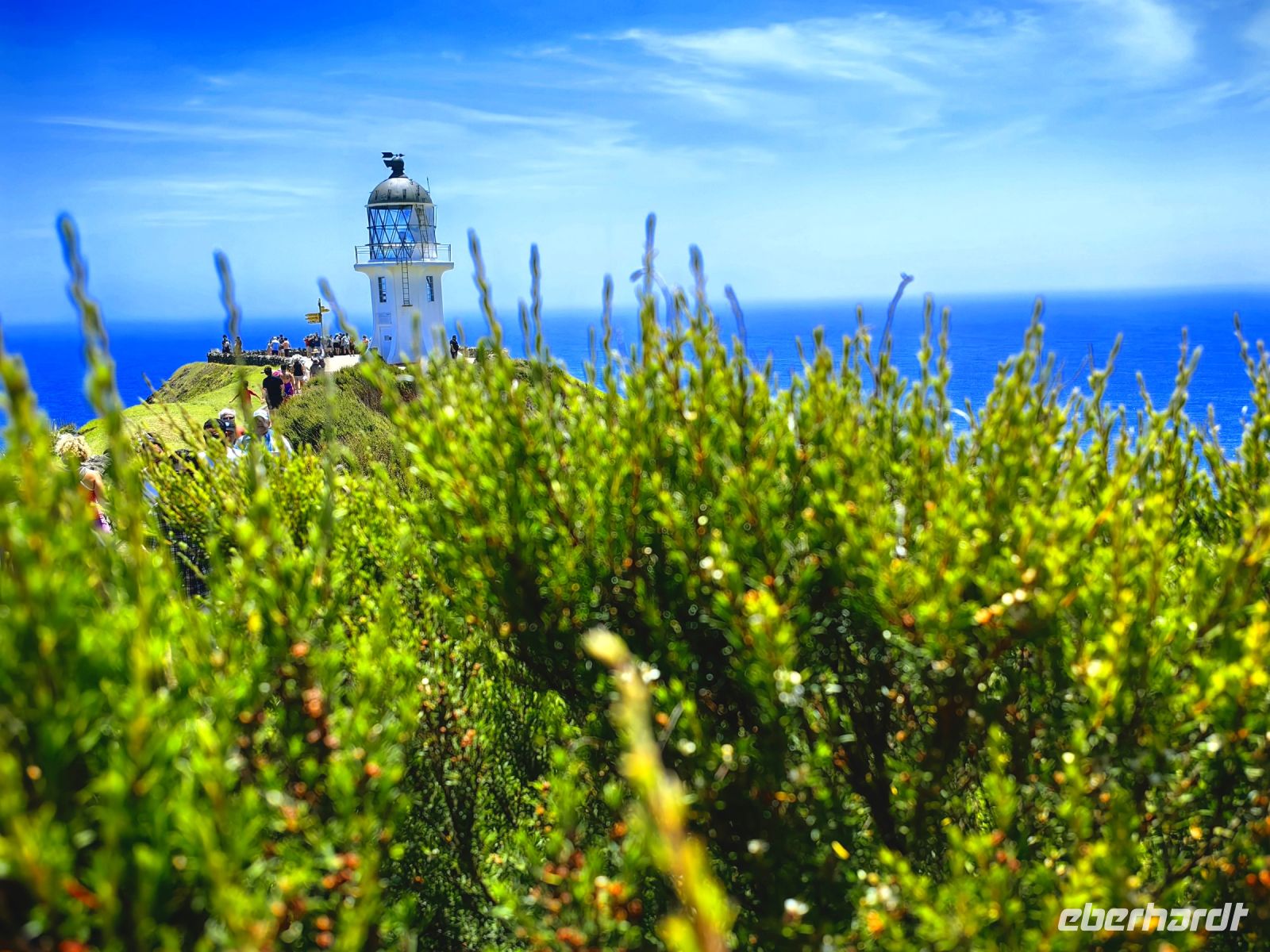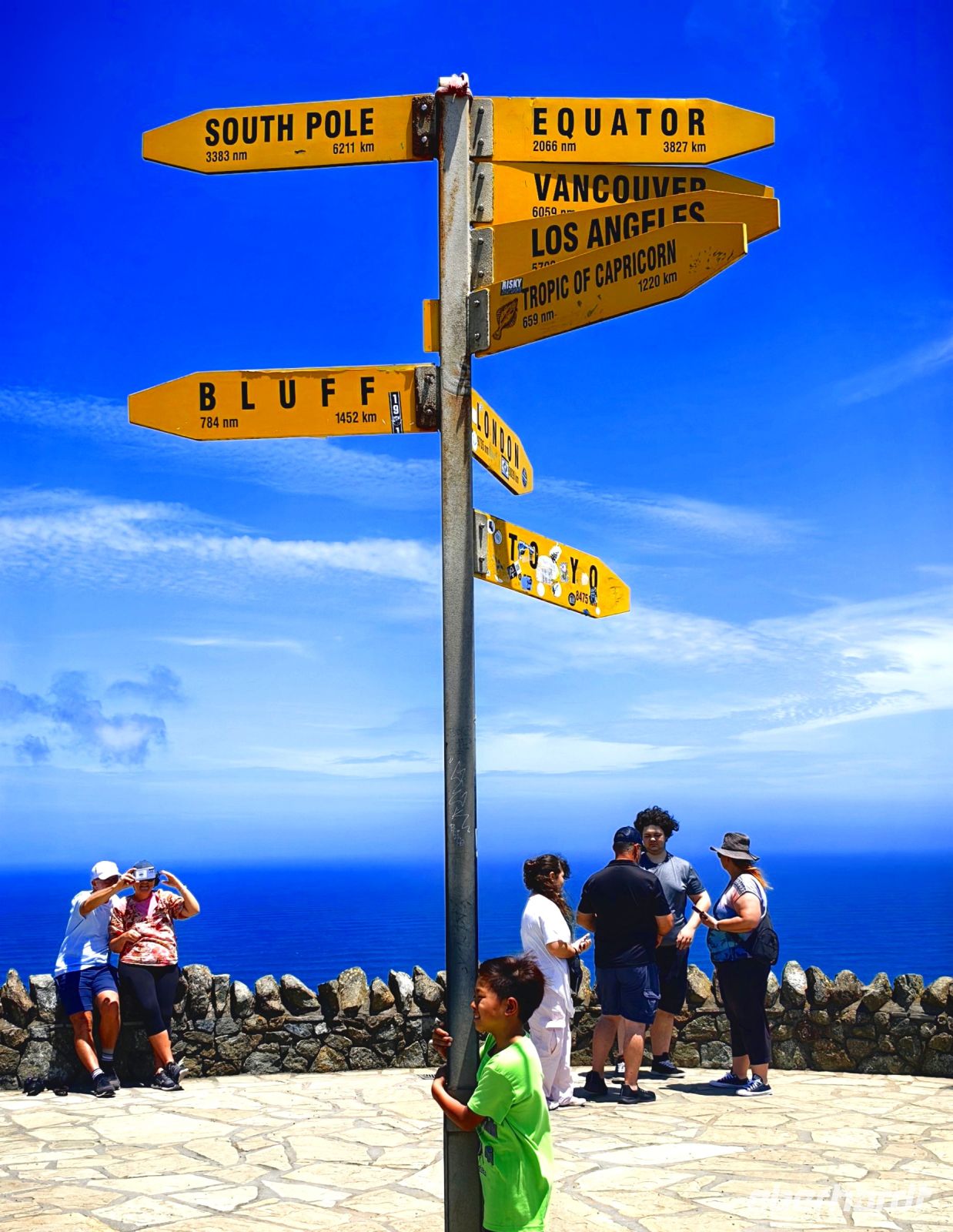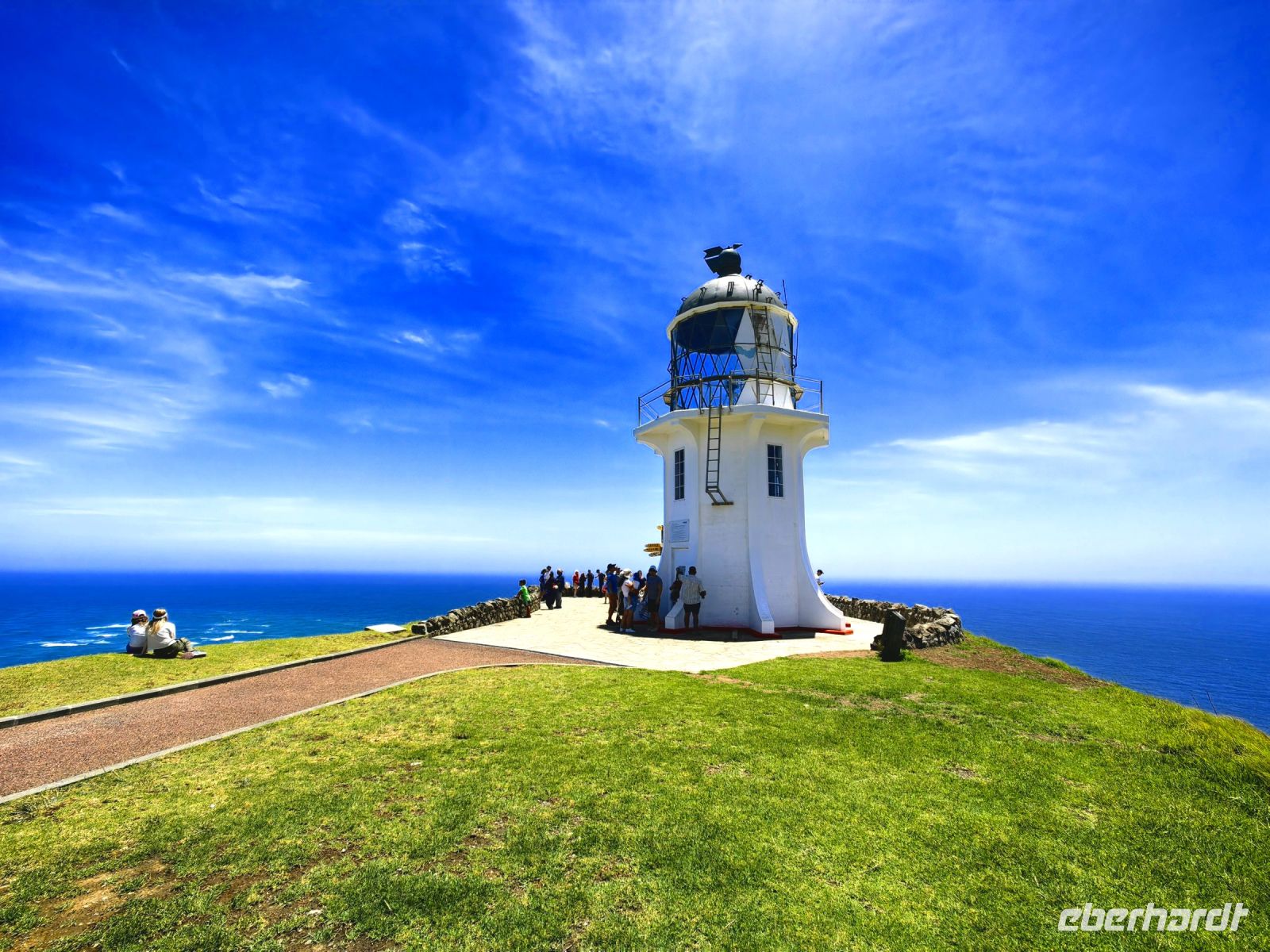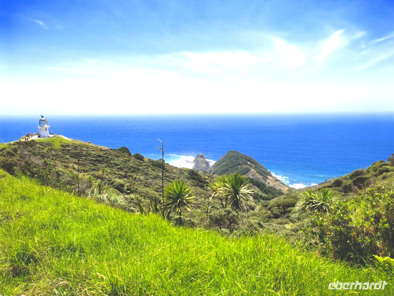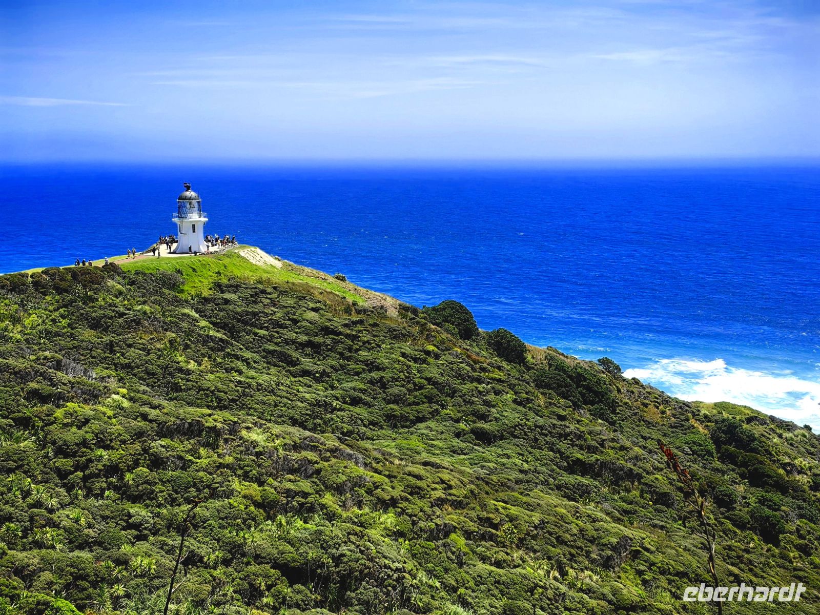 Nachmittags erreichen wir endlich das legendäre Cape Reinga. Hier, am nordwestlichsten Punkt der Nordhalbinsel, treffen die Tasmanische See und der Pazifische Ozean aufeinander und dadurch entstehen spektakuläre Strömungen. Für die Maori ist dieser Platz heilig, glauben sie doch, daß die Seelen der Verstorbenen von hier aus in den Ozean springen, und sich danach auf ihre letzte Reise nach Hawaiki, in das Heimatland ihrer Ahnen begeben. Die Magie und Schönheit dieses Ortes am Ende der Welt ziehen uns sofort in ihren Bann, und auf dem Weg zum Leuchtturm schießen wir wunderschöne Landschaftsfotos. Das Wetter zeigt sich von seiner besten Seite. Am Leuchtturm angekommen, können wir in alle Richtungen blicken und mehrere Schilder deuten auf die unterschiedlichen Entfernungen hin. Hier würde es sich lohnen, bis zum Sonnenuntergang zu bleiben, leider müssen wir die lange Strecke bis Paihia heute noch zurück und nachdem alle Erinnerungsfotos im Kasten sind, müssen wir schweren Herzens umkehren. Ohne übertreiben zu wollen, sind wir uns einig, daß dieser Ort mit dem Leuchtturm am Ende der Welt zu den schönsten auf der ganzen Erde gehört.