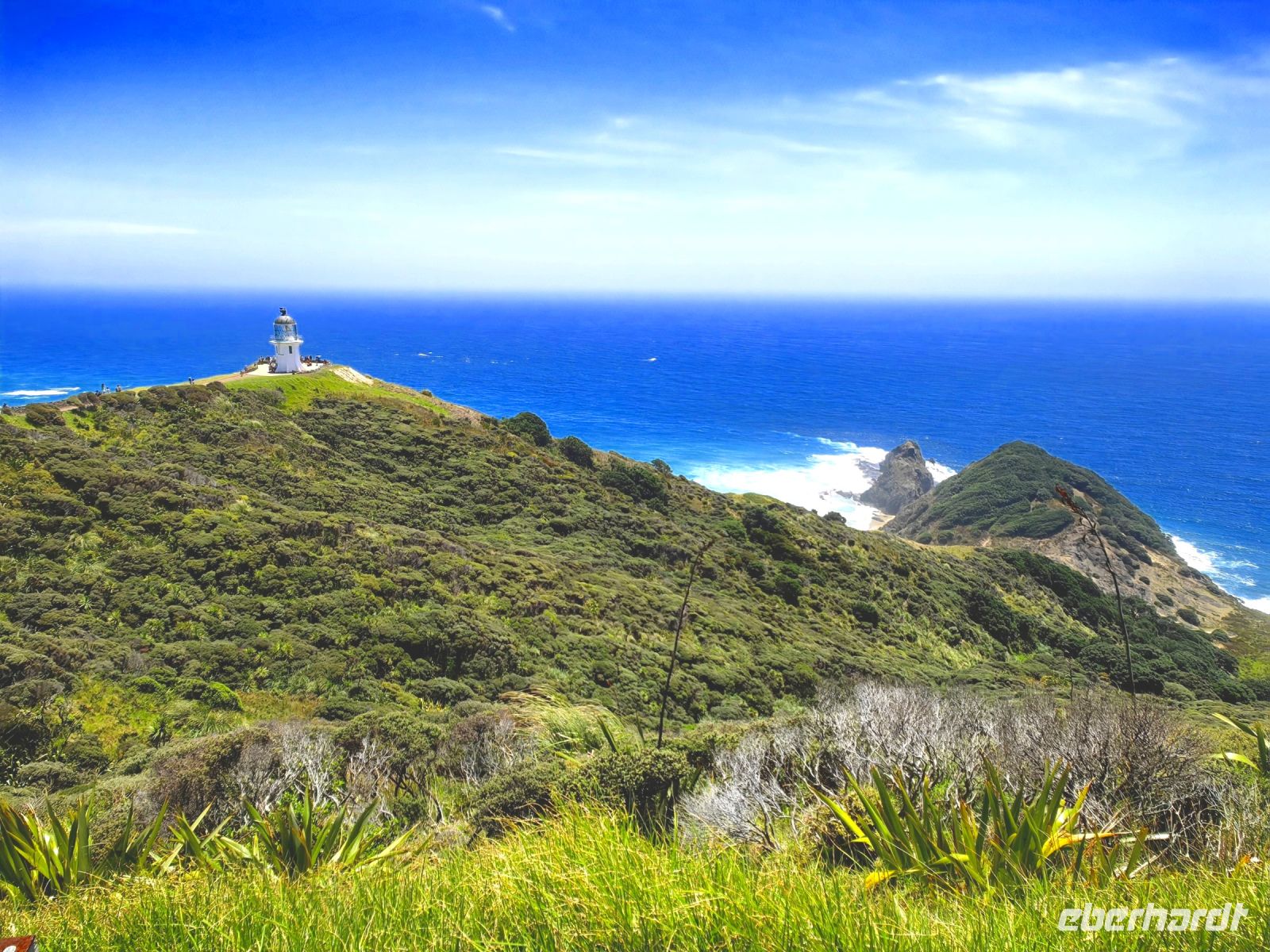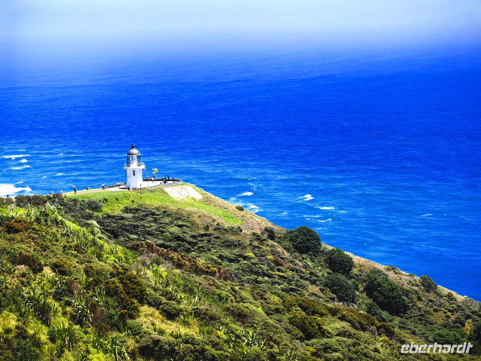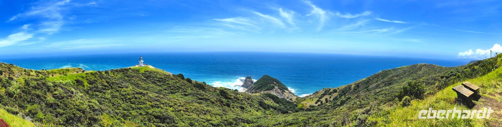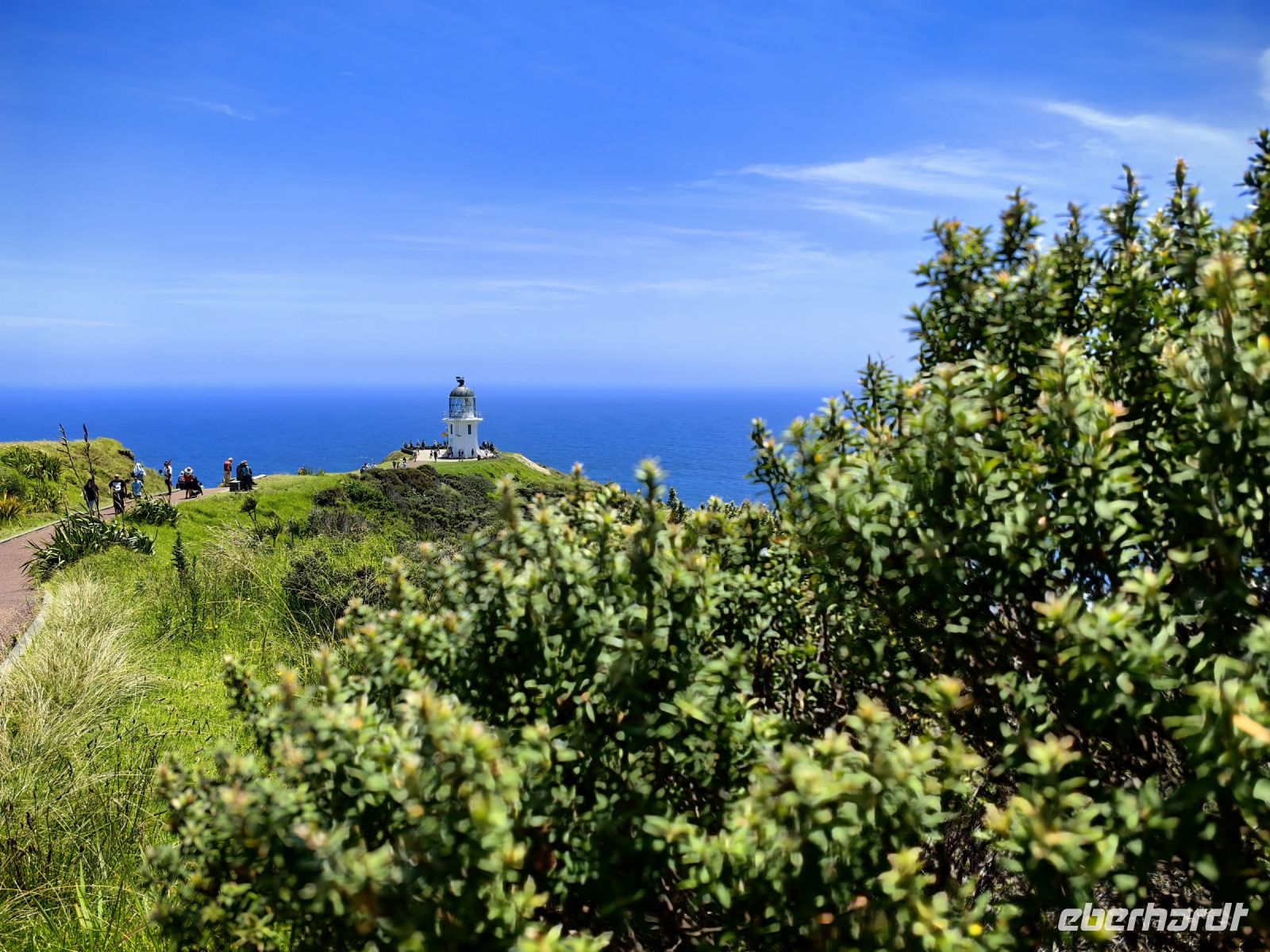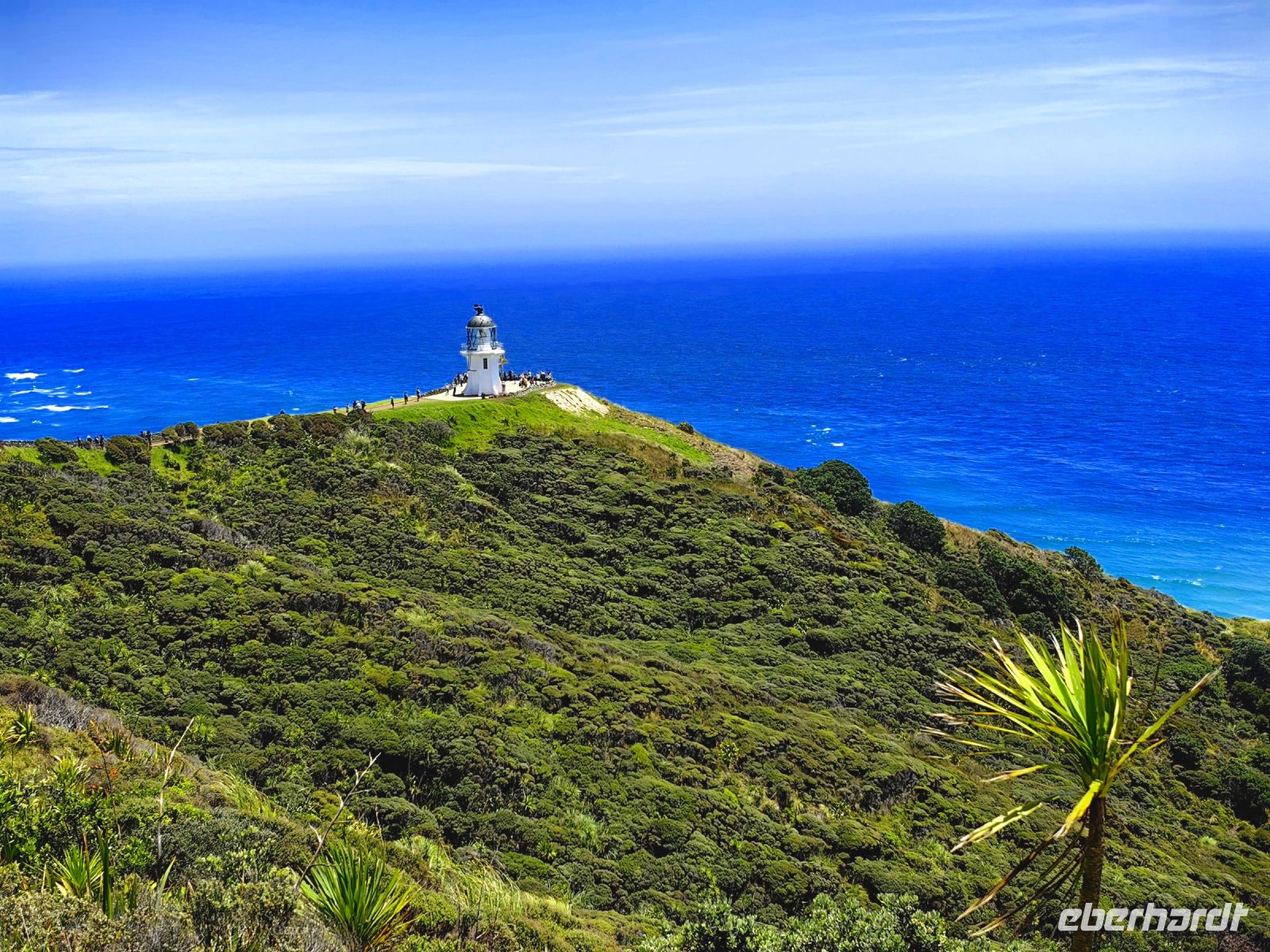 Nachmittags erreichen wir endlich das legendäre Cape Reinga. Hier, am nordwestlichsten Punkt der Nordhalbinsel, treffen die Tasmanische See und der Pazifische Ozean aufeinander und dadurch entstehen spektakuläre Strömungen. Für die Maori ist dieser Platz heilig, glauben sie doch, daß die Seelen der Verstorbenen von hier aus in den Ozean springen, und sich danach auf ihre letzte Reise nach Hawaiki, in das Heimatland ihrer Ahnen begeben. Die Magie und Schönheit dieses Ortes am Ende der Welt ziehen uns sofort in ihren Bann, und auf dem Weg zum Leuchtturm schießen wir wunderschöne Landschaftsfotos. Das Wetter zeigt sich von seiner besten Seite. Am Leuchtturm angekommen, können wir in alle Richtungen blicken und mehrere Schilder deuten auf die unterschiedlichen Entfernungen hin. Hier würde es sich lohnen, bis zum Sonnenuntergang zu bleiben, leider müssen wir die lange Strecke bis Paihia heute noch zurück und nachdem alle Erinnerungsfotos im Kasten sind, müssen wir schweren Herzens umkehren. Ohne übertreiben zu wollen, sind wir uns einig, daß dieser Ort mit dem Leuchtturm am Ende der Welt zu den schönsten auf der ganzen Erde gehört.