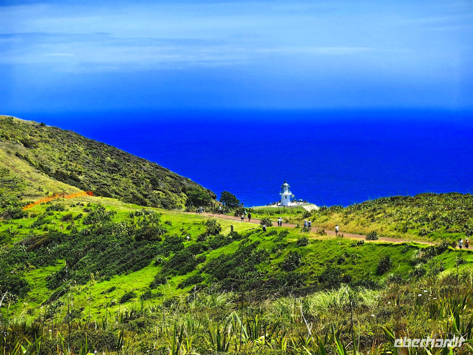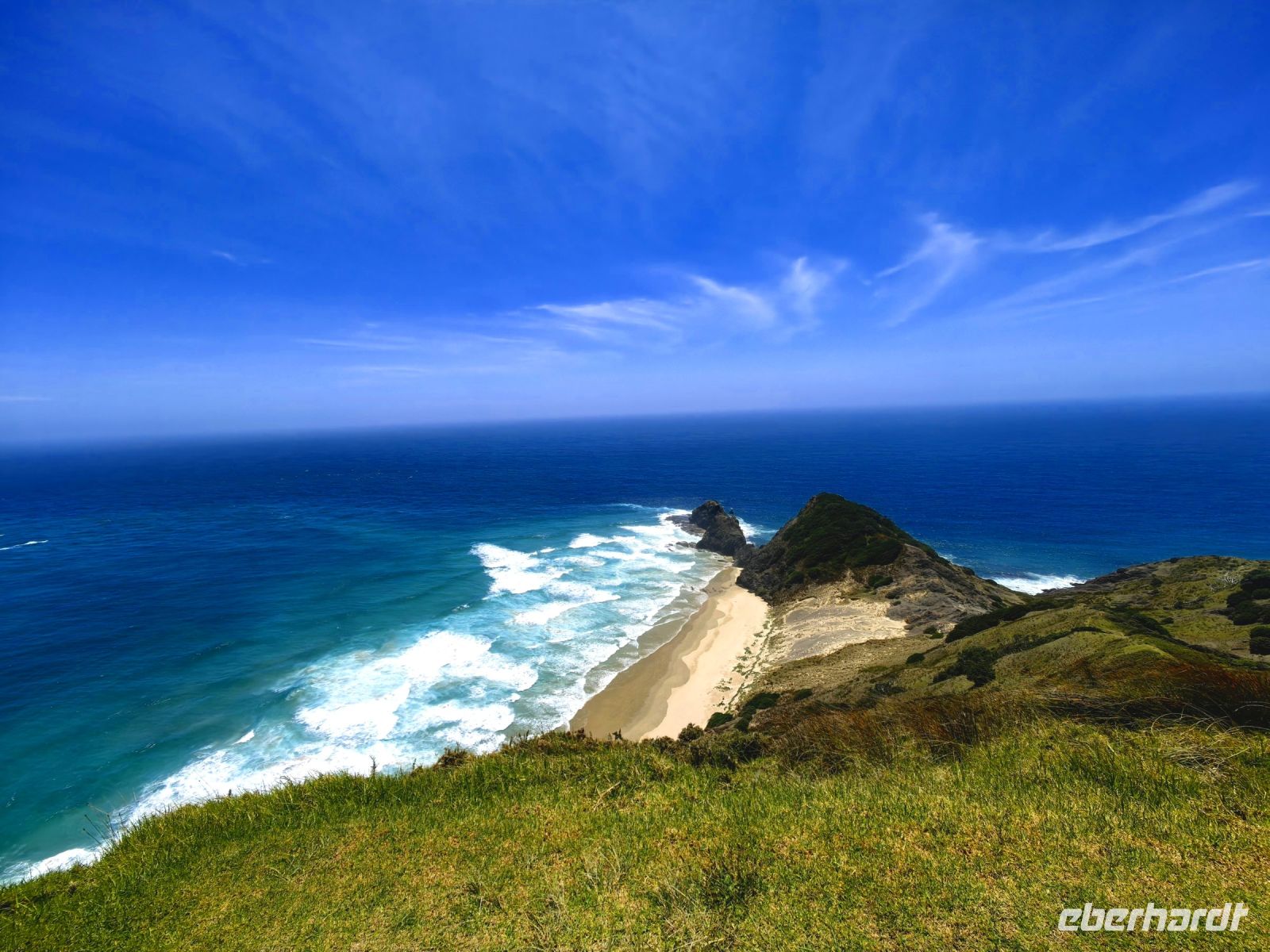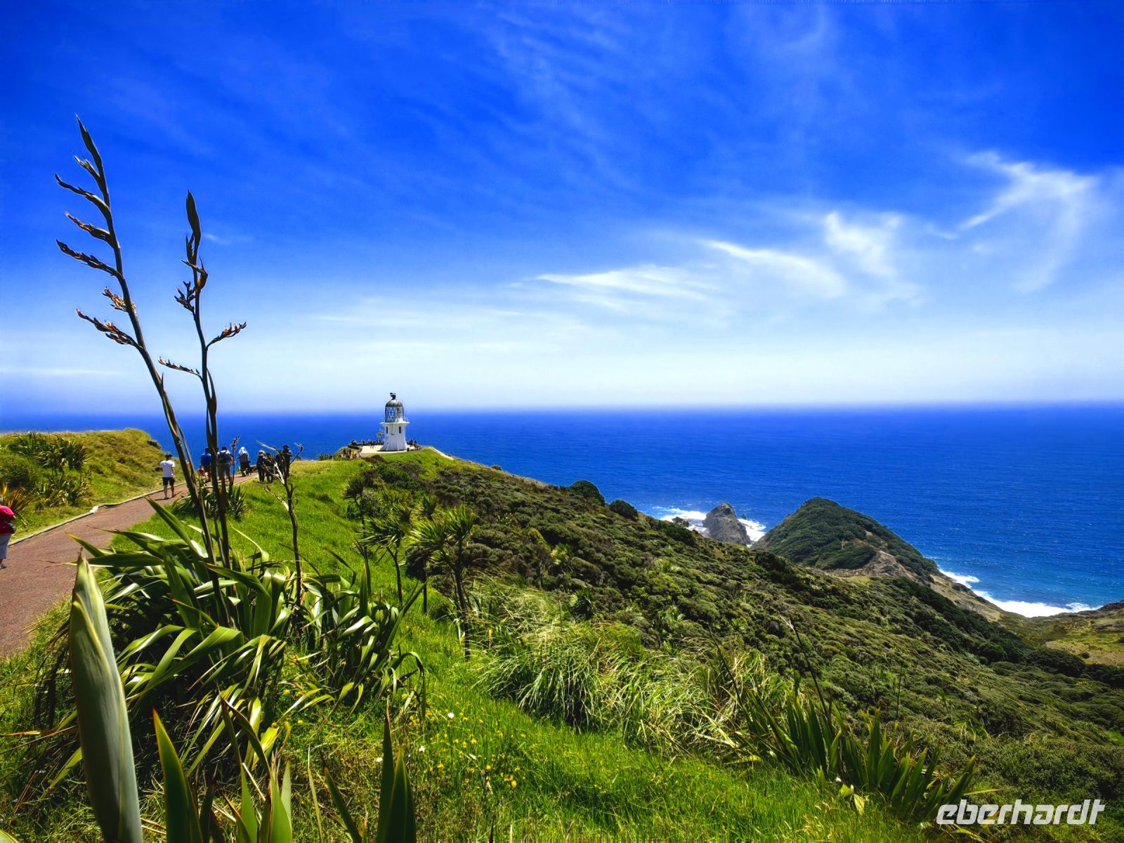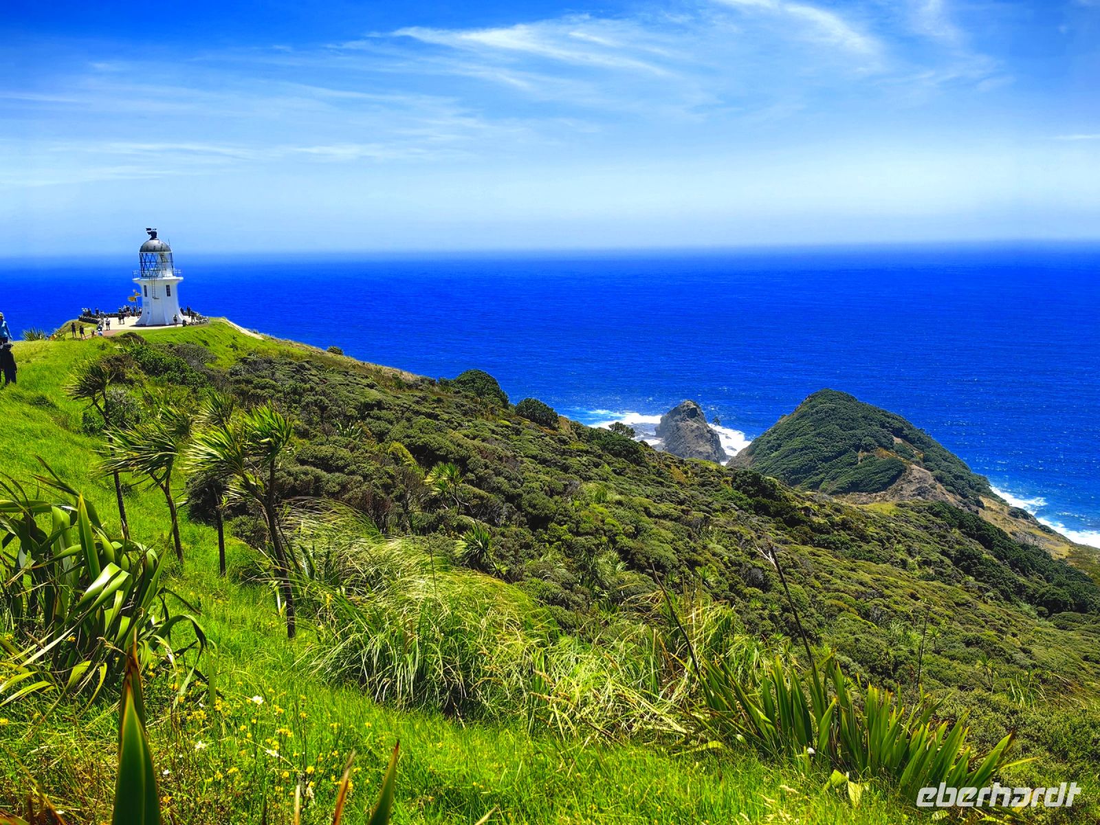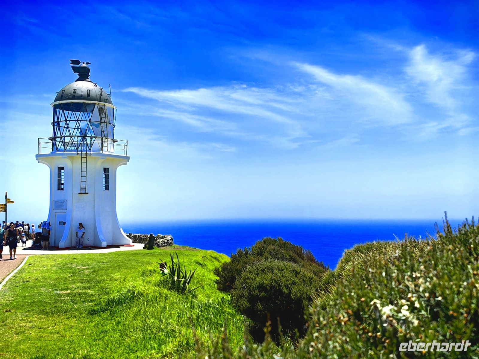 Nachmittags erreichen wir endlich das legendäre Cape Reinga. Hier, am nordwestlichsten Punkt der Nordhalbinsel, treffen die Tasmanische See und der Pazifische Ozean aufeinander und dadurch entstehen spektakuläre Strömungen. Für die Maori ist dieser Platz heilig, glauben sie doch, daß die Seelen der Verstorbenen von hier aus in den Ozean springen, und sich danach auf ihre letzte Reise nach Hawaiki, in das Heimatland ihrer Ahnen begeben. Die Magie und Schönheit dieses Ortes am Ende der Welt ziehen uns sofort in ihren Bann, und auf dem Weg zum Leuchtturm schießen wir wunderschöne Landschaftsfotos. Das Wetter zeigt sich von seiner besten Seite. Am Leuchtturm angekommen, können wir in alle Richtungen blicken und mehrere Schilder deuten auf die unterschiedlichen Entfernungen hin. Hier würde es sich lohnen, bis zum Sonnenuntergang zu bleiben, leider müssen wir die lange Strecke bis Paihia heute noch zurück und nachdem alle Erinnerungsfotos im Kasten sind, müssen wir schweren Herzens umkehren. Ohne übertreiben zu wollen, sind wir uns einig, daß dieser Ort mit dem Leuchtturm am Ende der Welt zu den schönsten auf der ganzen Erde gehört.