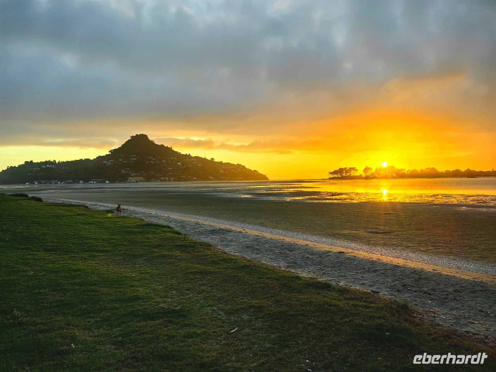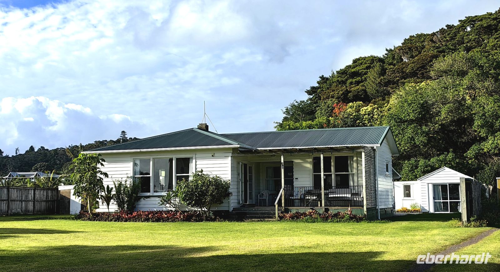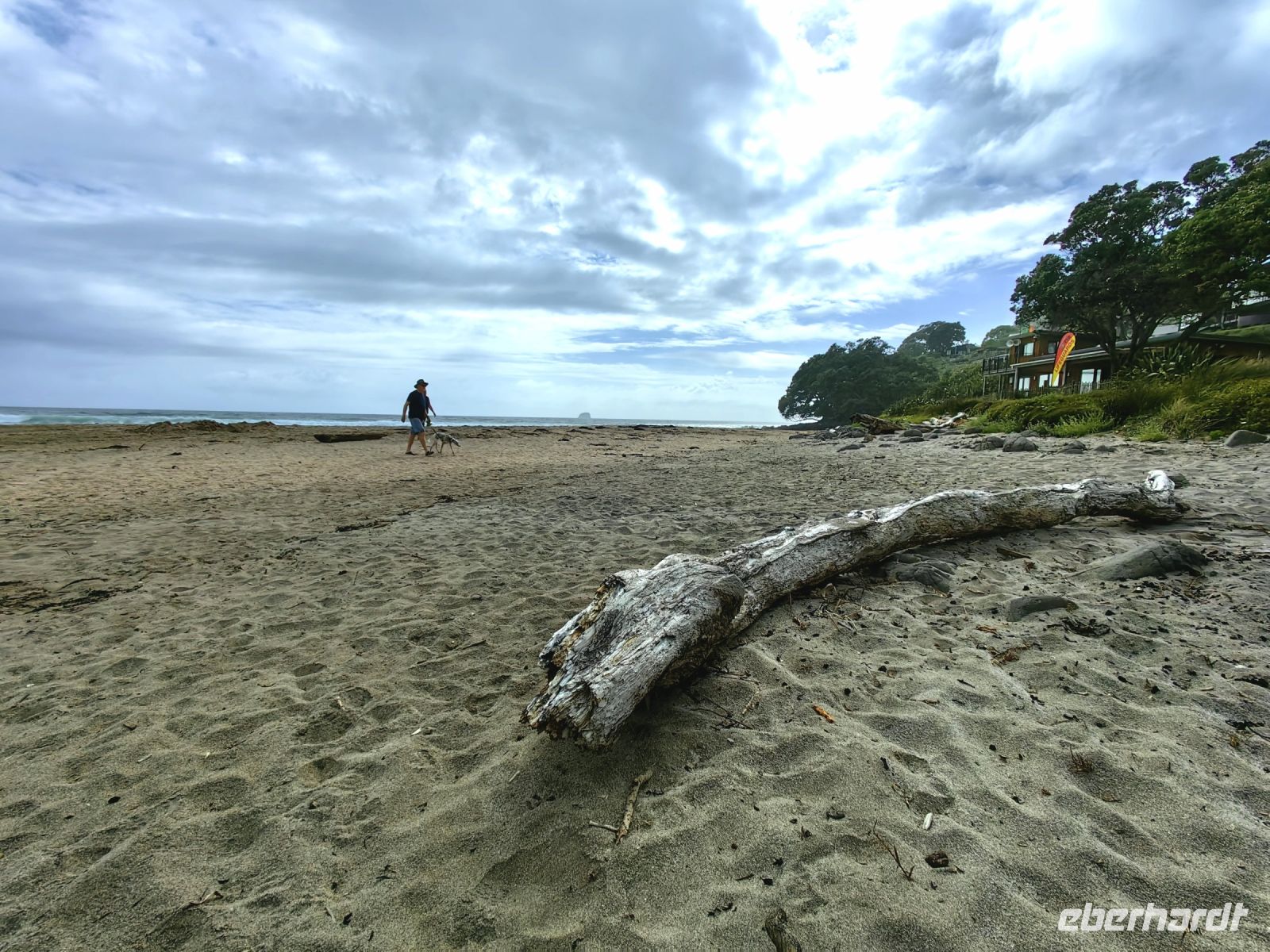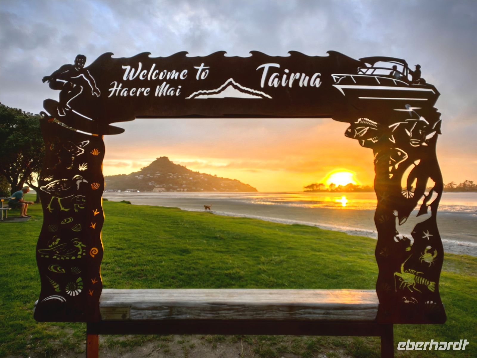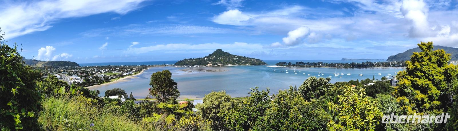 Am Nachmittag erreichen wir Tairuha. Dieses kleine hübsche Örtchen am Pazifik liegt an der vulkanischen Landspitze Paku und den zerklüfteten Aldermen-Inseln. Auf der Hafenseite kann man Segeln, Kajak fahren und windsurfen. Die Meerseite eignet sich zum Bodyboarden und Surfen und natürlich zum Sonnenbaden. Wir erklimmen gemeinsam mit Alec einen Aussichtspunkt und sind begeistert von der malerisch schönen Lage und beneiden die daneben auf der Terrasse Wein trinkenden Anwohner um diesen Ausblick. Unsere gemütlichen Chalets, in denen wir zwei Nächte verbringen werden, liegen direkt am Wasser und so hat man die Qual der Wahl, ob man gleich hier, oder etwas weiter im wilden Pazifik baden gehen will. Wir genießen den sonnigen warmen Januarnachmittag in vollen Zügen und treffen uns zum Abendessen in einem unweit des Hotels gelegenen Restaurant wieder, wo wir den Tag ausklingen lassen.