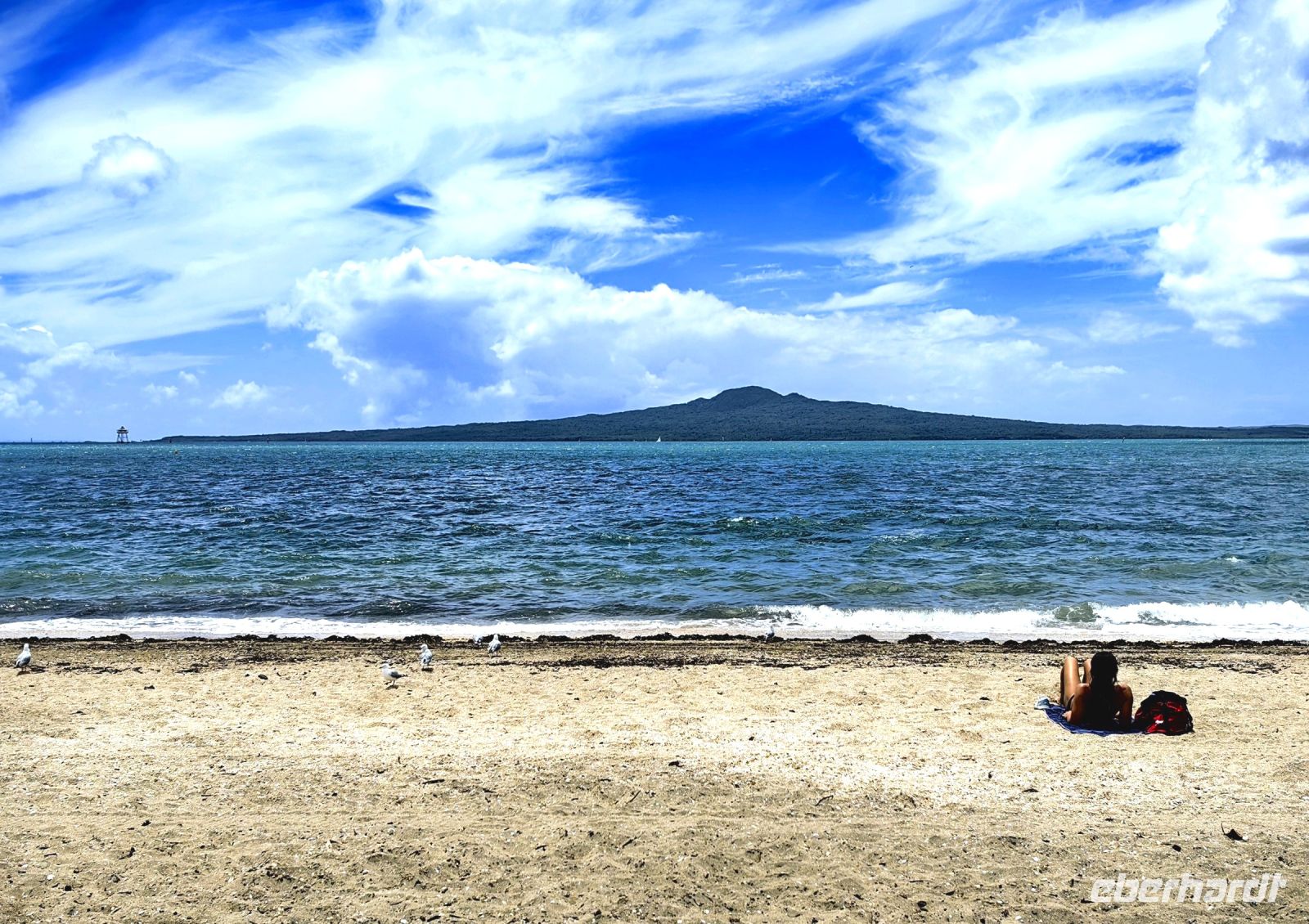 Unsere Mittagspause legen wir am Strand von Auckland ein, haben wir doch am Ankunftstag von der Stadt gar nicht viel gesehen, da wir alle vom Nachtflug übermüdet waren und uns das Wetter auch nicht hold war. Heute scheint die Sonne und wir sehen die Skyline vor blauem Himmel. Am Stadtstrand sucht sich jeder ein kleines Café oder Restaurant und genießt die Pause umso mehr, als uns aus Deutschland nur noch Schnee- und Kältemeldungen erreichen.