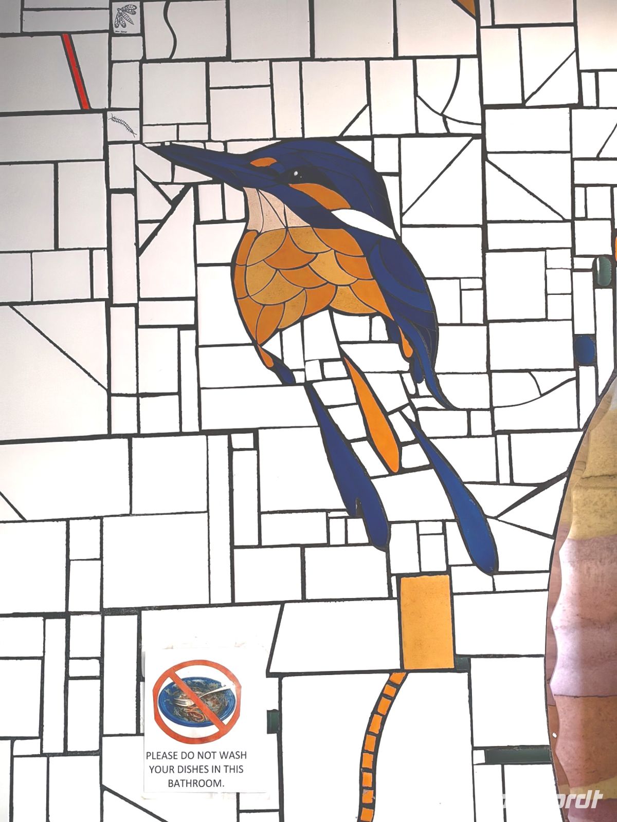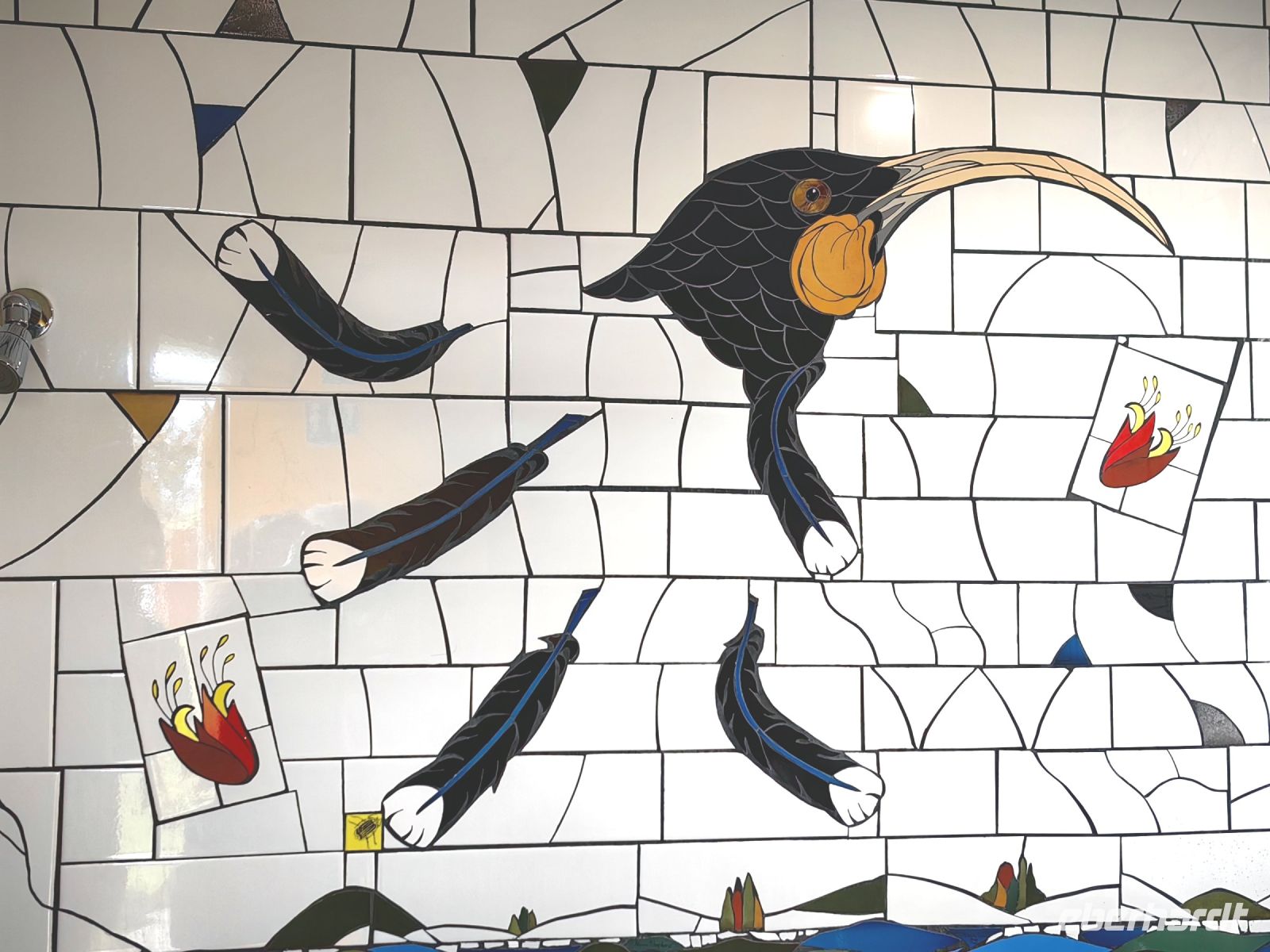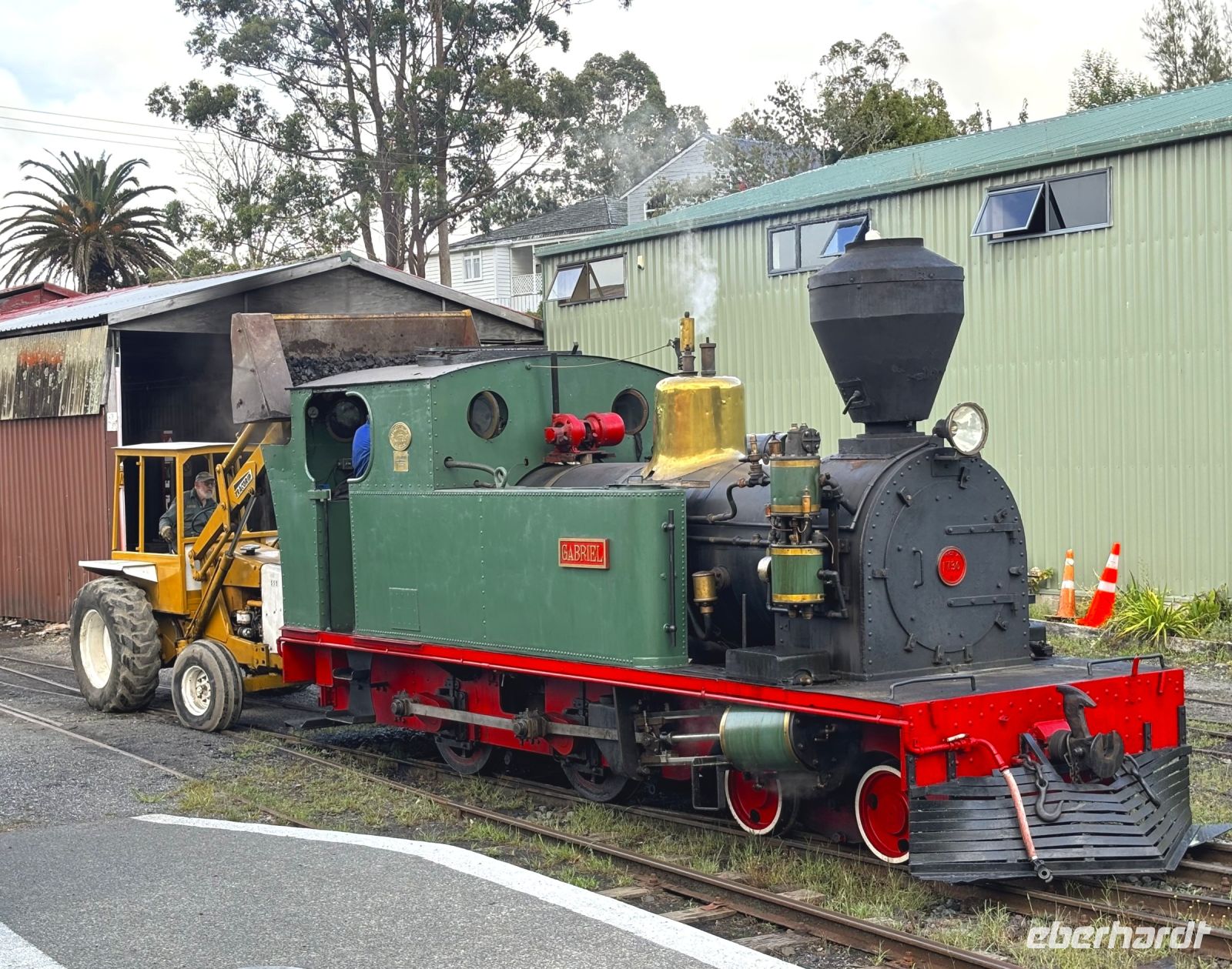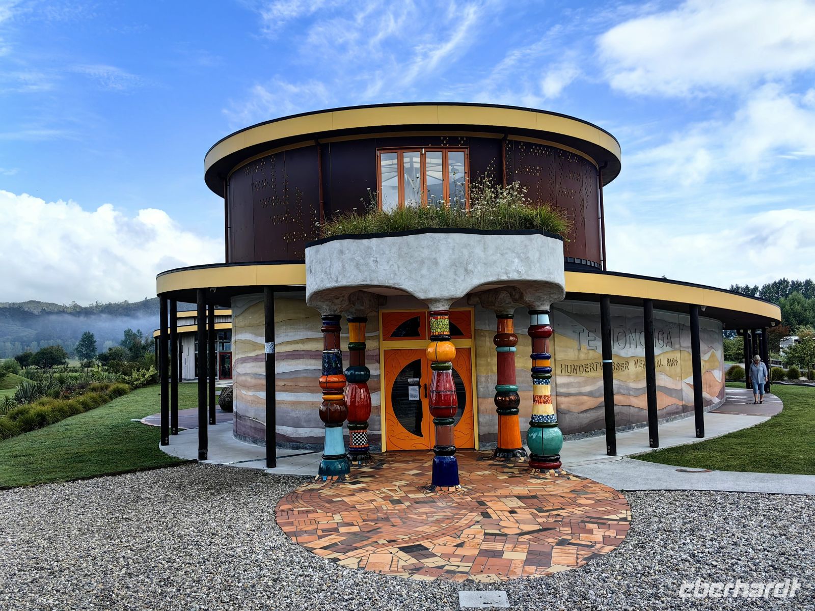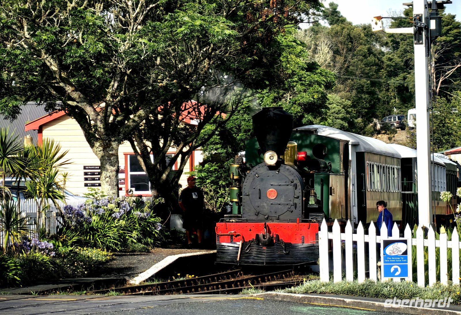 Wir fahren weiter und halten an etwas ganz Unerwartetem und Exotischen: einer öffentlichen Toilette, die von Friedensreich Hundertwasser (ja, von DEM!) in Karawaka errichtet wurde. Der Künstler lebte von 1973 bis 2000 hier und hinterließ dem Ort dieses bunte Bauwerk mit den für ihn typischen farbenfrohen Fliesen und Säulen, integrierten Kleinskulpturen, farbig umrandeten Spiegeln und einem in die Architektur einbezogenen Baum. So eine Toilettenpause lassen wir uns gefallen. Mitten durch den kleinen Ort fährt heute noch eine nostalgische Dampflock und gerade, als wir wieder los fahren wollen, rangiert die Lock und wir können sie in voller Pracht sehen.