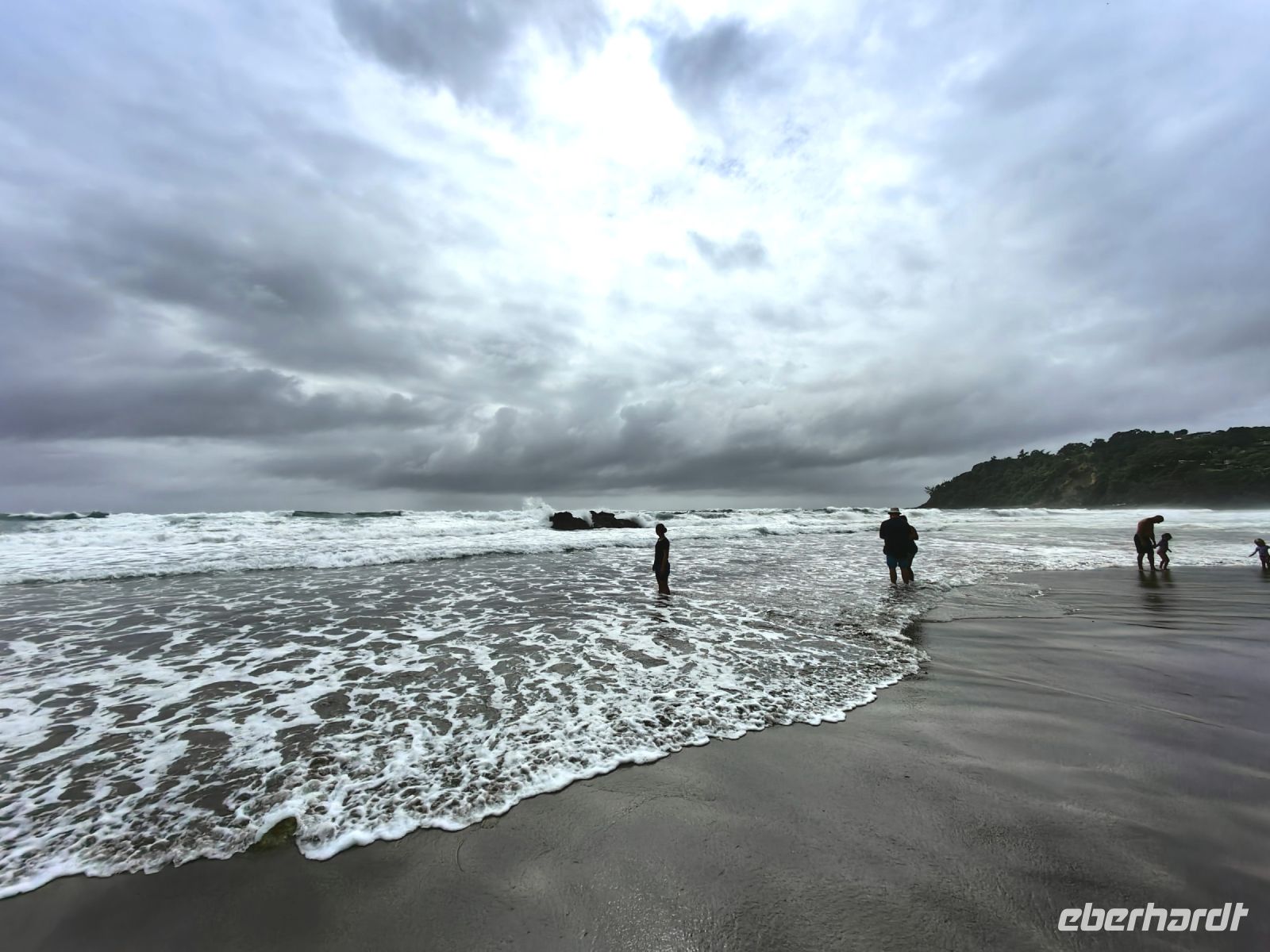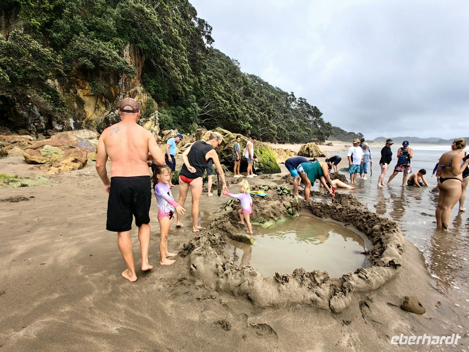 Nachdem wir Schaufeln und Handtücher eingepackt haben, fahren wir an Kiwi- und Weinplantagen vorbei zum Hot Water Beach. Dieser zwölf Kilometer lange Strandabschnitt an der Pazifikküste ist berühmt für den Austritt von Thermalwasser. Etwa zwei Kilometer unter der Erdoberfläche befinden sich 170 Grad Celsius heiße Gesteinsschichten, die Reste vulkanischer Aktivität aus einer Zeit vor etwa fünf Millionen Jahren sind. Darüber liegen Reservoire heißen Wassers. Kaltes Grundwasser sickert in das Gestein und an einigen Stellen tritt Heißwasser durch Risse im Gestein nach oben. Wir schnappen uns also die mitgebrachten Schaufeln und Handtücher und graben eifrig große Löcher. Direkt neben uns blubbert der Sand und auch ohne schaufeln merkt man, daß der Boden unter den Füßen ganz warm ist. Es fühlt sich ein wenig an, wie auf einer Fußbodenheizung zu stehen. Unsere Füße werden vom warmen unterirdischen Wasser und wenig später von den kühleren Pazifikfluten umspült. Das zu erleben ist ein absolutes Muß, wo sonst gibt es so etwas schon?