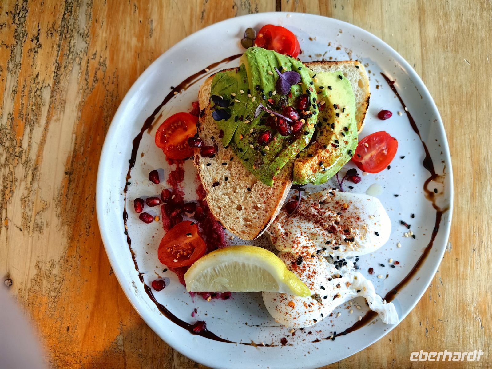 Zur Abwechslung frühstücken wir heute Morgen mal nicht im Hotel, sondern im gegenüberliegenden Restaurant und probieren Omletts mit verschiedenen Füllungen, Benedict Eggs oder Brote mit frischer Avocado.