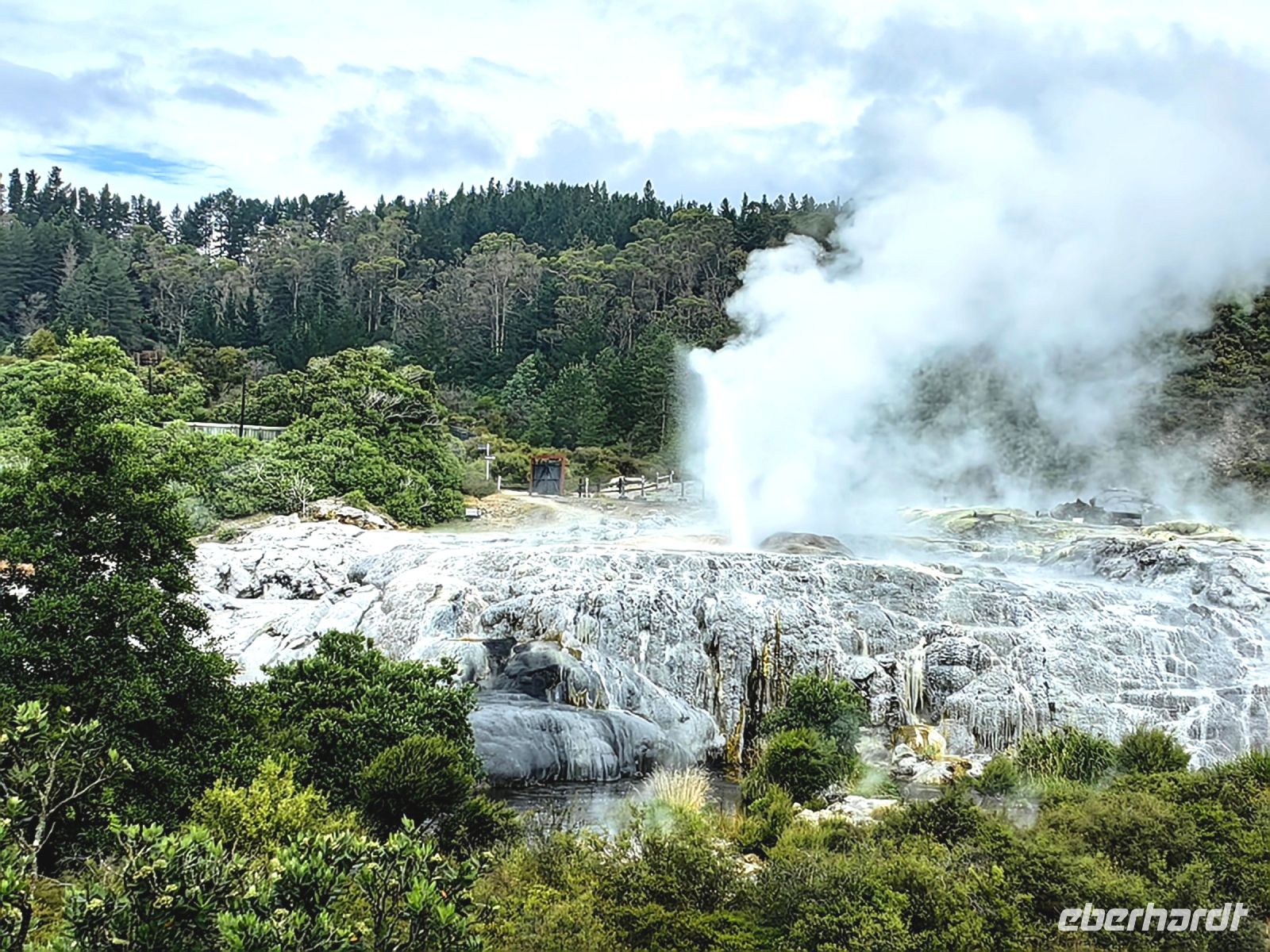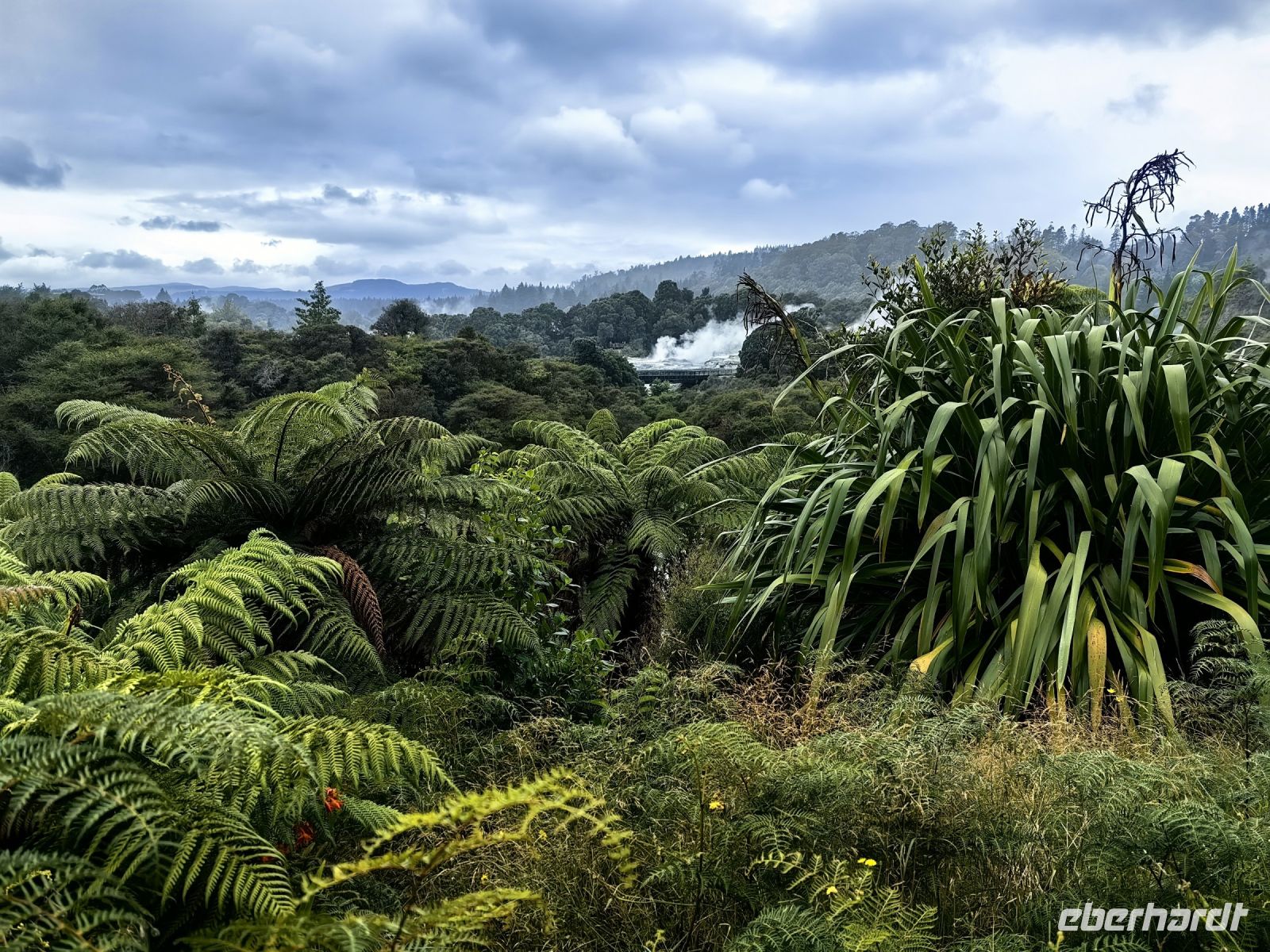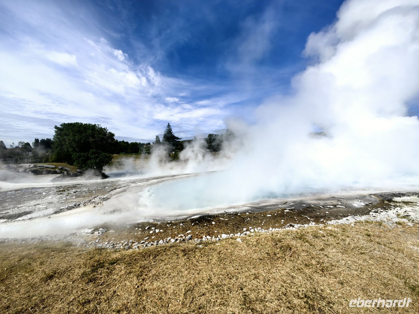 Wir anderen schauen uns ein wenig im Zentrum von Rotorua um. Dieser Ort liegt mitten in einer Vulkanzone Neuseelands, das Geothermalfeld reicht von White Islands an der Küste der Bay of Plenty bis zum Mount Ruapehu im Herzen der Nordinsel. Das Waimangu-Vulkantal ist das jüngste geothermische Ökosystem der Welt, das obendrein über die mit 3,8 Hektar größte Thermalquelle verfügt. Entstanden ist es beim Ausbruch des Mount Tarawera im Jahr 1886.