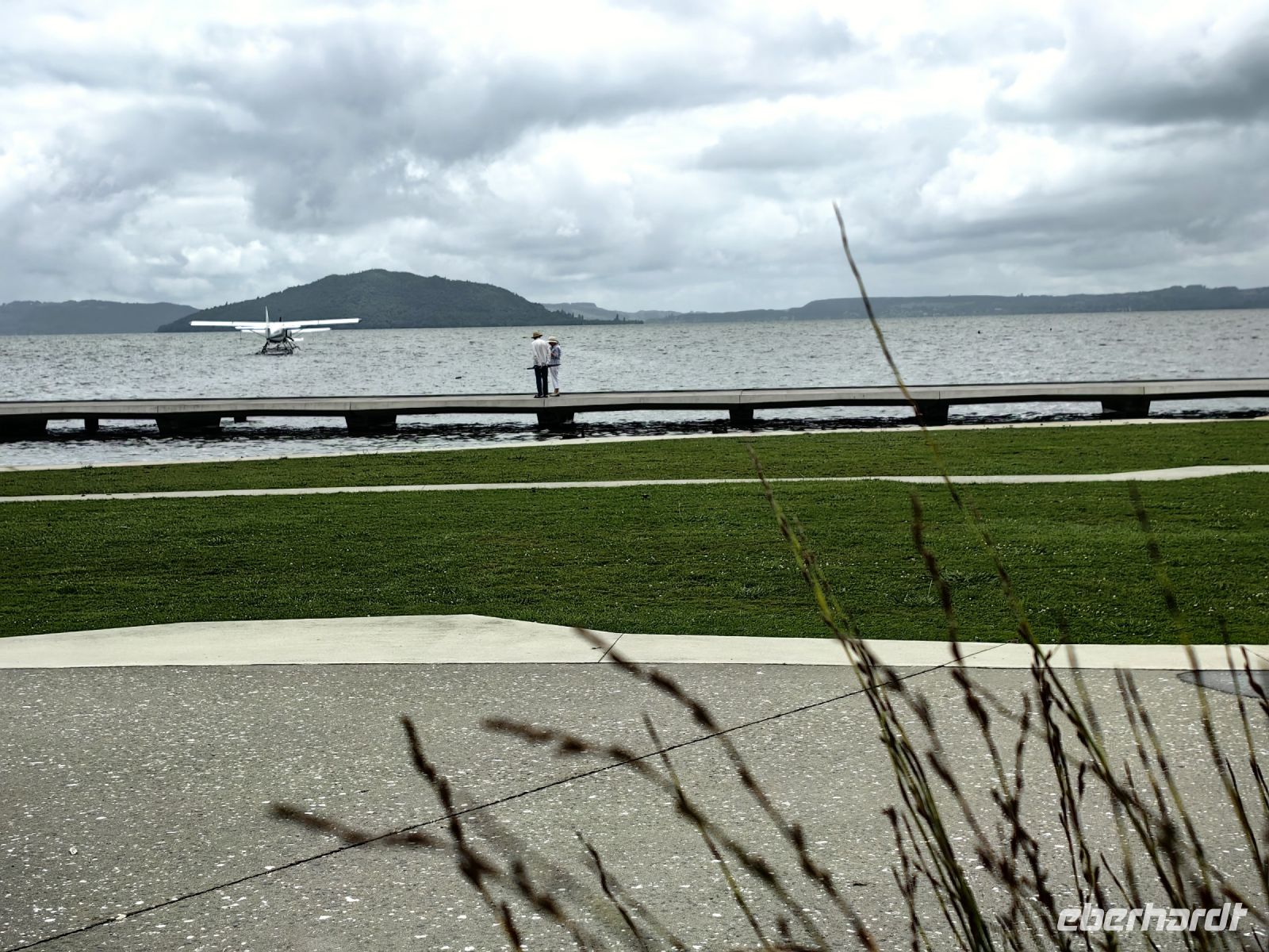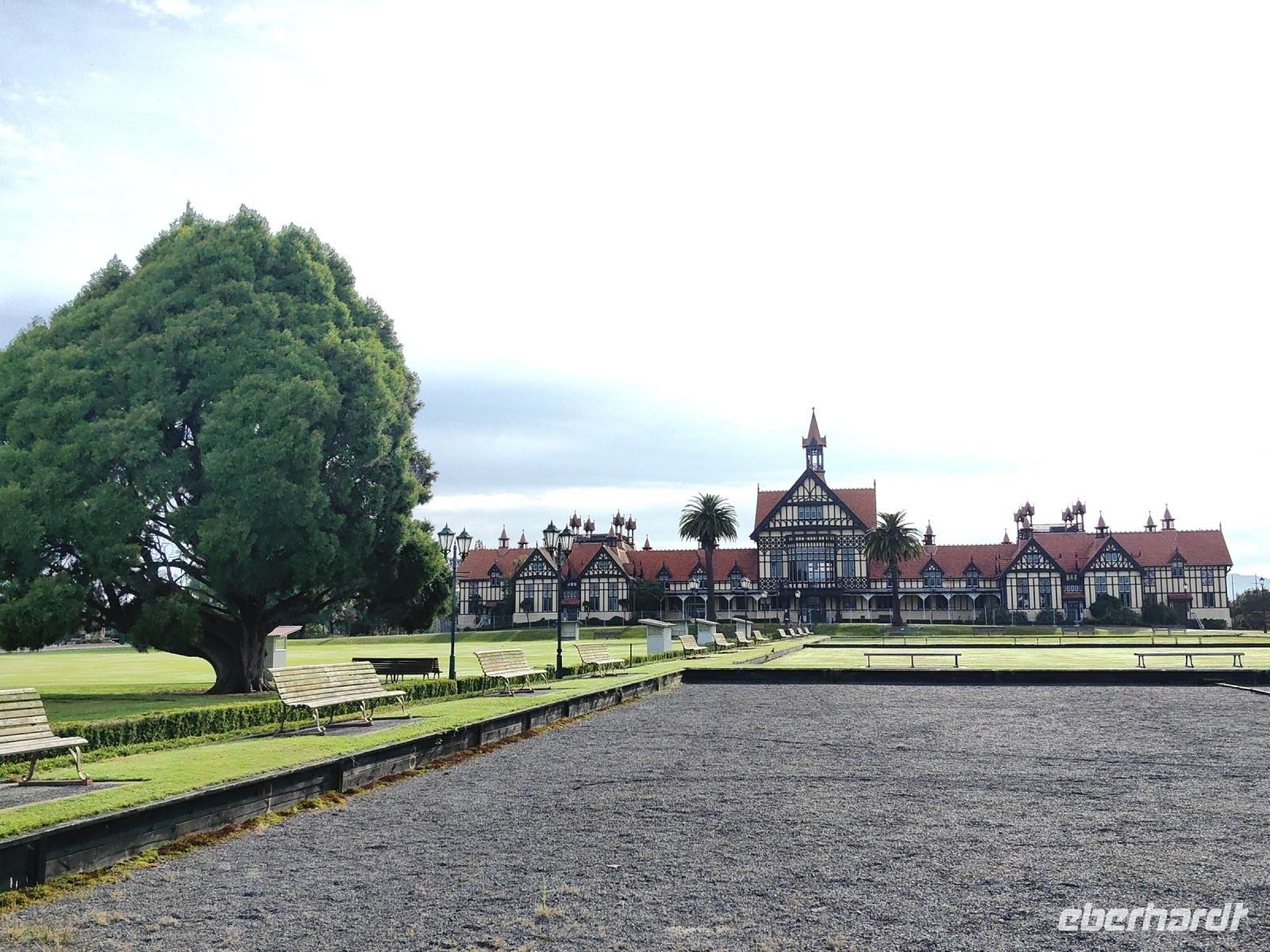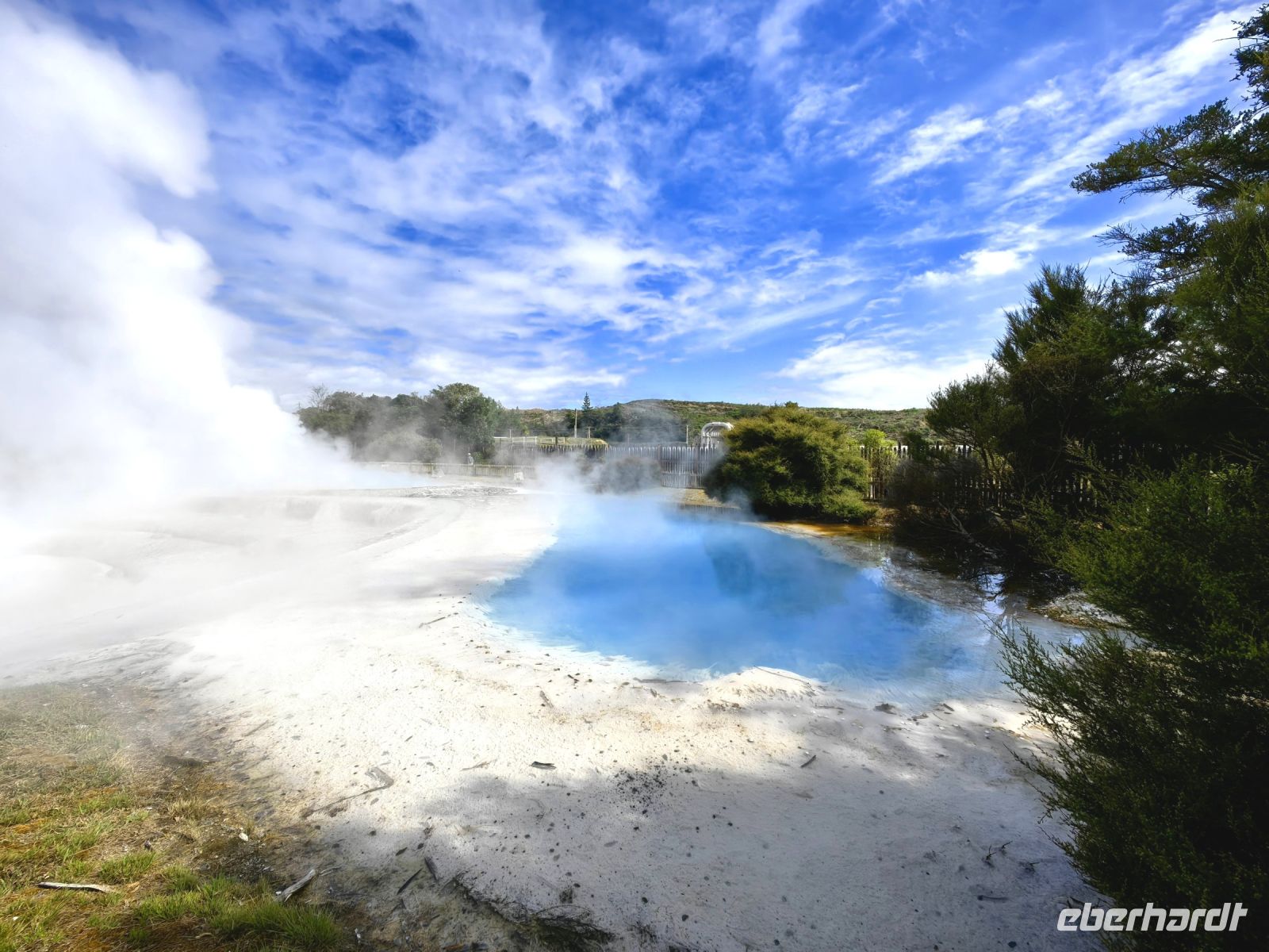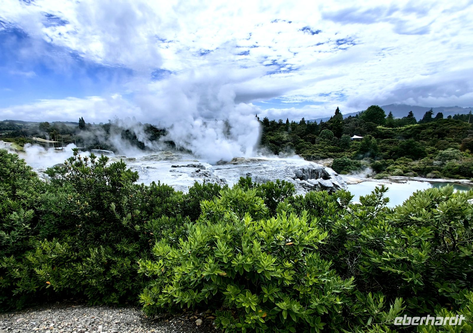 Wir anderen schauen uns ein wenig im Zentrum von Rotorua um. Dieser Ort liegt mitten in einer Vulkanzone Neuseelands, das Geothermalfeld reicht von White Islands an der Küste der Bay of Plenty bis zum Mount Ruapehu im Herzen der Nordinsel. Das Waimangu-Vulkantal ist das jüngste geothermische Ökosystem der Welt, das obendrein über die mit 3,8 Hektar größte Thermalquelle verfügt. Entstanden ist es beim Ausbruch des Mount Tarawera im Jahr 1886.
