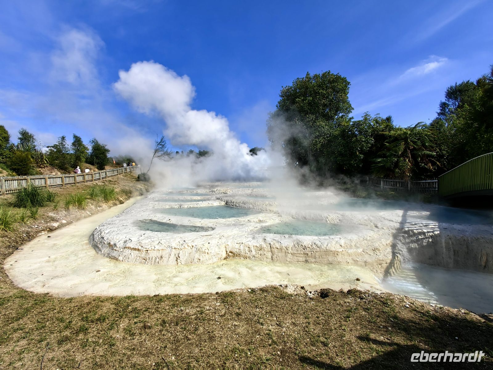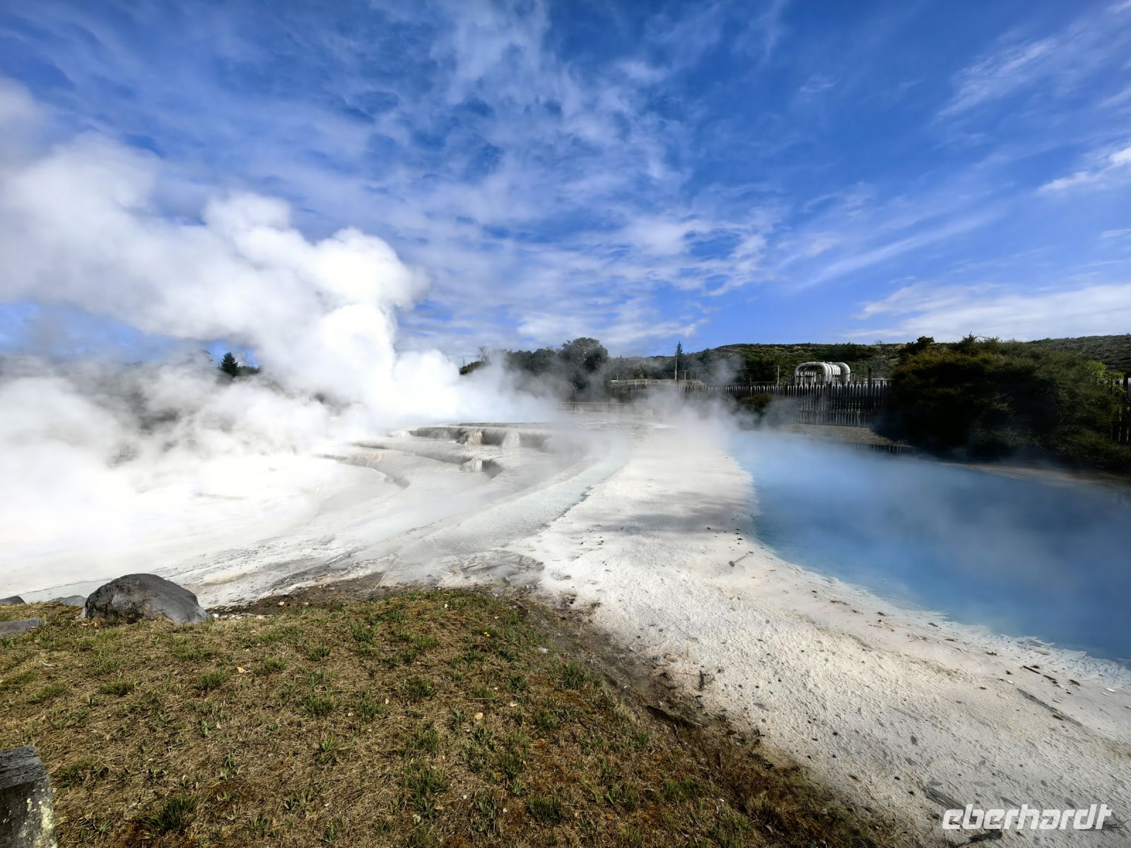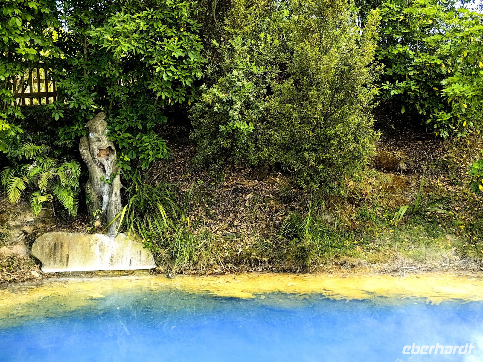 In Rotorua halten wir am Morgen noch einmal an den einstigen Kurthermalbädern, die von einem englischen sehr gepflegten Park umgeben sind, bevor wir uns auf den Weg zu den Wairakei-Terrassen machen. Bei Warakei handelt es sich um natürliche Geo-Thermalbäder am Lake Taupo, die Entspannung pur bieten. Die natürlichen Pools erinnern ein wenig an Pamukkale in der Türkei und wir hätten Lust auf ein warmes Bad. Allerdings nimmt uns Hohepa, ein Maoriältster, mit durch die Anlage und erzählt uns einige der Schöpfungsmythen der Maori. Das wollen wir natürlich nicht verpassen.