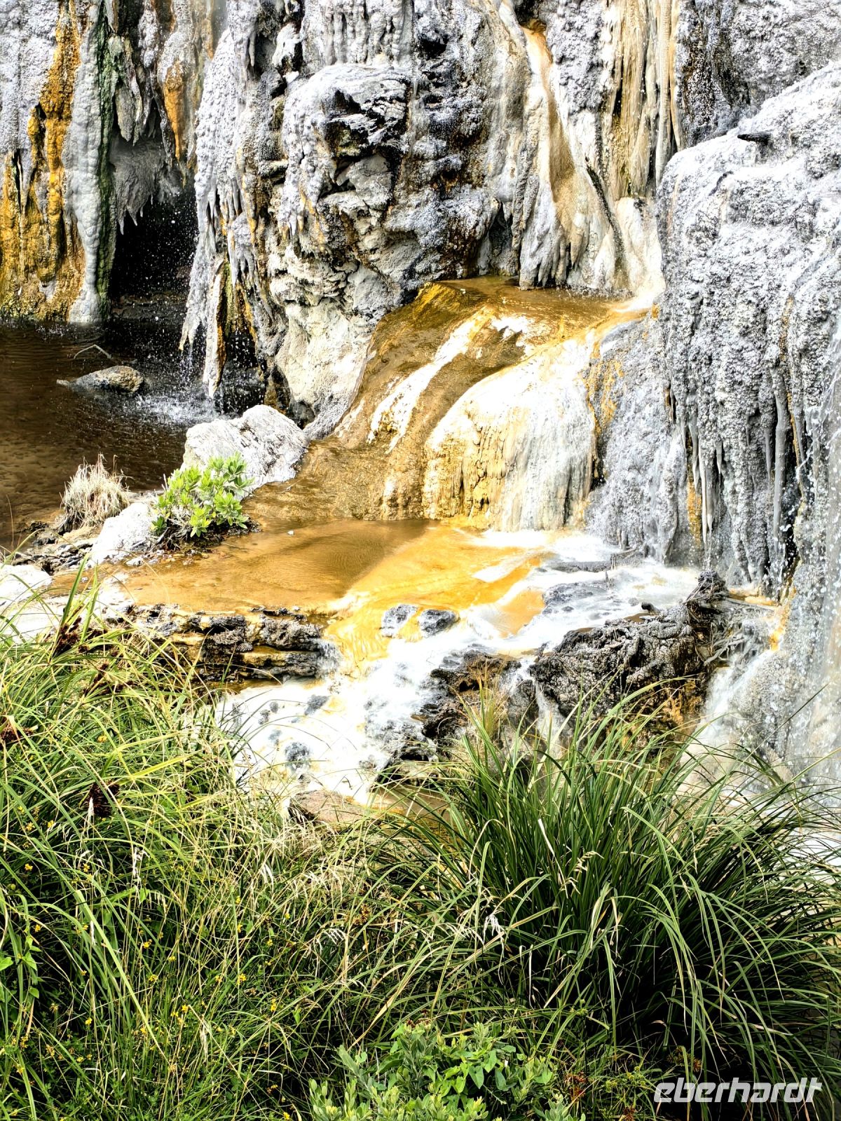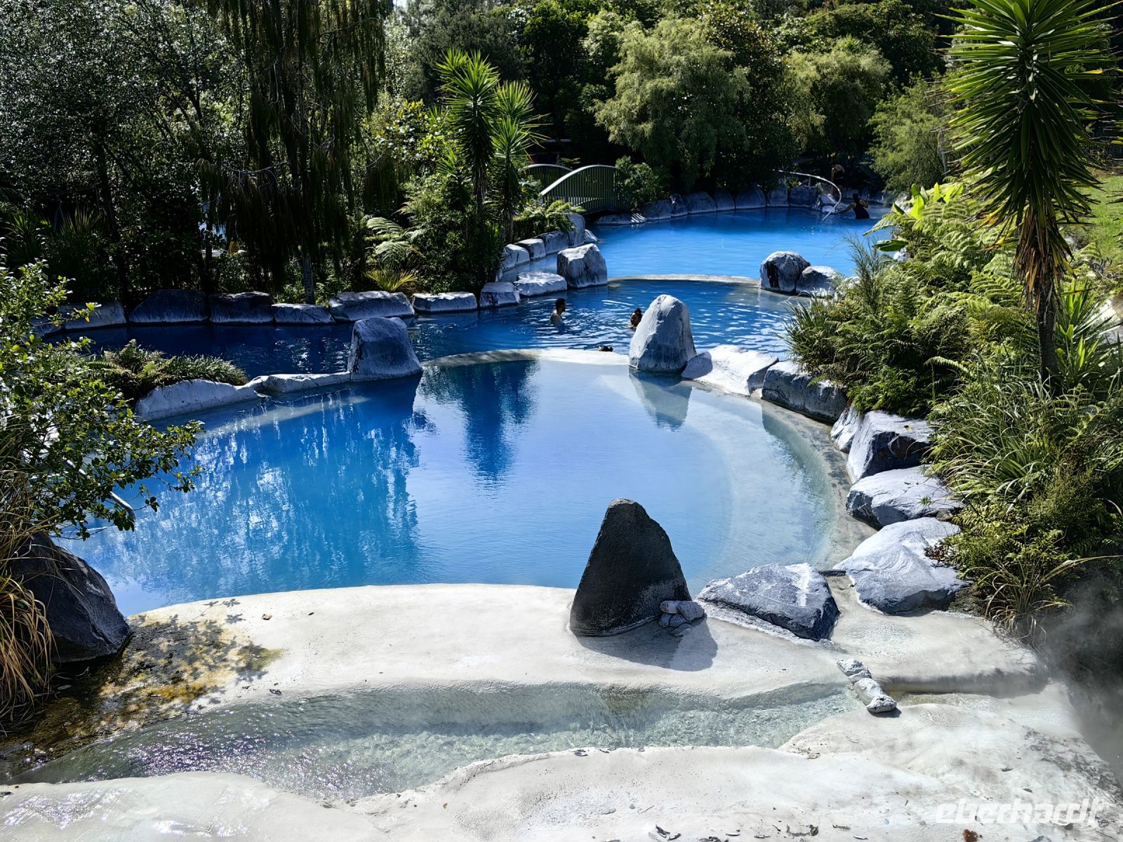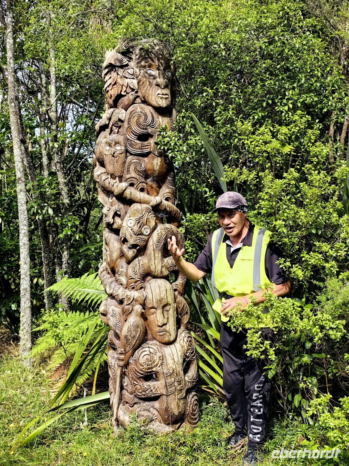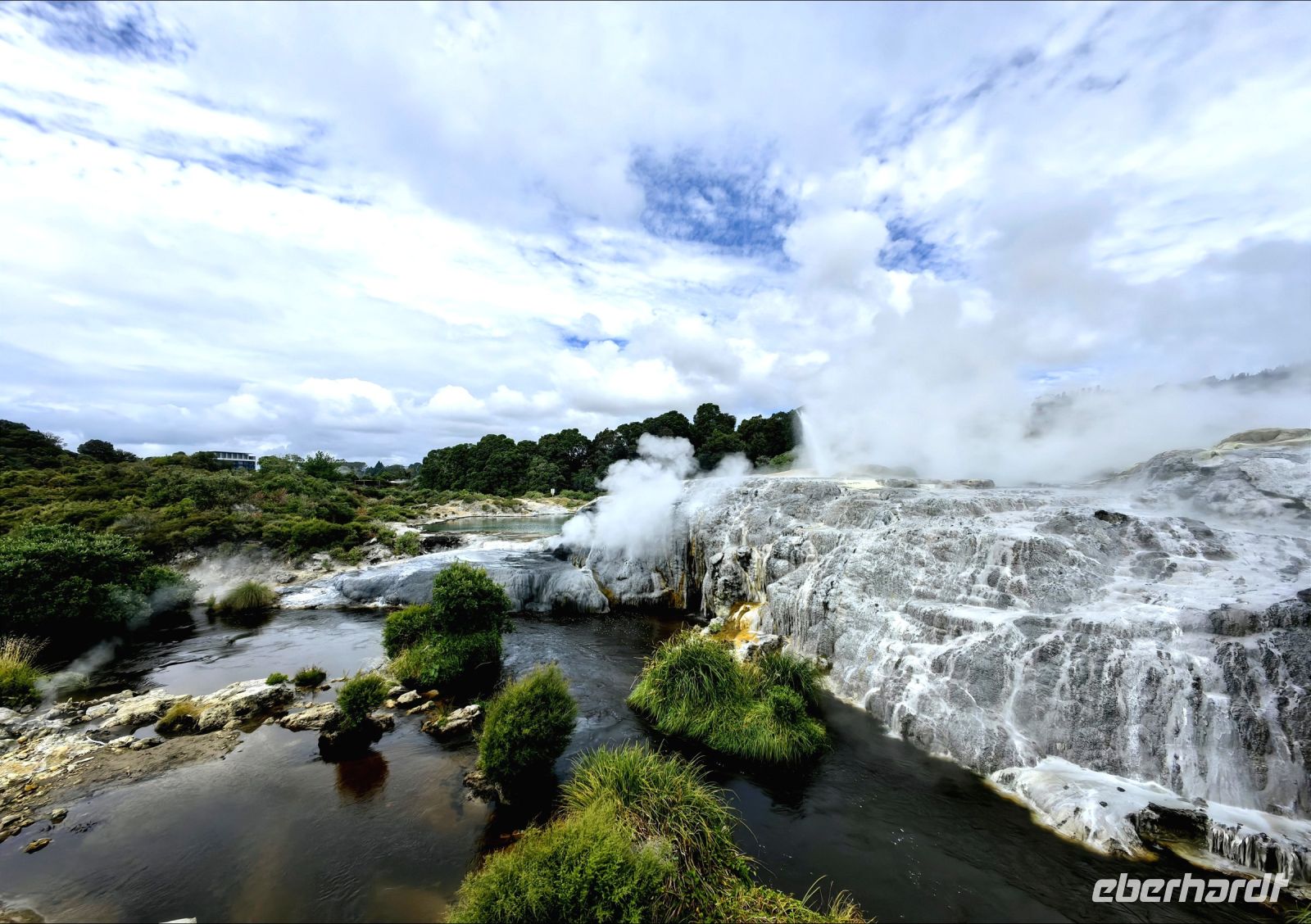 In Rotorua halten wir am Morgen noch einmal an den einstigen Kurthermalbädern, die von einem englischen sehr gepflegten Park umgeben sind, bevor wir uns auf den Weg zu den Wairakei-Terrassen machen. Bei Warakei handelt es sich um natürliche Geo-Thermalbäder am Lake Taupo, die Entspannung pur bieten. Die natürlichen Pools erinnern ein wenig an Pamukkale in der Türkei und wir hätten Lust auf ein warmes Bad. Allerdings nimmt uns Hohepa, ein Maoriältster, mit durch die Anlage und erzählt uns einige der Schöpfungsmythen der Maori. Das wollen wir natürlich nicht verpassen.